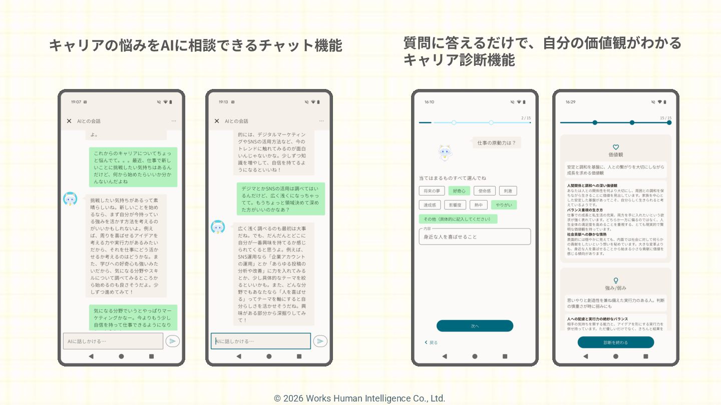 © 2026 Works Human Intelligence Co., Ltd. キャリアの悩みをAIに相談できるチャット機能 質問に答えるだけで、⾃分の価値観がわかる キャリア診断機能