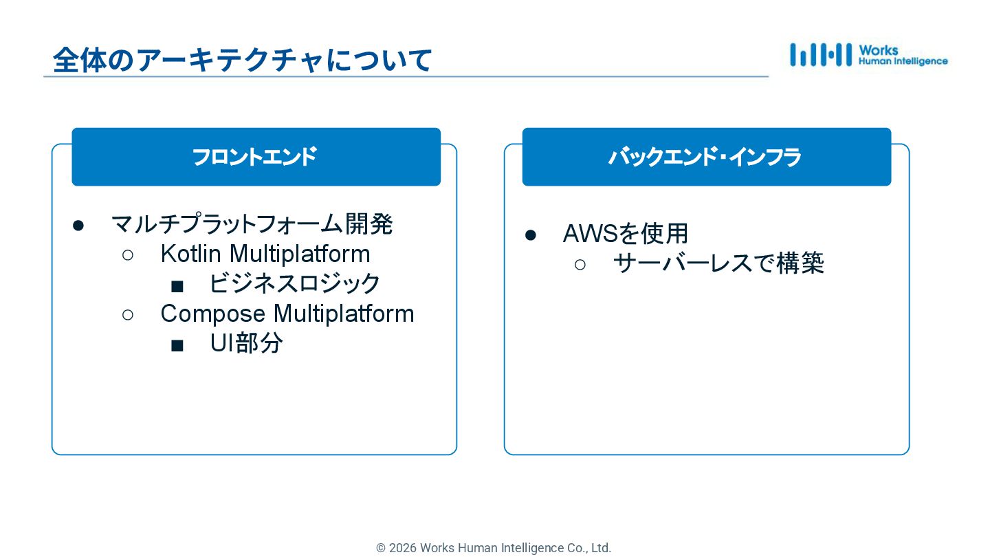 © 2026 Works Human Intelligence Co., Ltd. 全体のアーキテクチャについて フロントエンド •