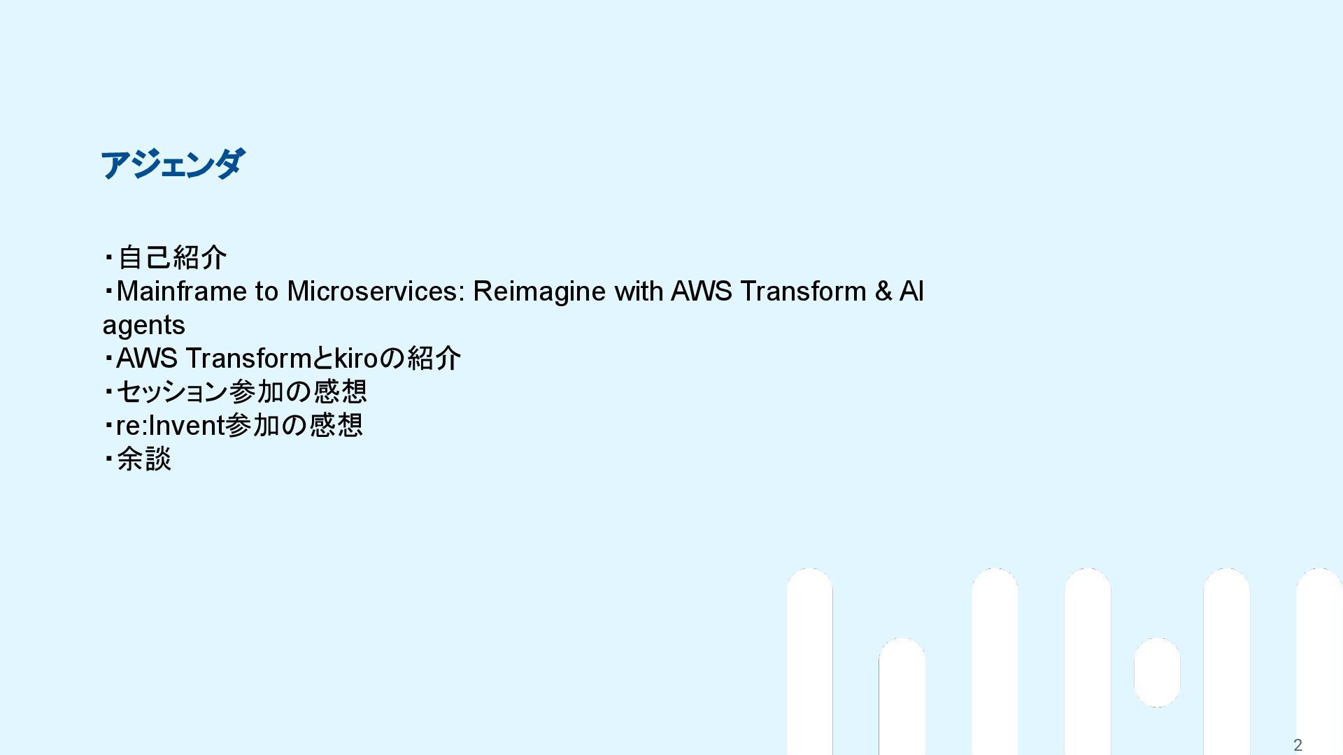 ・Mainframe to Microservices: Reimagine with AWS Transform & AI agents ・AWS Transformとkiroの紹介 ・セッション参加の感想 ・re:Invent参加の感想 ・余談