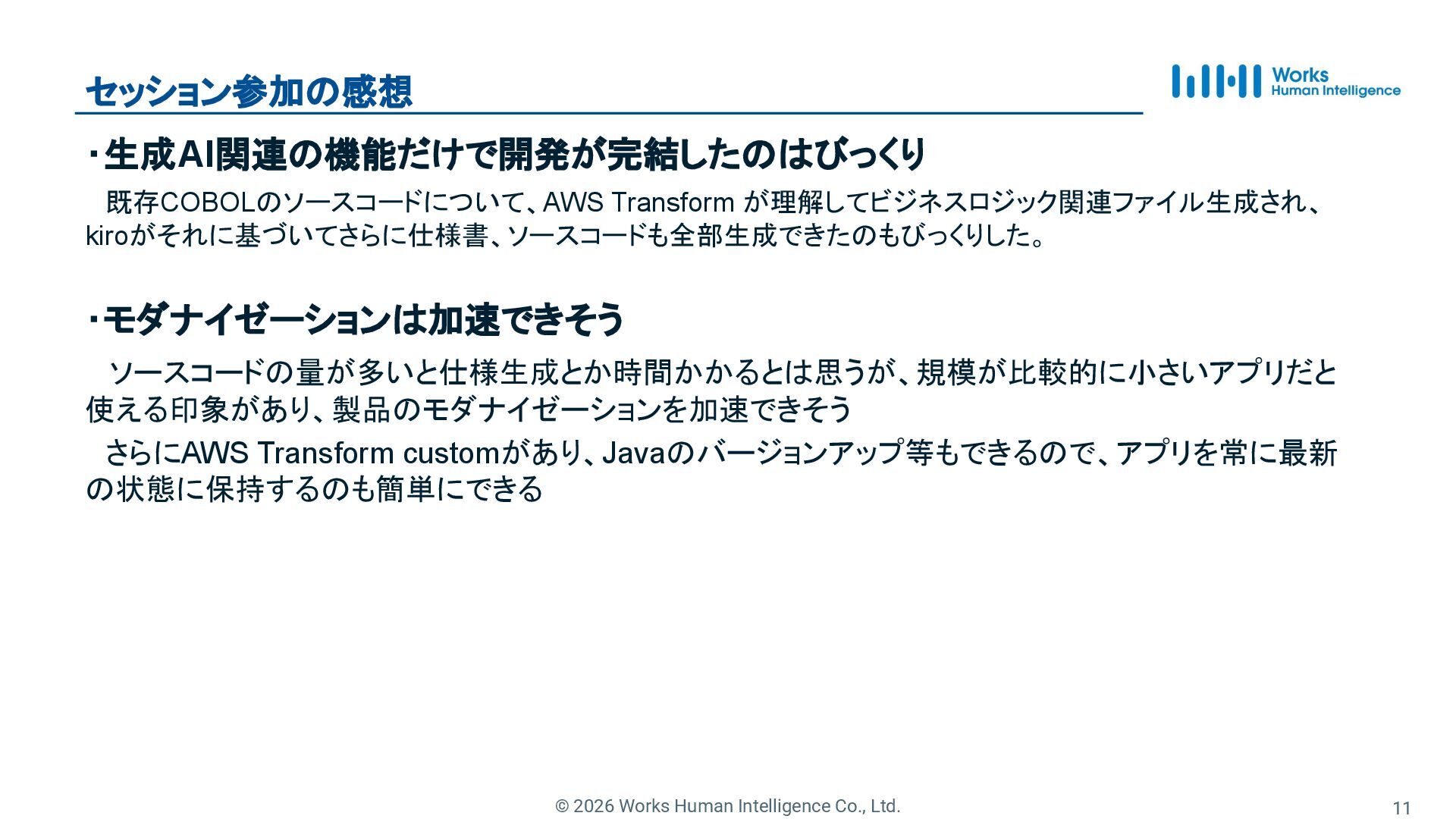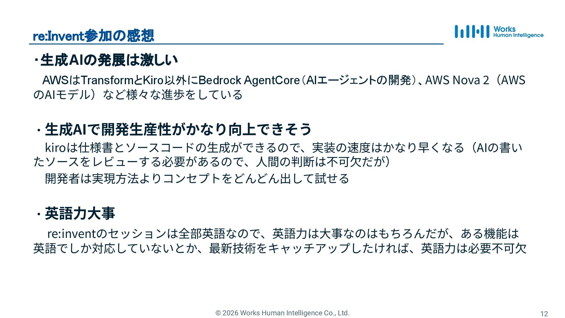 11. © 2026 Works Human Intelligence Co., Ltd. re:Invent参加の感想