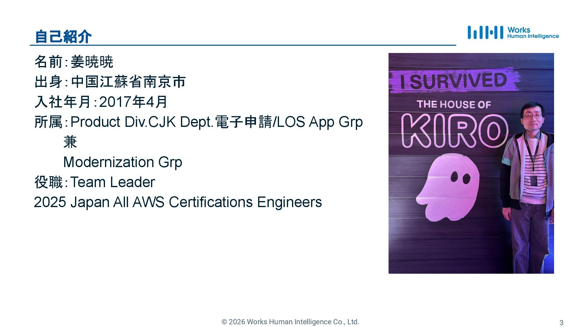2. © 2026 Works Human Intelligence Co., Ltd. 名前:姜暁暁 出身:中国江蘇省南京市 入社年月:2017年4月