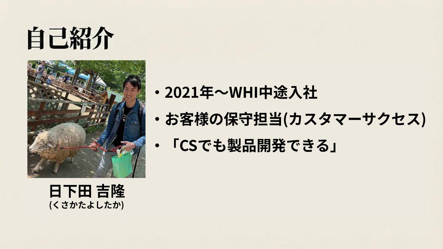 ⽇下⽥ 吉隆 (くさかたよしたか) ‧2021年〜WHI中途⼊社 ‧お客様の保守担当(カスタマーサクセス) ‧「CSでも製品開発できる」