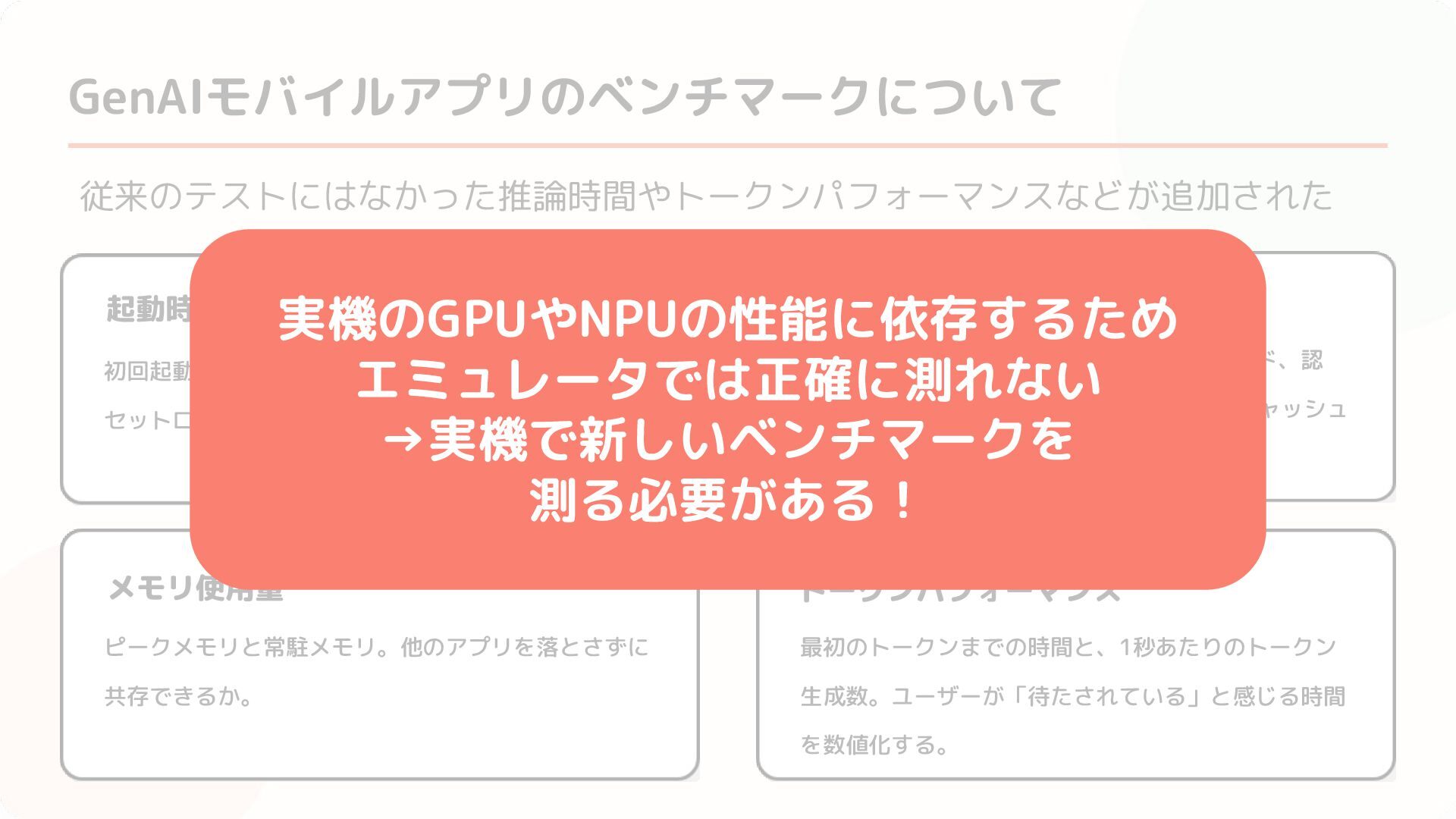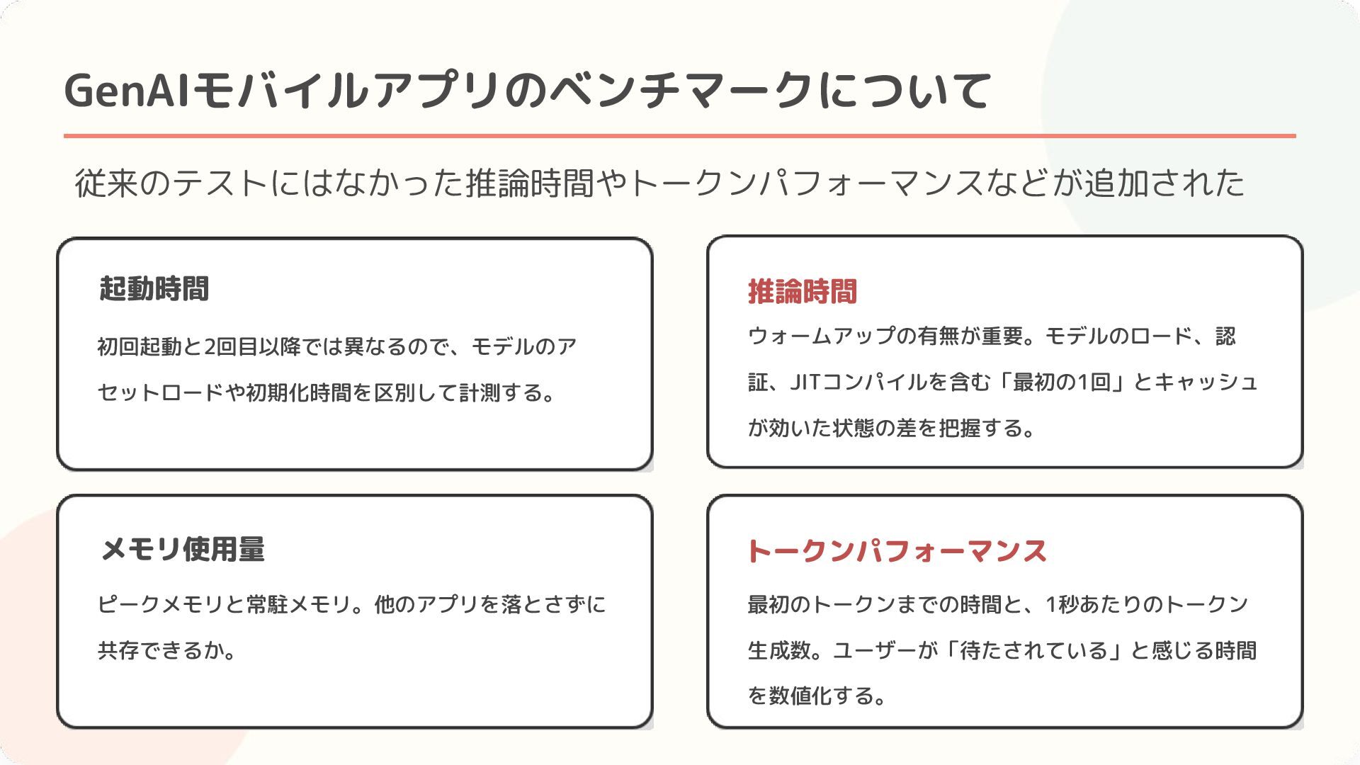 ピークメモリと常駐メモリ。他のアプリを落とさずに 共存できるか。 トークンパフォーマンス 最初のトークンまでの時間と、1秒あたりのトークン 生成数。ユーザーが「待たされている」と感じる時間 を数値化する。 実機のGPUやNPUの性能に依存するため エミュレータでは正確に測れない →実機で新しいベンチマークを 測る必要がある!