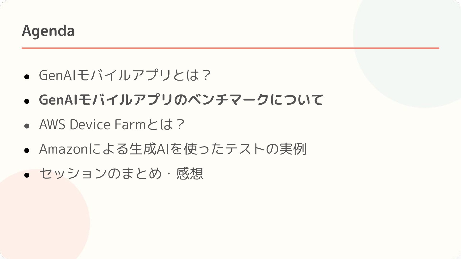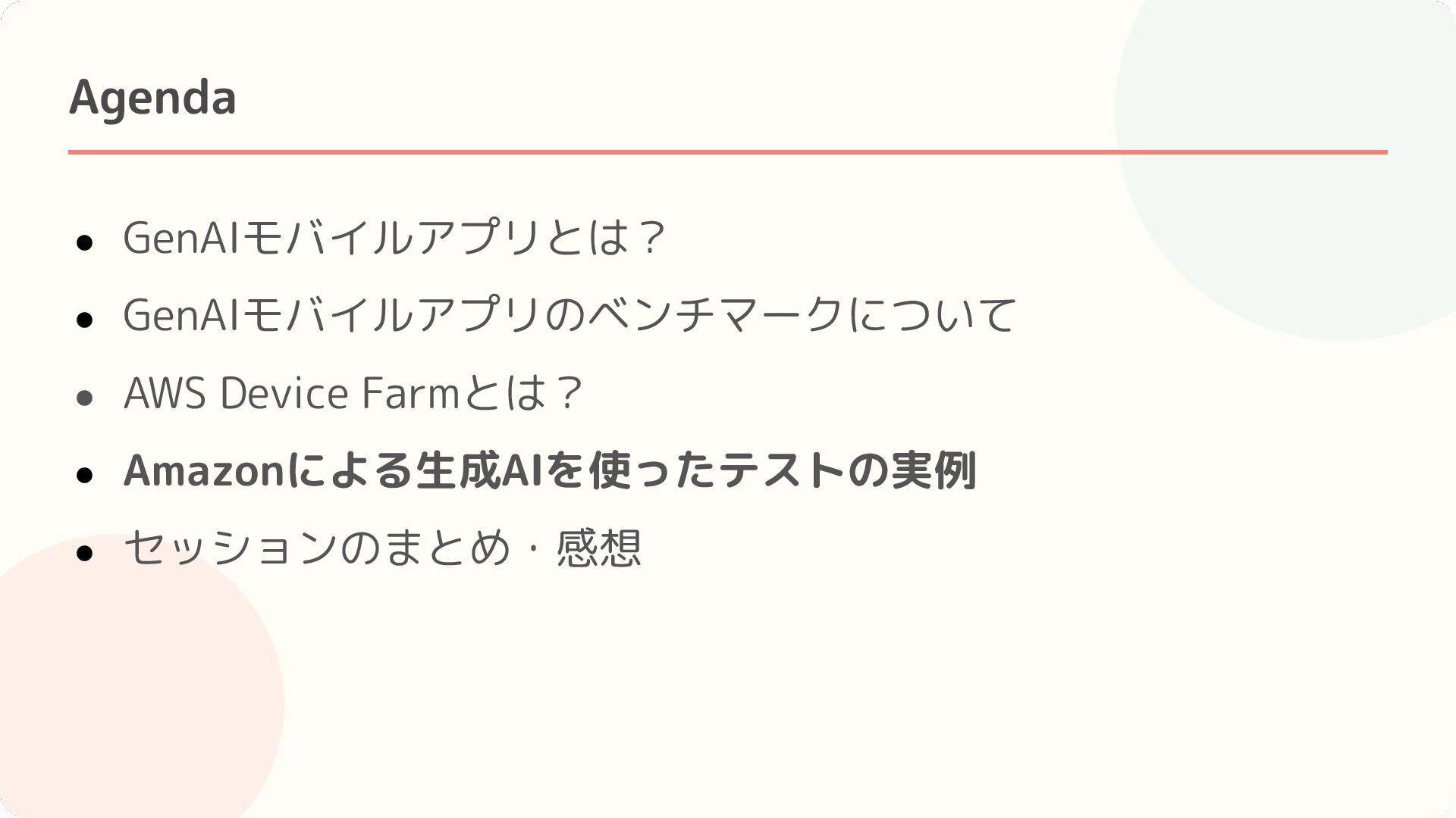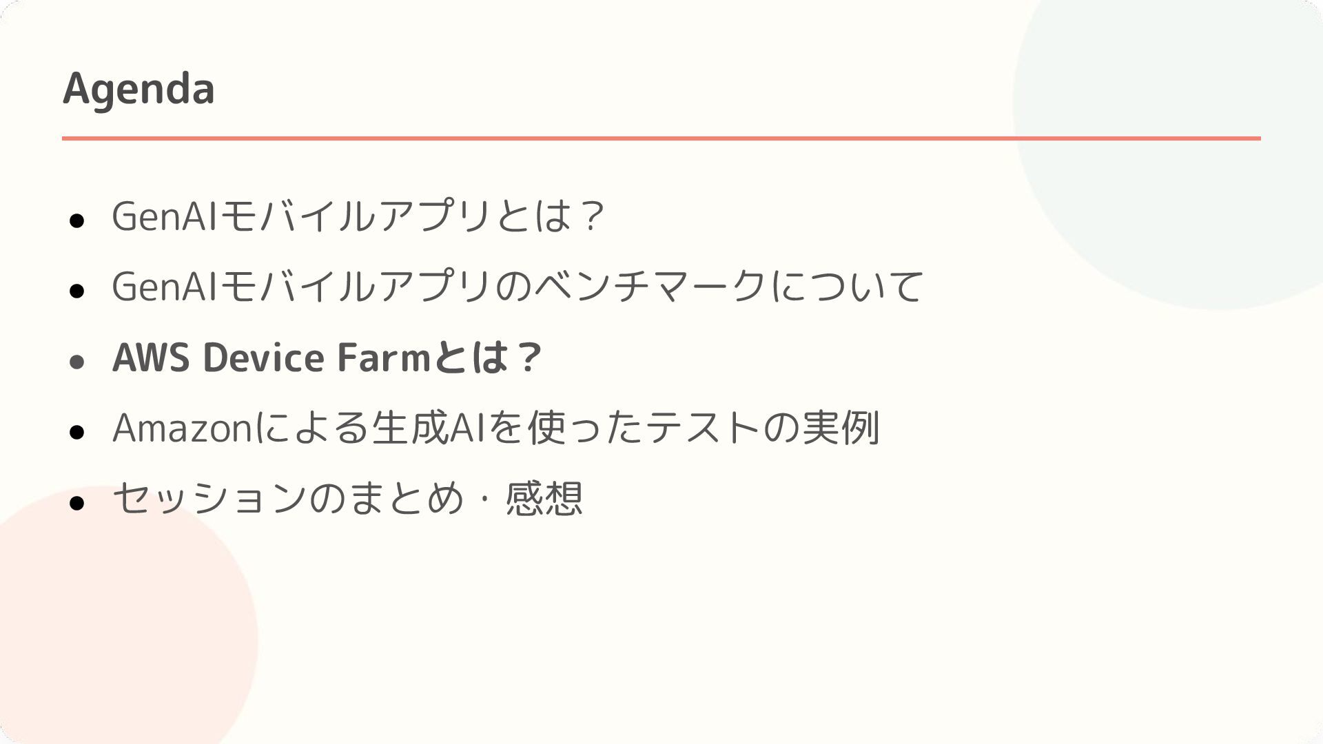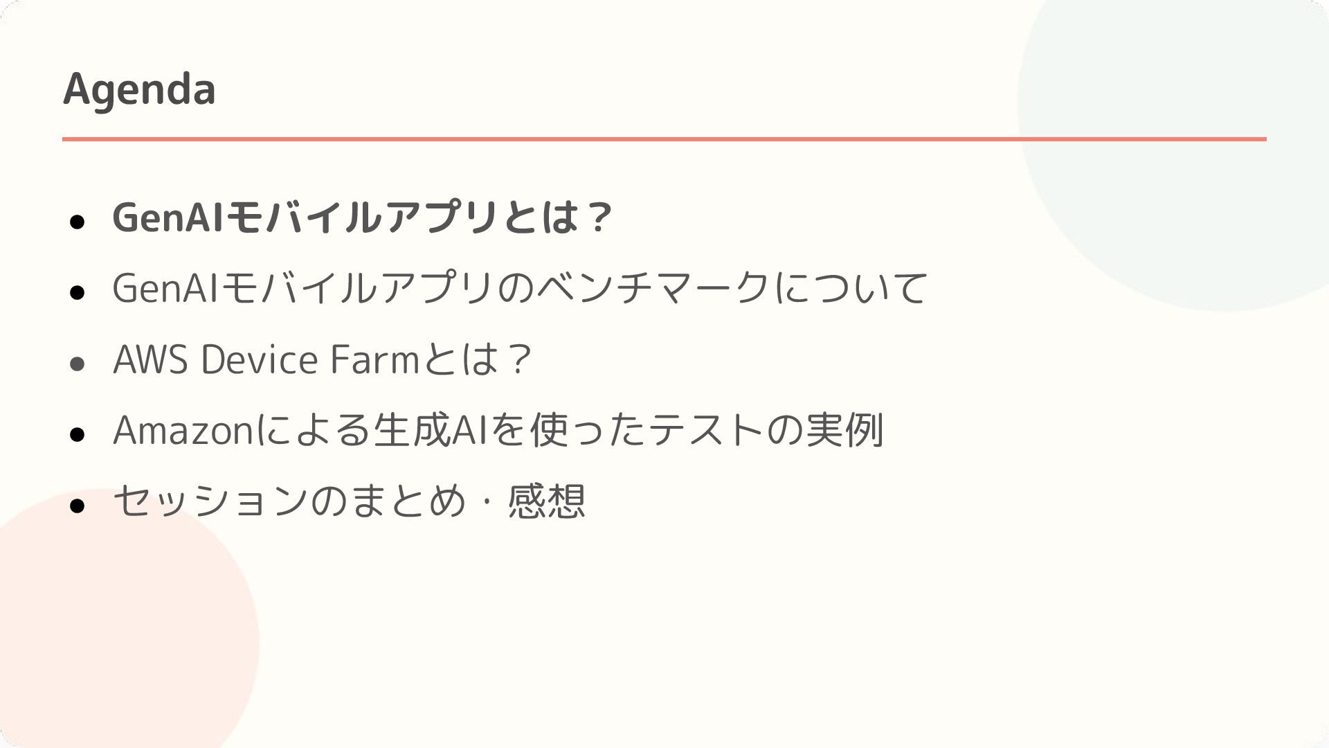 4. Agenda • GenAIモバイルアプリとは? • GenAIモバイルアプリのベンチマークについて • AWS Device Farmとは? •