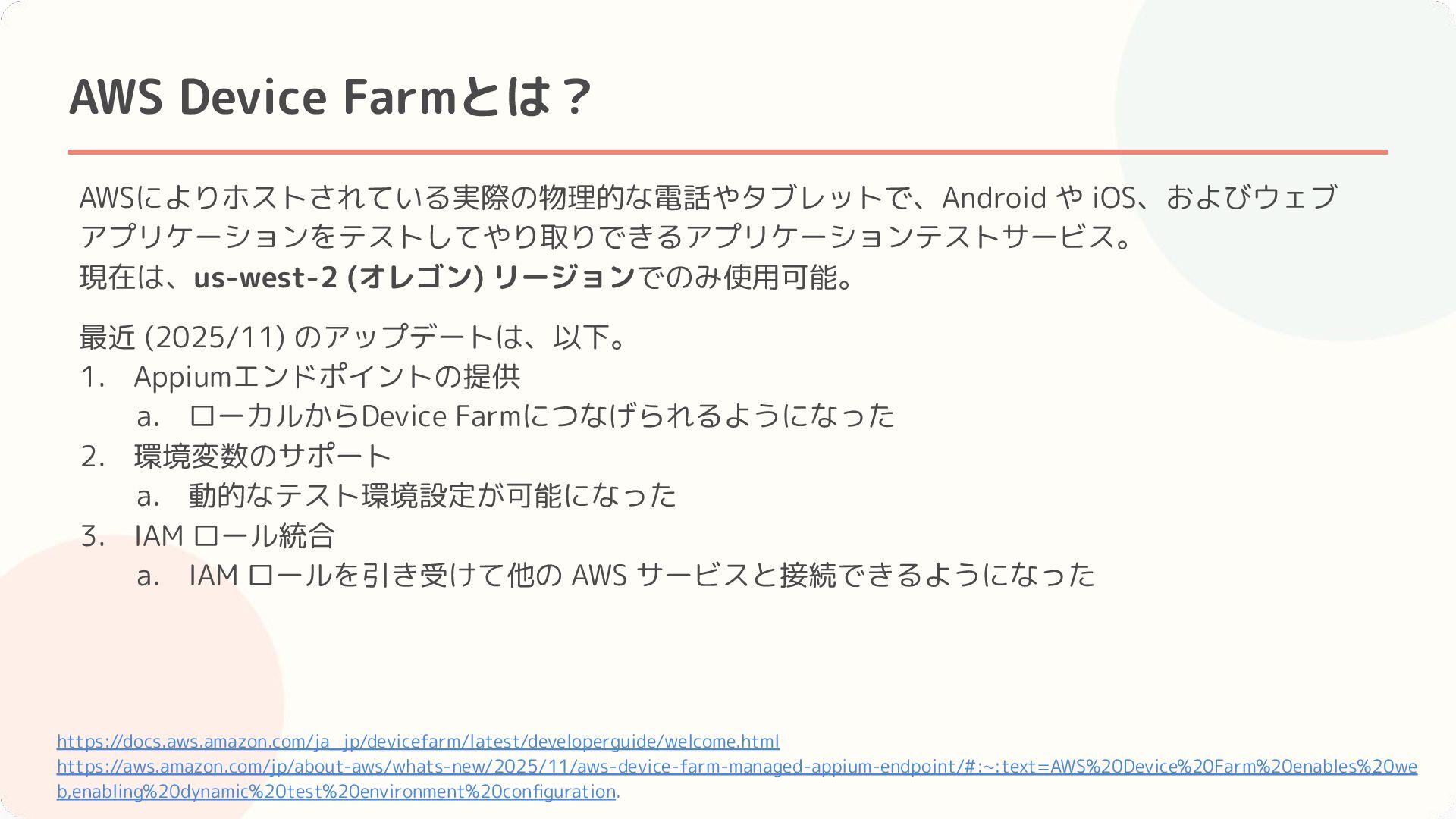 最近 (2025/11) のアップデートは、以下。 1. Appiumエンドポイントの提供 a. ローカルからDevice Farmにつなげられるようになった 2. 環境変数のサポート a. 動的なテスト環境設定が可能になった 3. IAM ロール統合 a. IAM ロールを引き受けて他の AWS サービスと接続できるようになった https://docs.aws.amazon.com/ja_jp/devicefarm/latest/developerguide/welcome.html https://aws.amazon.com/jp/about-aws/whats-new/2025/11/aws-device-farm-managed-appium-endpoint/#:~:text=AWS%20Device%20Farm%20enables%20we b,enabling%20dynamic%20test%20environment%20configuration.