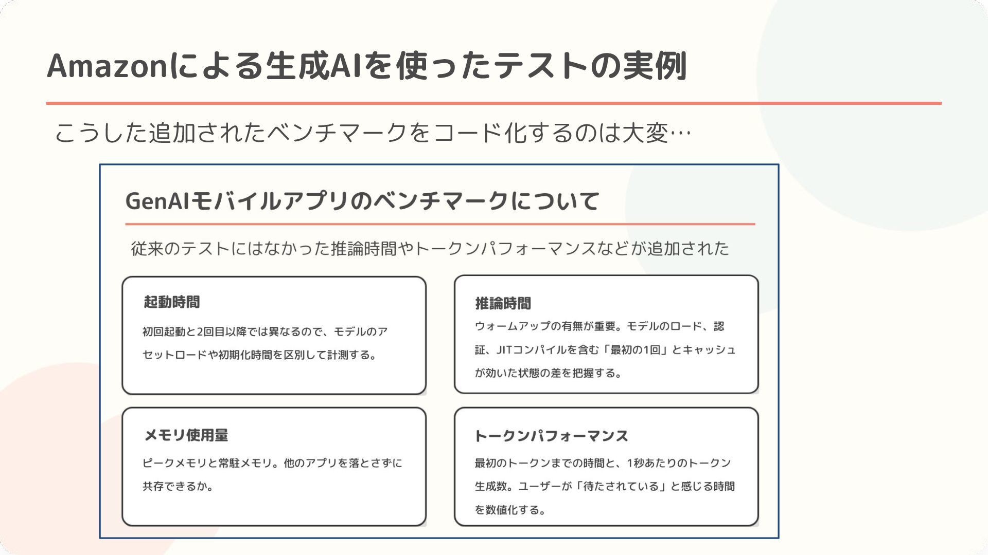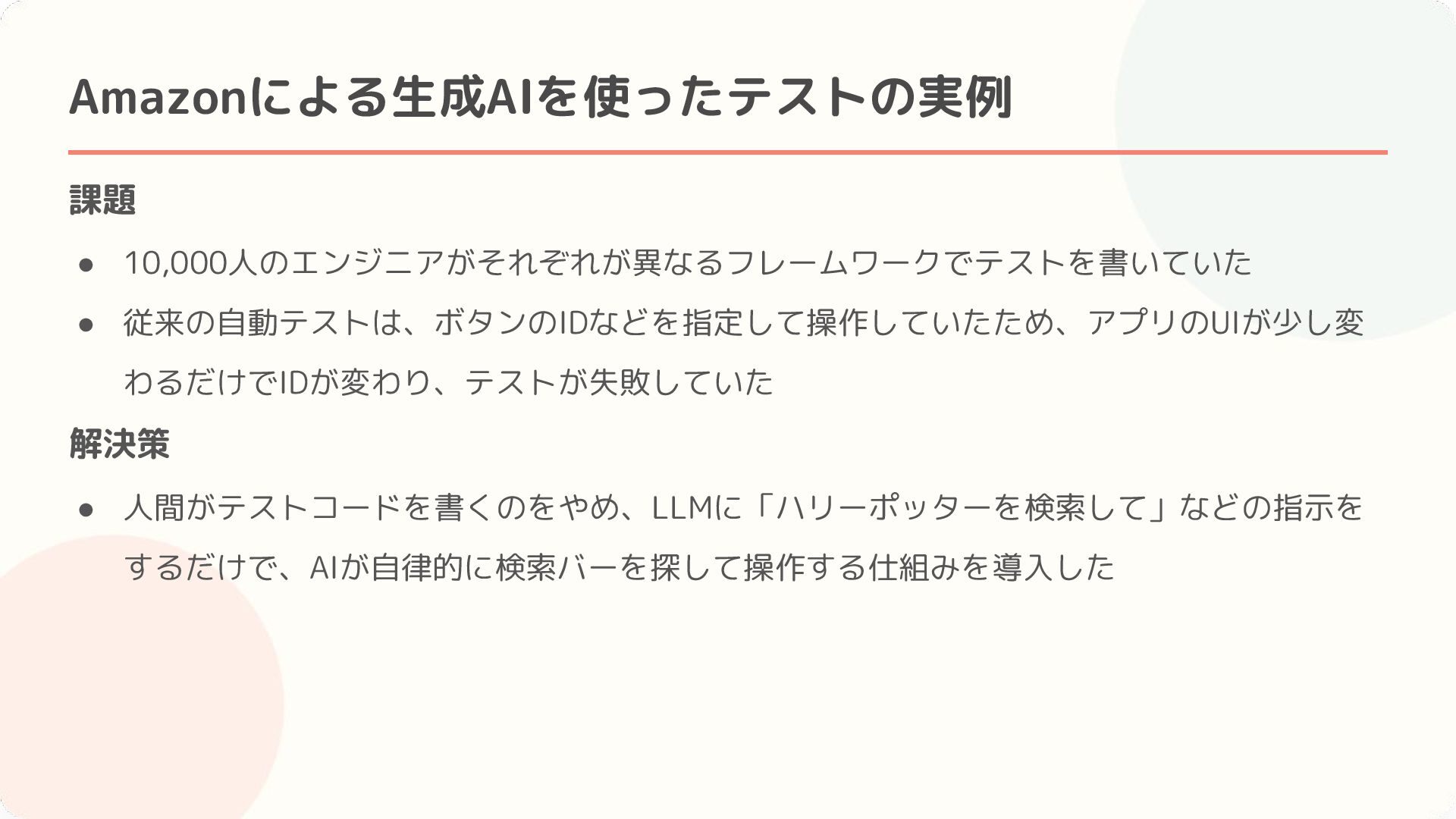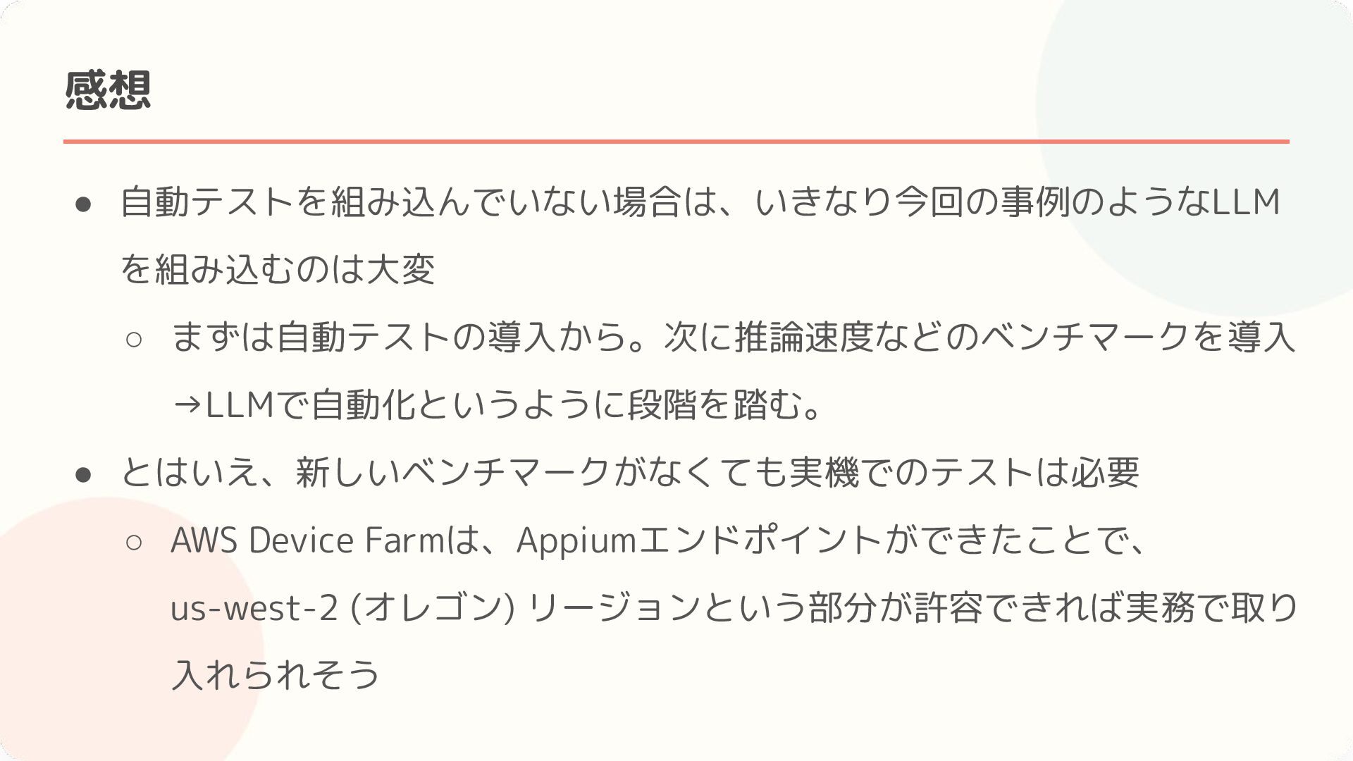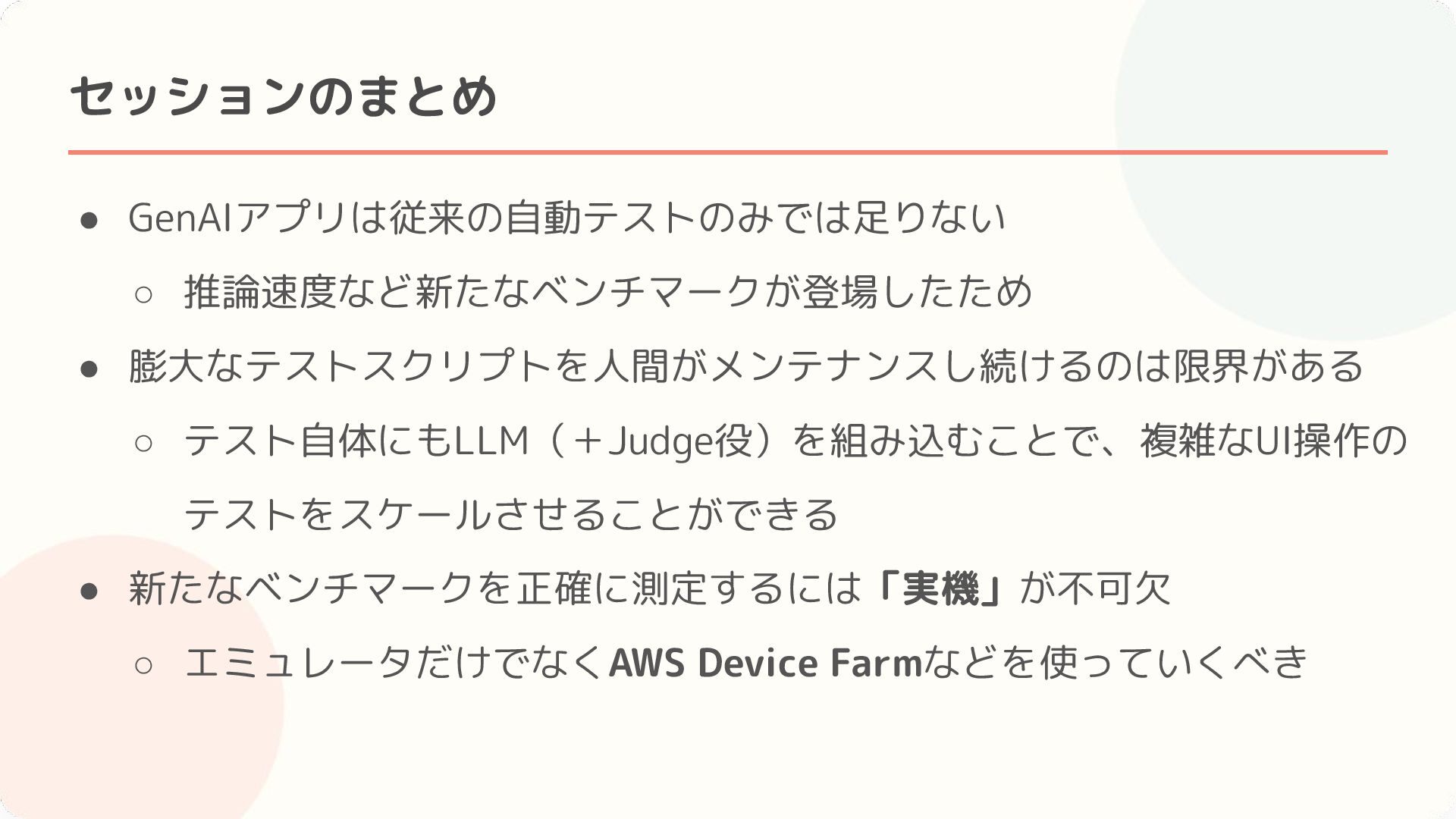 Amazonによる生成AIを使ったテストの実例 • セッションのまとめ・感想