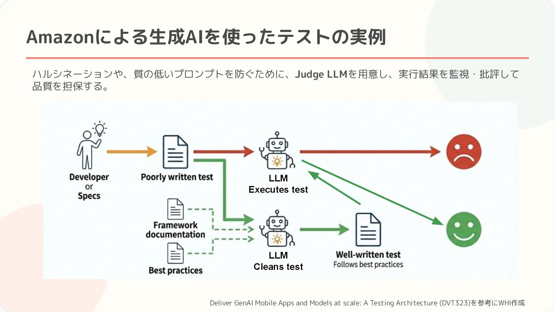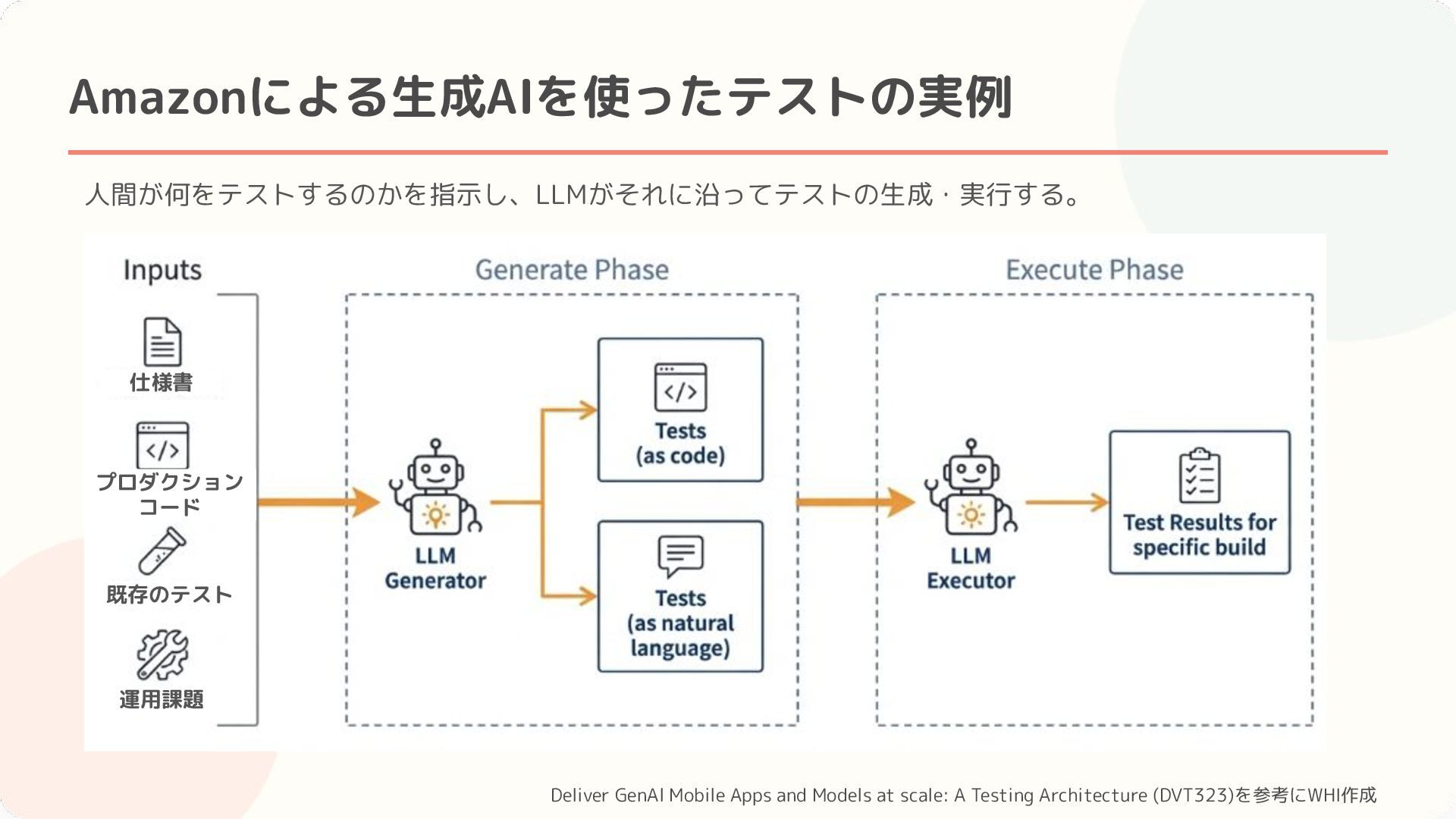 at scale: A Testing Architecture (DVT323)を参考にWHI作成 LLM Cleans test LLM Executes test Amazonストアはテスト作成時間を90%削減 & テストの不安定さを50%削減した!