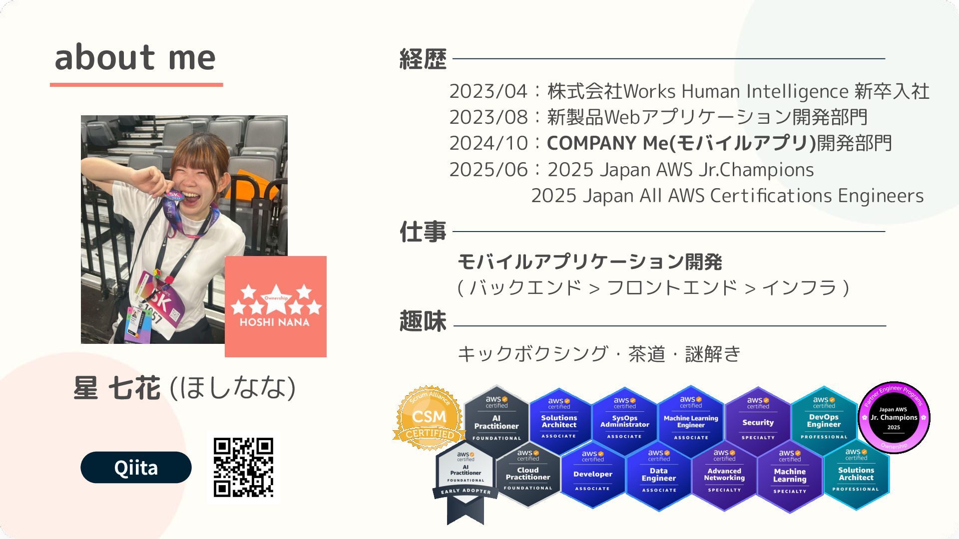 フロントエンド > インフラ ) 2023/04:株式会社Works Human Intelligence 新卒入社 2023/08:新製品Webアプリケーション開発部門 2024/10:COMPANY Me(モバイルアプリ)開発部門 2025/06:2025 Japan AWS Jr.Champions 2025 Japan All AWS Certifications Engineers about me キックボクシング・茶道・謎解き 趣味