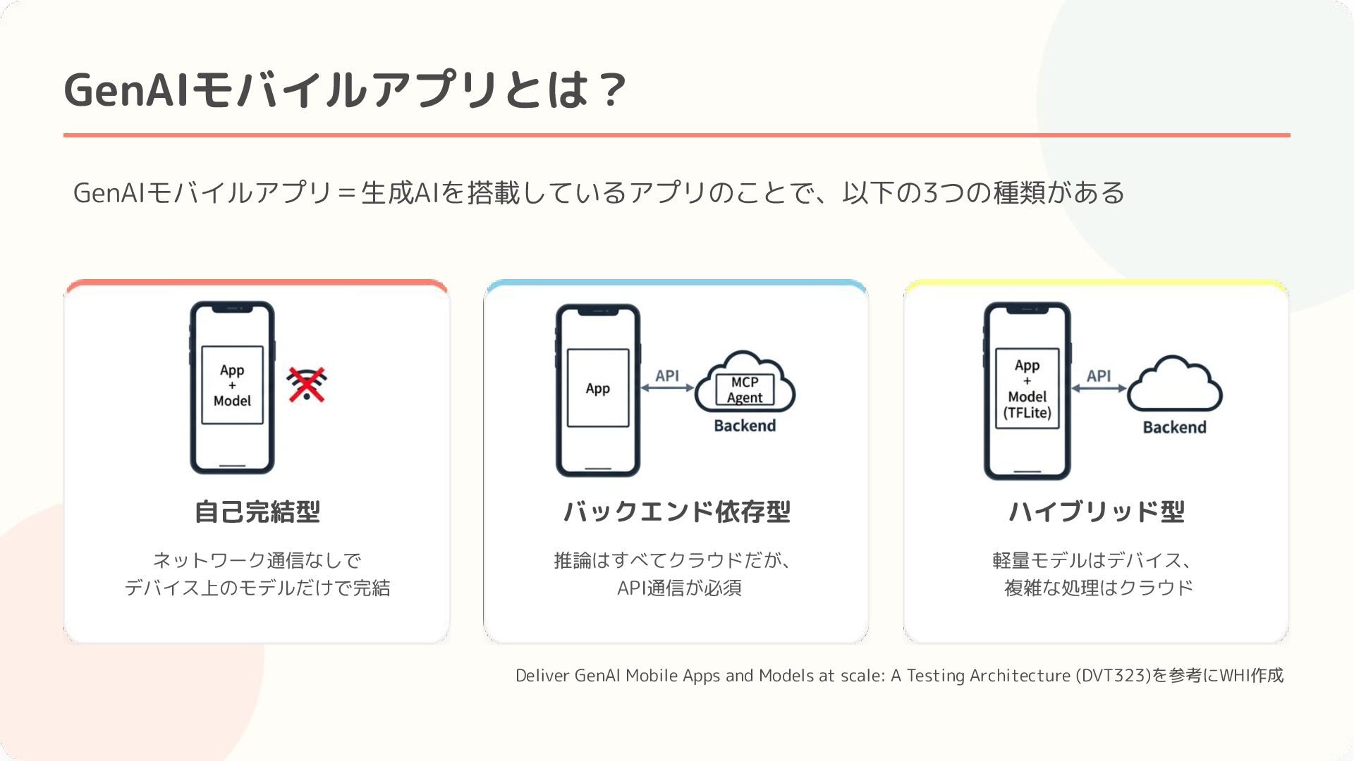 Architecture (DVT323)を参考にWHI作成 自己完結型 バックエンド依存型 ネットワーク通信なしで デバイス上のモデルだけで完結 推論はすべてクラウドだが、 API通信が必須 ハイブリッド型 軽量モデルはデバイス、 複雑な処理はクラウド GenAIモバイルアプリとは? GenAIモバイルアプリ=生成AIを搭載しているアプリのことで、以下の3つの種類がある GenAIモバイルアプリは、 従来の自動テストだけでは不十分