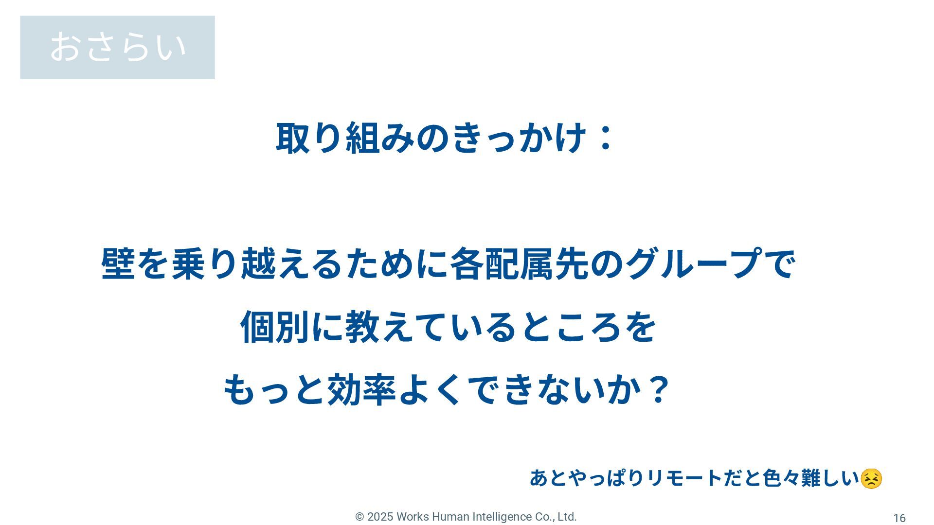 © 2025 Works Human Intelligence Co., Ltd. 16 取り組みのきっかけ: 壁を乗り越えるために各配属先のグループで
