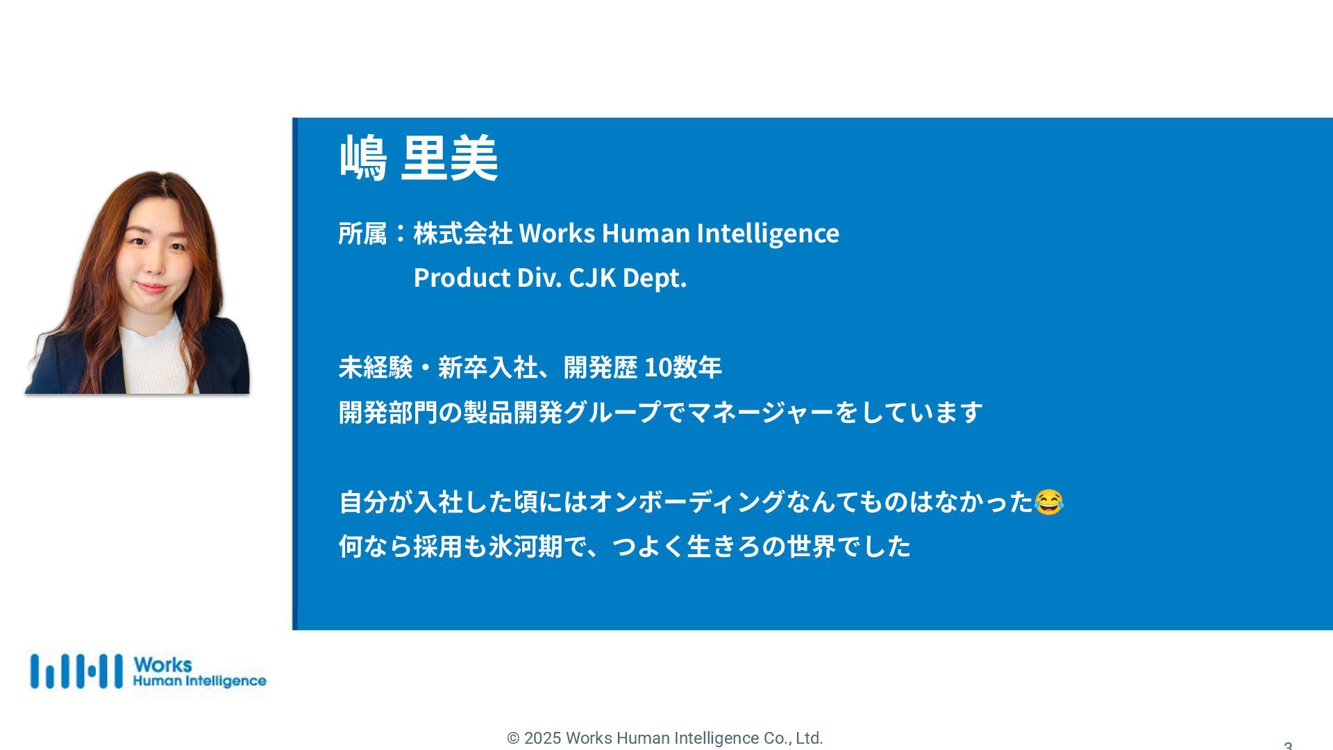 Works Human Intelligence Product Div. CJK Dept. 未経験‧新卒⼊社、開発歴 10数年 開発部⾨の製品開発グループでマネージャーをしています ⾃分が⼊社した頃にはオンボーディングなんてものはなかった😂 何なら採⽤も氷河期で、つよく⽣きろの世界でした