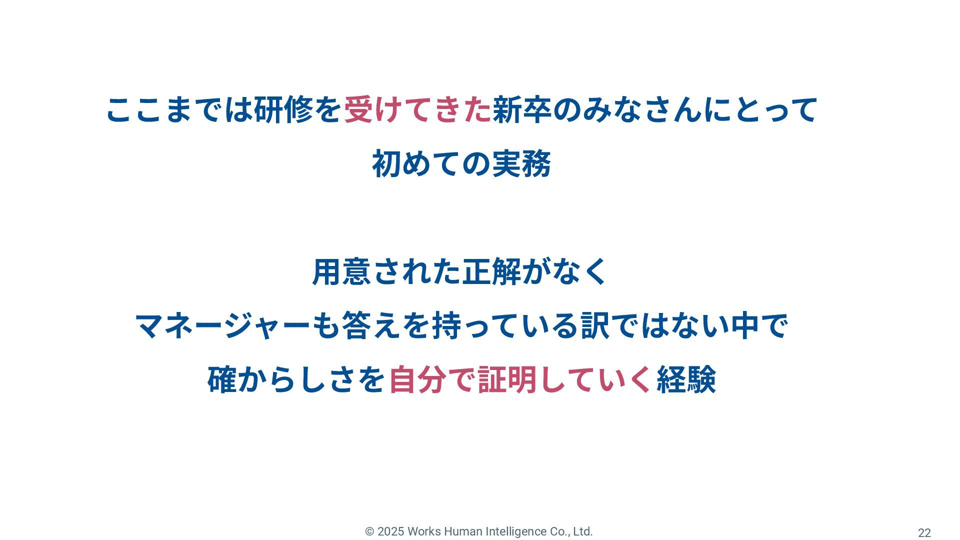 © 2025 Works Human Intelligence Co., Ltd. 22 ここまでは研修を受けてきた新卒のみなさんにとって 初めての実務