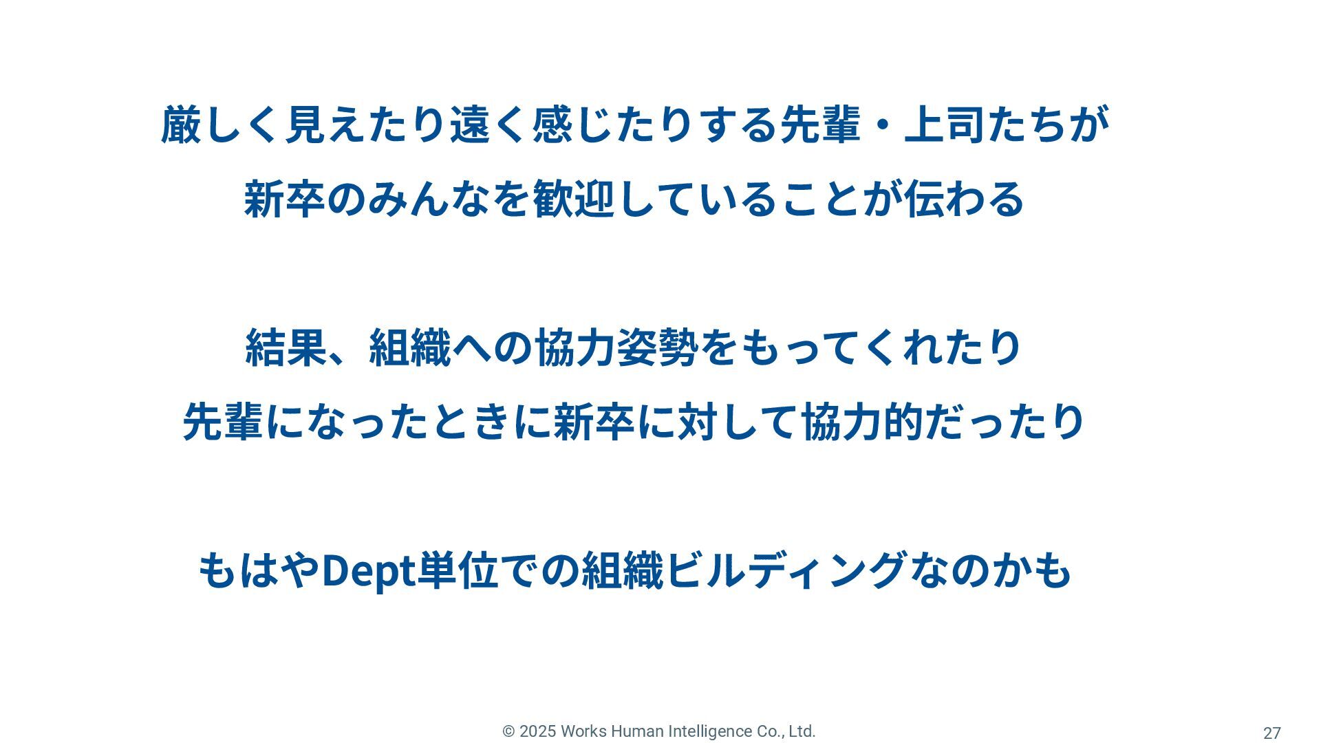 © 2025 Works Human Intelligence Co., Ltd. 27 厳しく⾒えたり遠く感じたりする先輩‧上司たちが 新卒のみんなを歓迎していることが伝わる