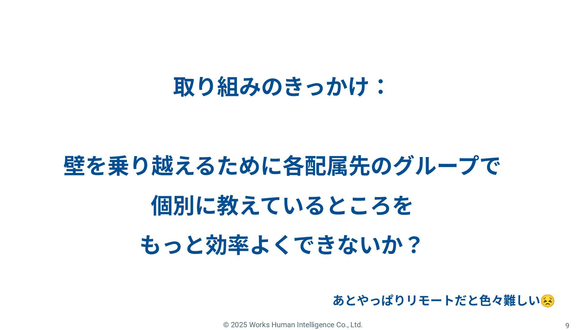 © 2025 Works Human Intelligence Co., Ltd. 9 取り組みのきっかけ: 壁を乗り越えるために各配属先のグループで