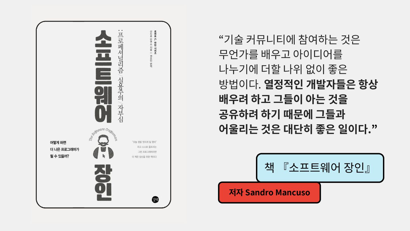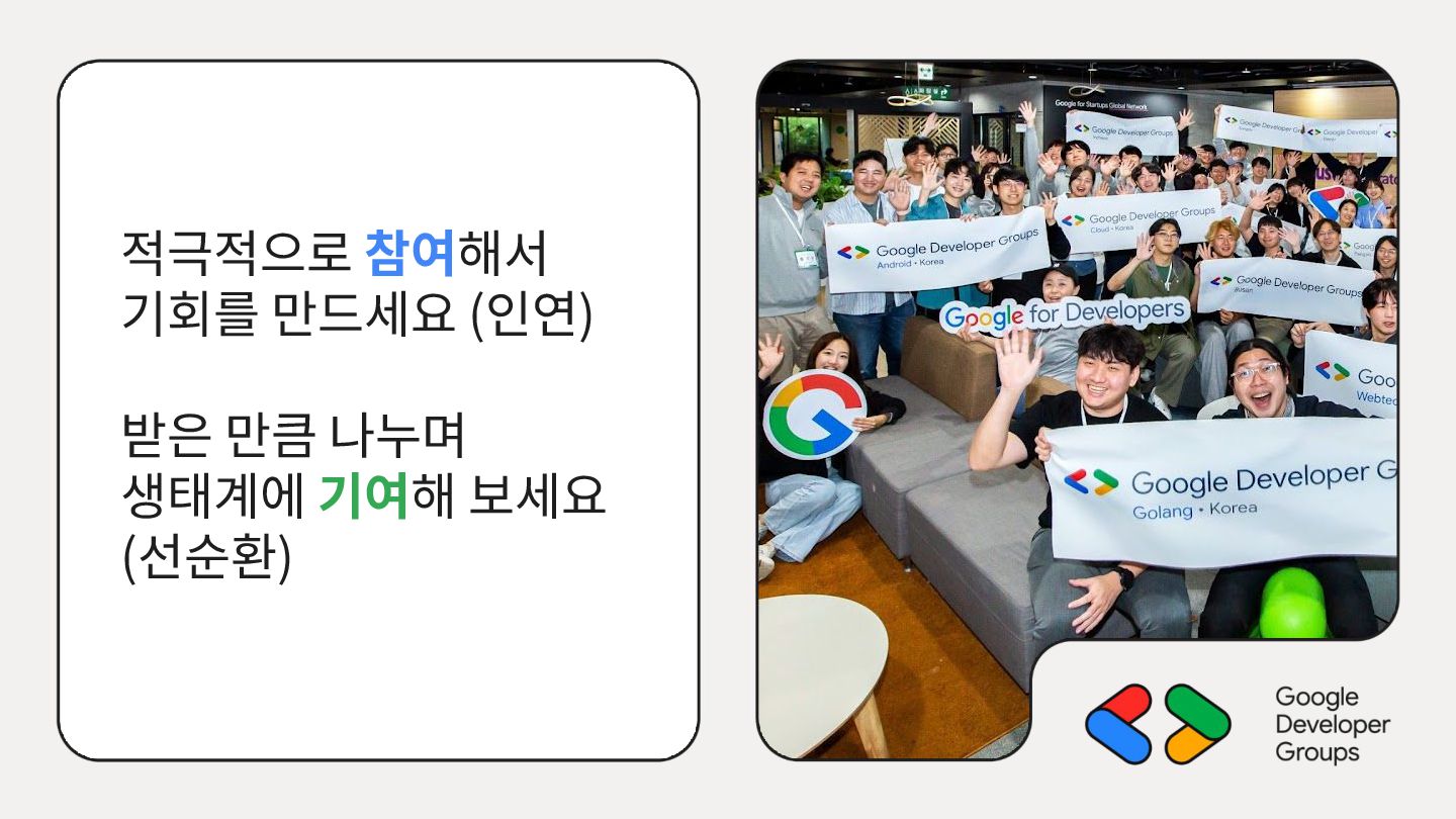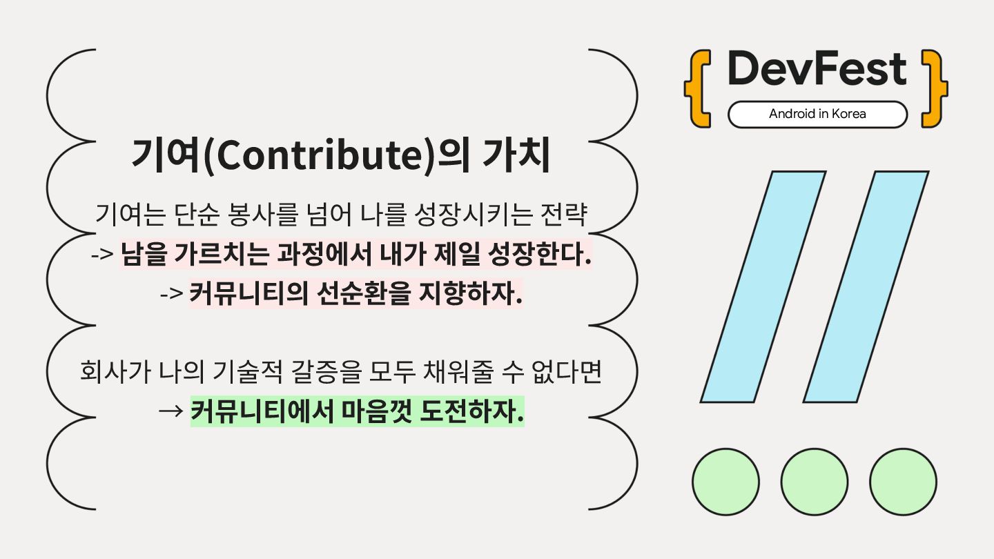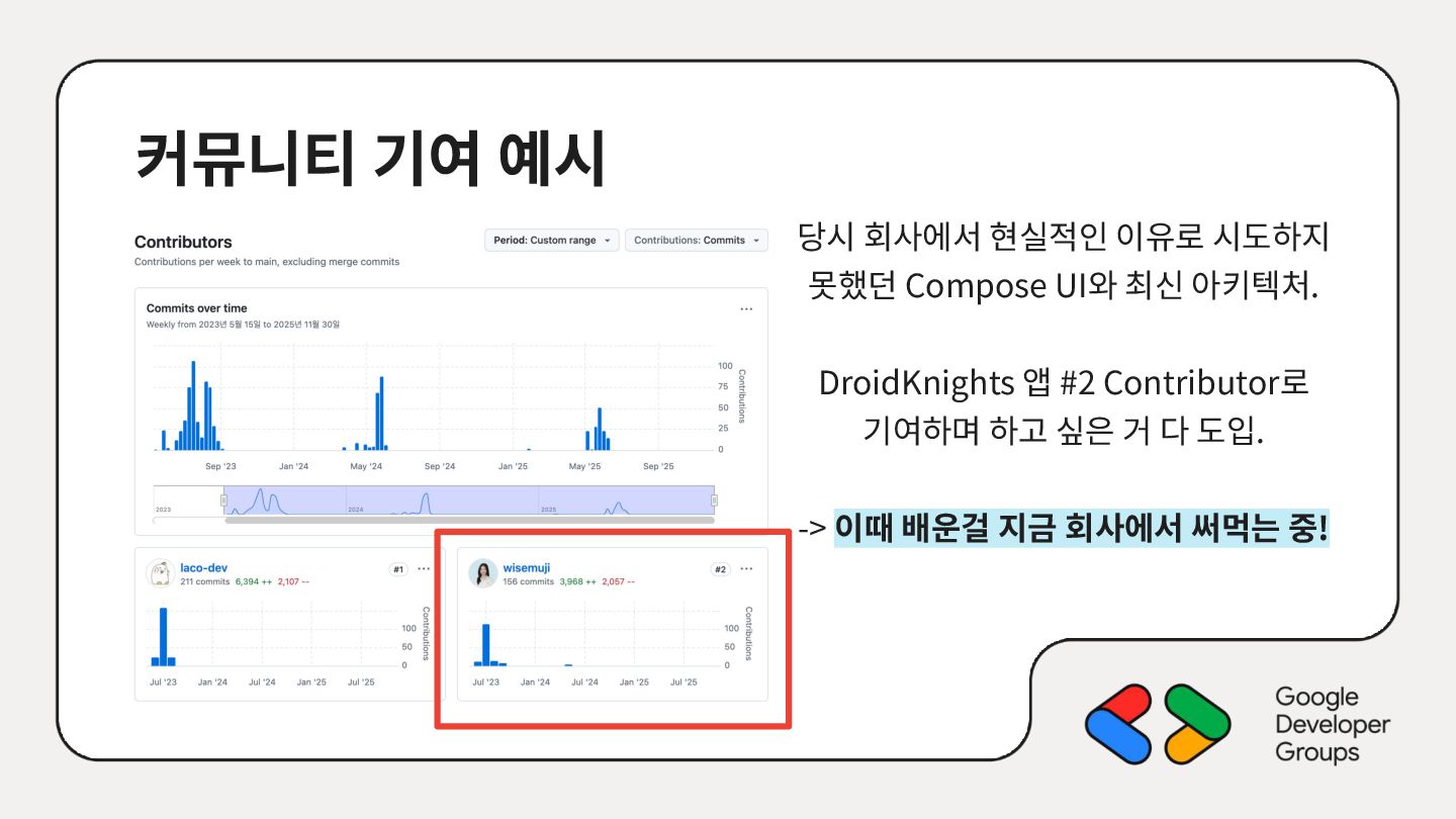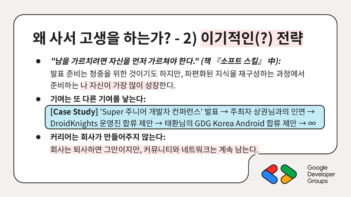 가르치려면 자신을 먼저 가르쳐야 한다." (책 『소프트 스킬』 中): 발표 준비는 청중을 위한 것이기도 하지만, 파편화된 지식을 재구성하는 과정에서 준비하는 나 자신이 가장 많이 성장한다. • 기여는 또 다른 기여를 낳는다: [Case Study] 'Super 주니어 개발자 컨퍼런스' 발표 → 주최자 상권님과의 인연 → DroidKnights 운영진 합류 제안 → 태환님의 GDG Korea Android 합류 제안 → ∞ • 커리어는 회사가 만들어주지 않는다: 회사는 퇴사하면 그만이지만, 커뮤니티와 네트워크는 계속 남는다.
