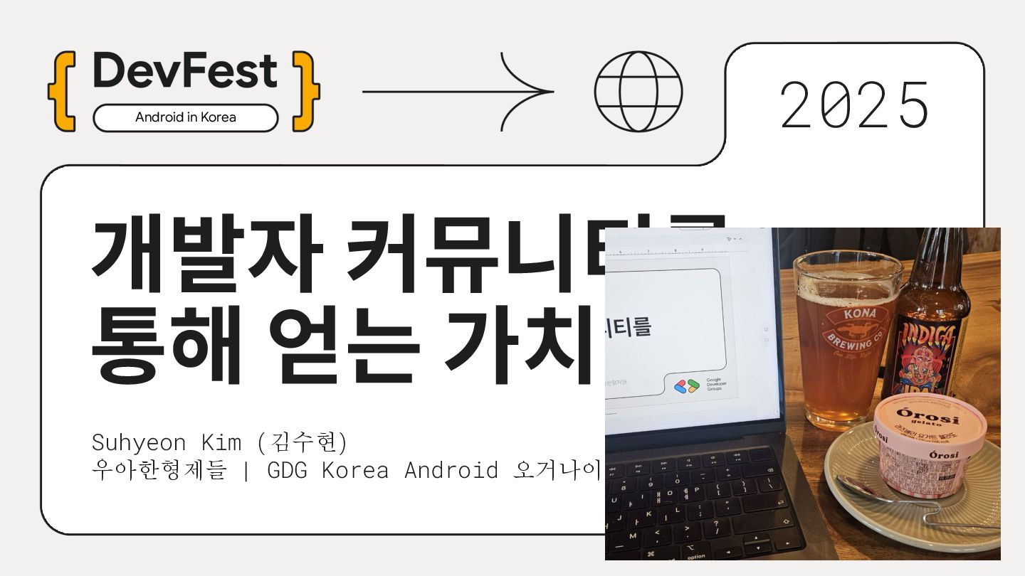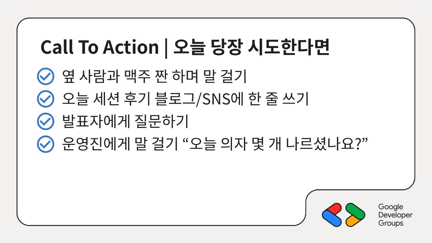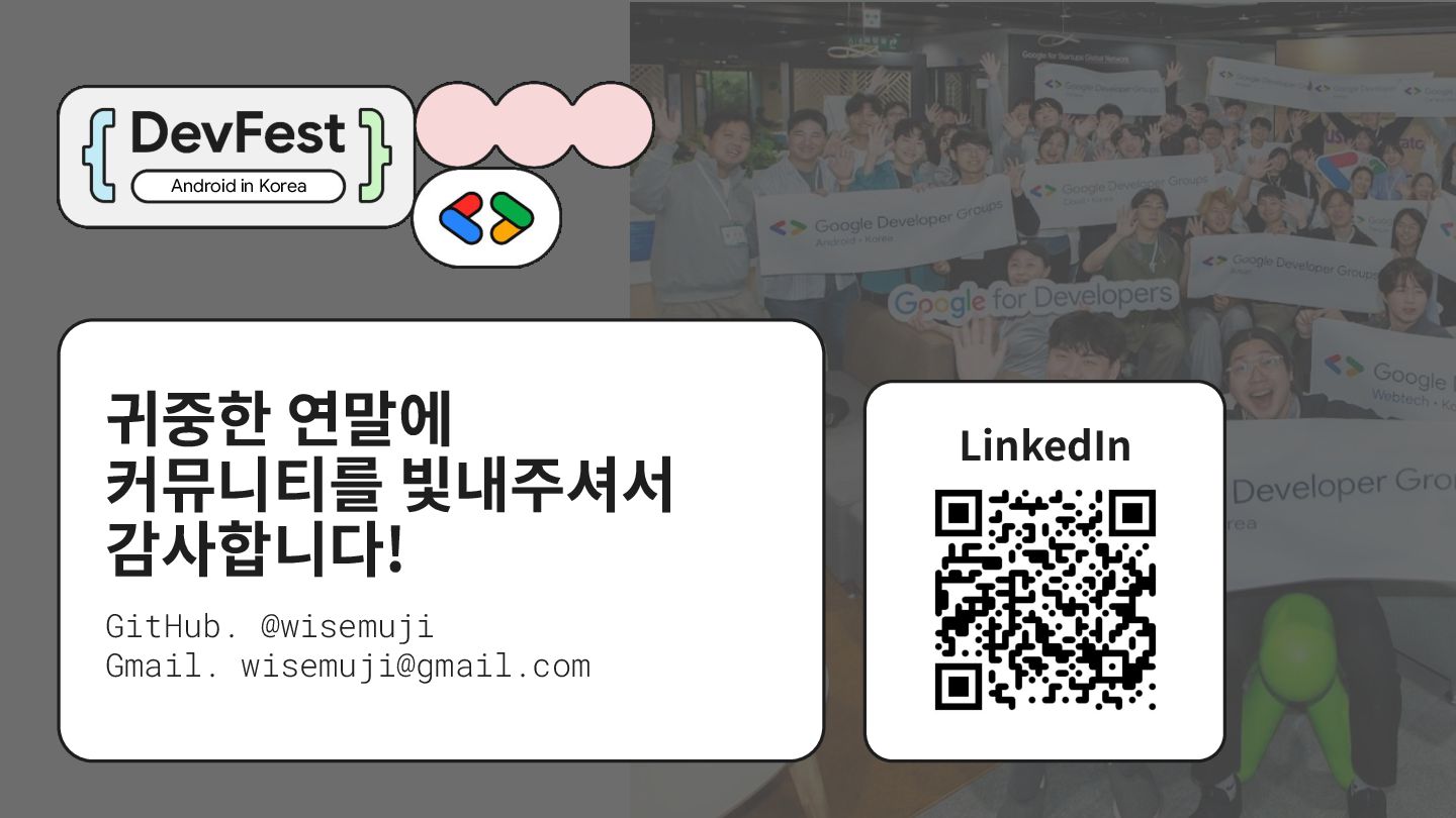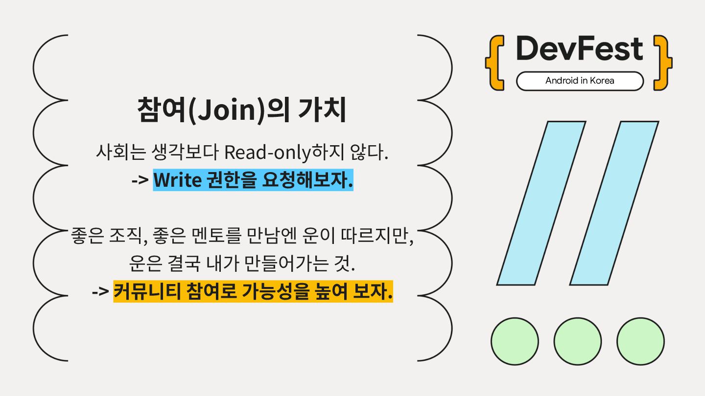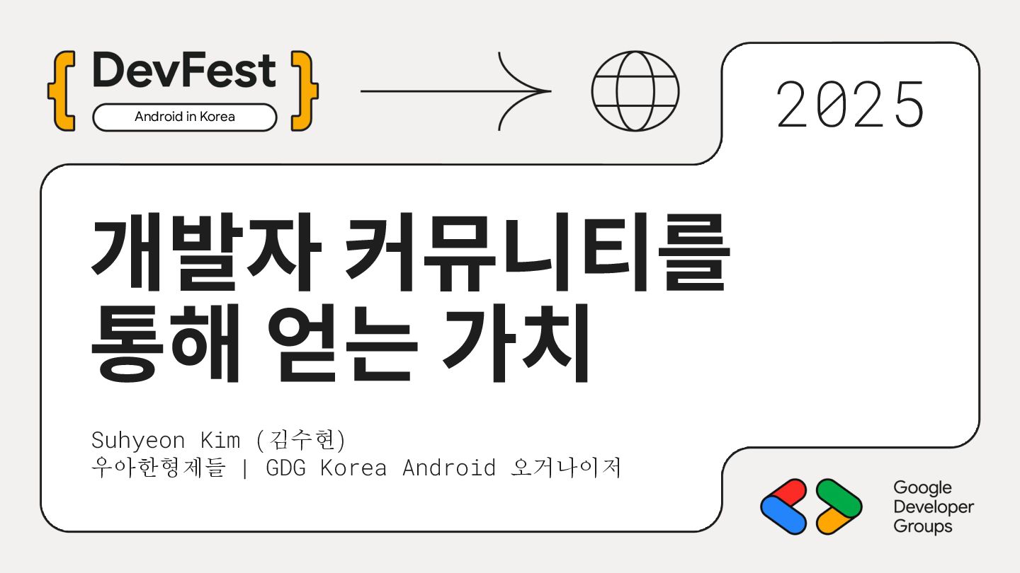 가르치려면 자신을 먼저 가르쳐야 한다." (책 『소프트 스킬』 中): 발표 준비는 청중을 위한 것이기도 하지만, 파편화된 지식을 재구성하는 과정에서 준비하는 나 자신이 가장 많이 성장한다. • 기여는 또 다른 기여를 낳는다: [Case Study] 'Super 주니어 개발자 컨퍼런스' 발표 → 주최자 상권님과의 인연 → DroidKnights 운영진 합류 제안 → 태환님의 GDG Korea Android 합류 제안 → ∞ • 커리어는 회사가 만들어주지 않는다: 회사는 퇴사하면 그만이지만, 커뮤니티와 네트워크는 계속 남는다.