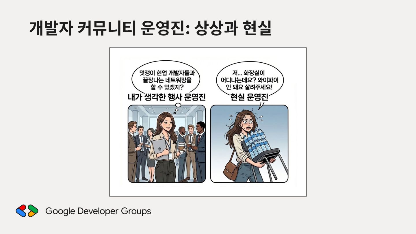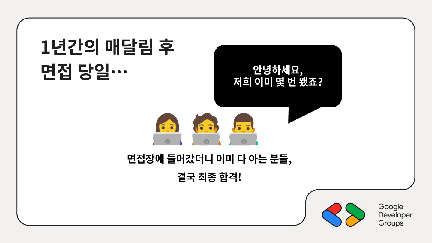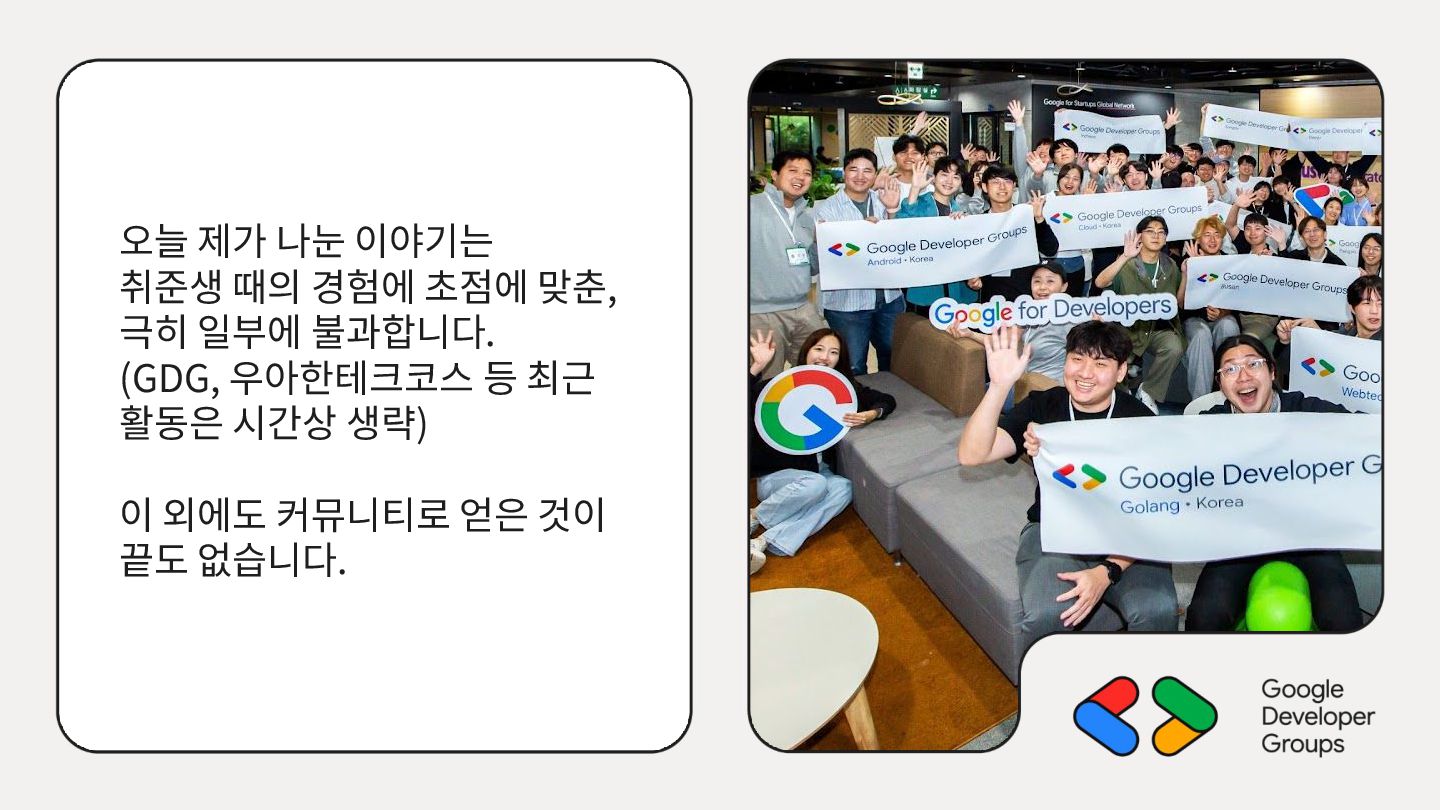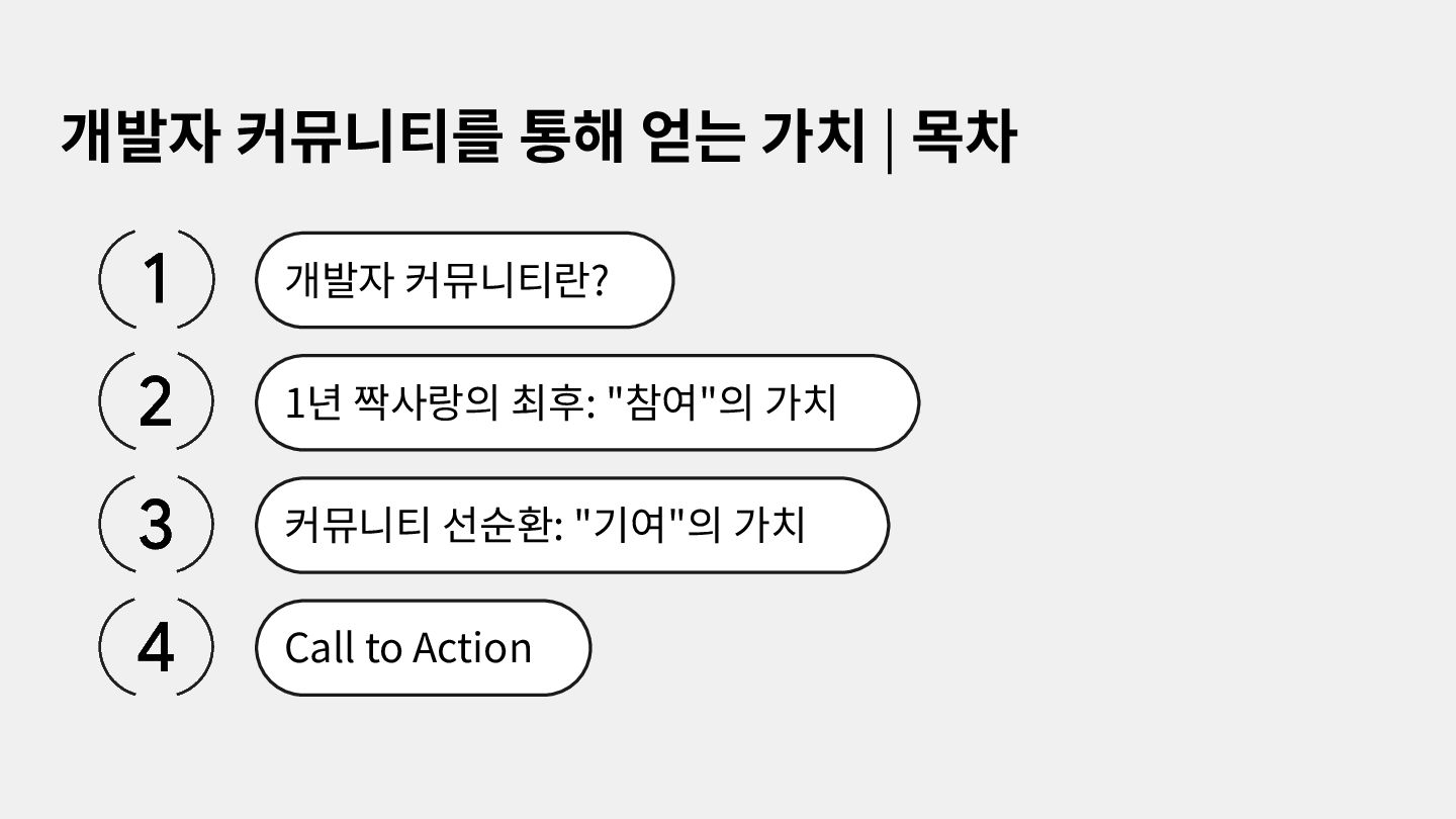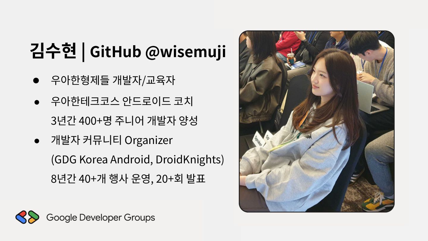 가르치려면 자신을 먼저 가르쳐야 한다." (책 『소프트 스킬』 中): 발표 준비는 청중을 위한 것이기도 하지만, 파편화된 지식을 재구성하는 과정에서 준비하는 나 자신이 가장 많이 성장한다. • 기여는 또 다른 기여를 낳는다: [Case Study] 'Super 주니어 개발자 컨퍼런스' 발표 → 주최자 상권님과의 인연 → DroidKnights 운영진 합류 제안 → 태환님의 GDG Korea Android 합류 제안 → ∞ • 커리어는 회사가 만들어주지 않는다: 회사는 퇴사하면 그만이지만, 커뮤니티와 네트워크는 계속 남는다.