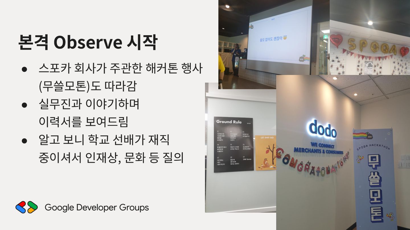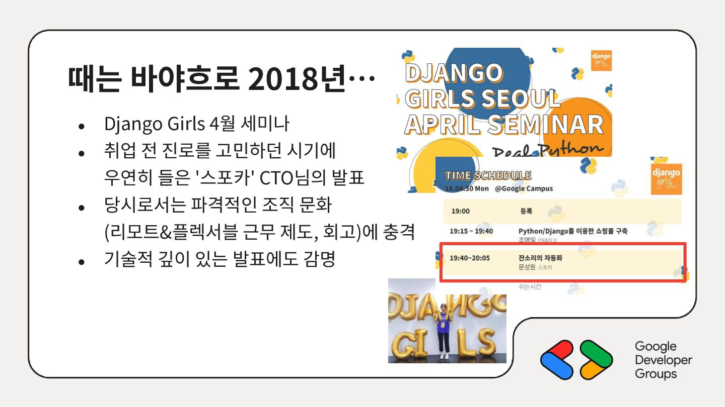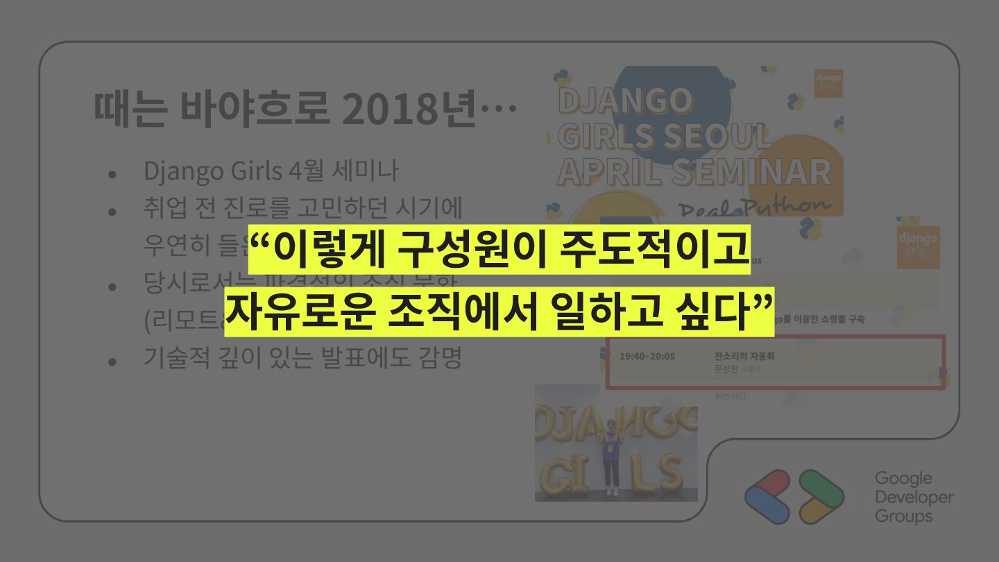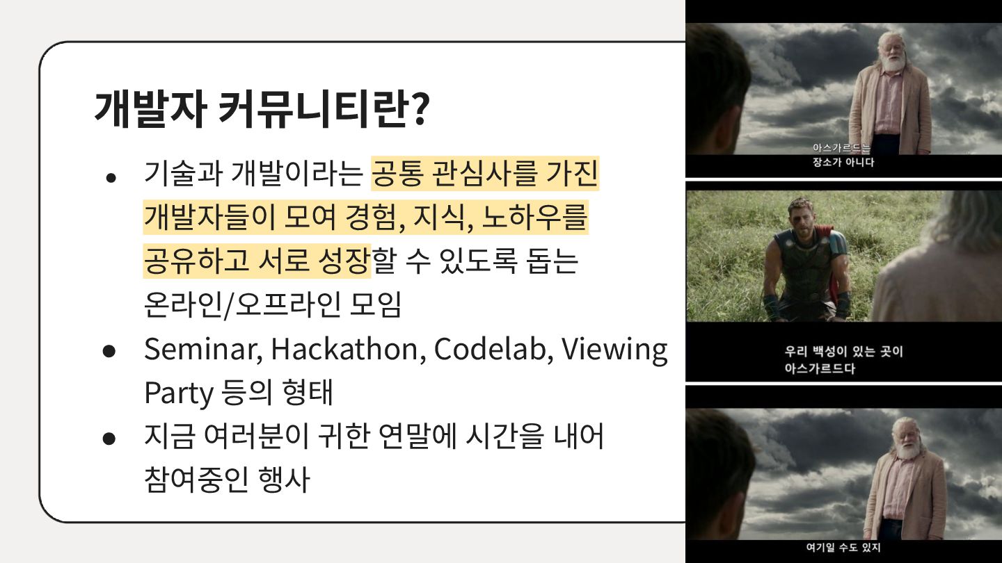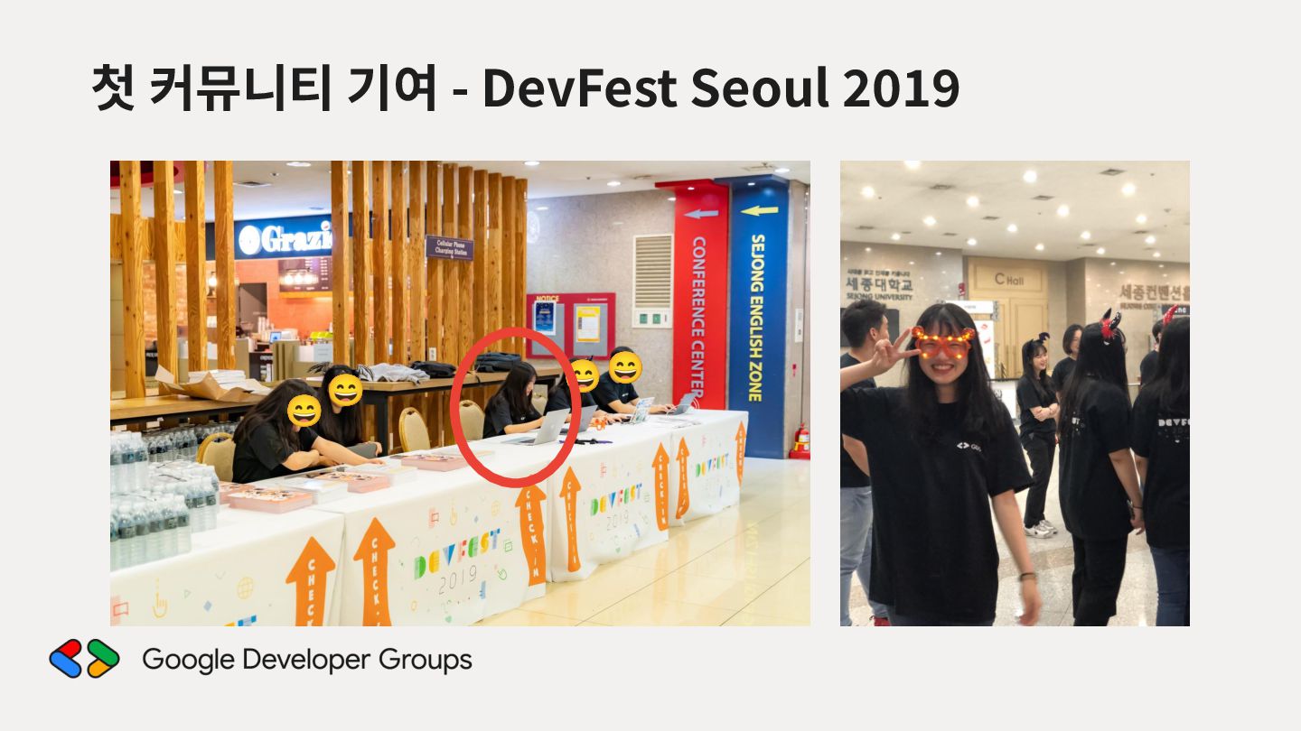 가르치려면 자신을 먼저 가르쳐야 한다." (책 『소프트 스킬』 中): 발표 준비는 청중을 위한 것이기도 하지만, 파편화된 지식을 재구성하는 과정에서 준비하는 나 자신이 가장 많이 성장한다. • 기여는 또 다른 기여를 낳는다: [Case Study] 'Super 주니어 개발자 컨퍼런스' 발표 → 주최자 상권님과의 인연 → DroidKnights 운영진 합류 제안 → 태환님의 GDG Korea Android 합류 제안 → ∞ • 커리어는 회사가 만들어주지 않는다: 회사는 퇴사하면 그만이지만, 커뮤니티와 네트워크는 계속 남는다.
