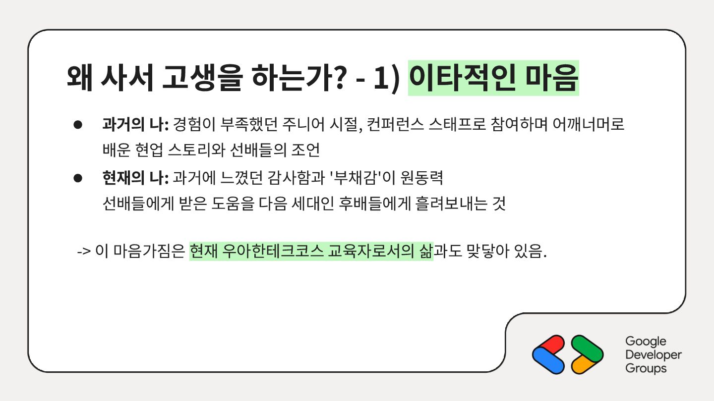 나: 경험이 부족했던 주니어 시절, 컨퍼런스 스태프로 참여하며 어깨너머로 배운 현업 스토리와 선배들의 조언 • 현재의 나: 과거에 느꼈던 감사함과 '부채감'이 원동력 선배들에게 받은 도움을 다음 세대인 후배들에게 흘려보내는 것 -> 이 마음가짐은 현재 우아한테크코스 교육자로서의 삶과도 맞닿아 있음.