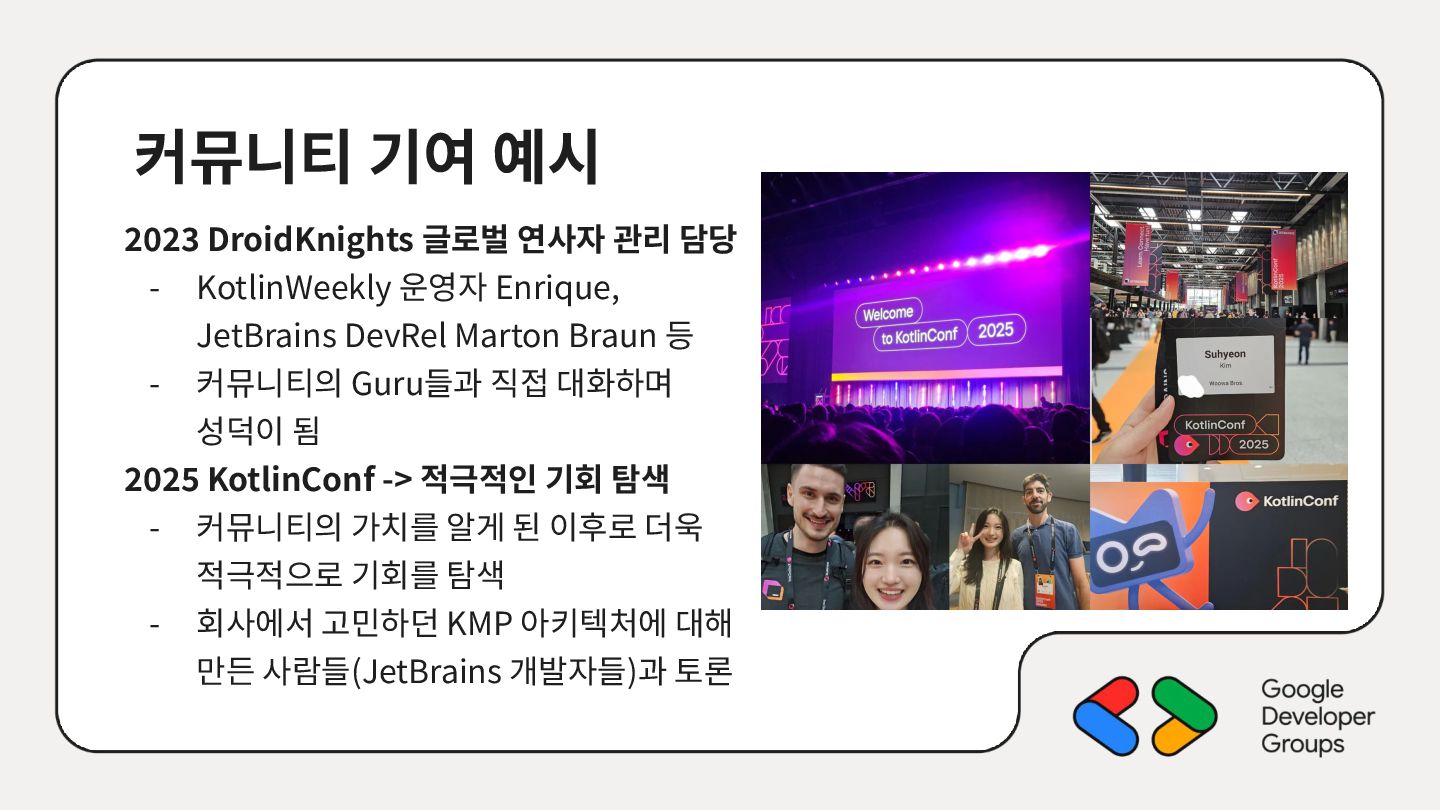 KotlinWeekly 운영자 Enrique, JetBrains DevRel Marton Braun 등 - 커뮤니티의 Guru들과 직접 대화하며 성덕이 됨 2025 KotlinConf -> 적극적인 기회 탐색 - 커뮤니티의 가치를 알게 된 이후로 더욱 적극적으로 기회를 탐색 - 회사에서 고민하던 KMP 아키텍처에 대해 만든 사람들(JetBrains 개발자들)과 토론