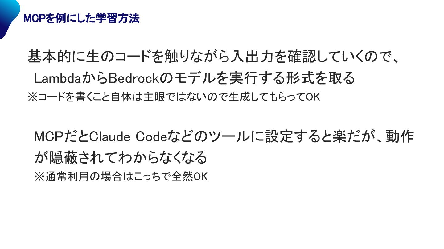 ※コードを書くこと自体は主眼ではないので生成してもらってOK MCPだとClaude Codeなどのツールに設定すると楽だが、動作 が隠蔽されてわからなくなる ※通常利用の場合はこっちで全然OK