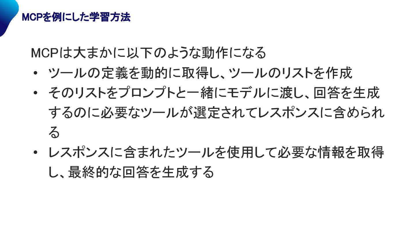 • ツールの定義を動的に取得し、ツールのリストを作成 • そのリストをプロンプトと一緒にモデルに渡し、回答を生成 するのに必要なツールが選定されてレスポンスに含められ る • レスポンスに含まれたツールを使用して必要な情報を取得 し、最終的な回答を生成する