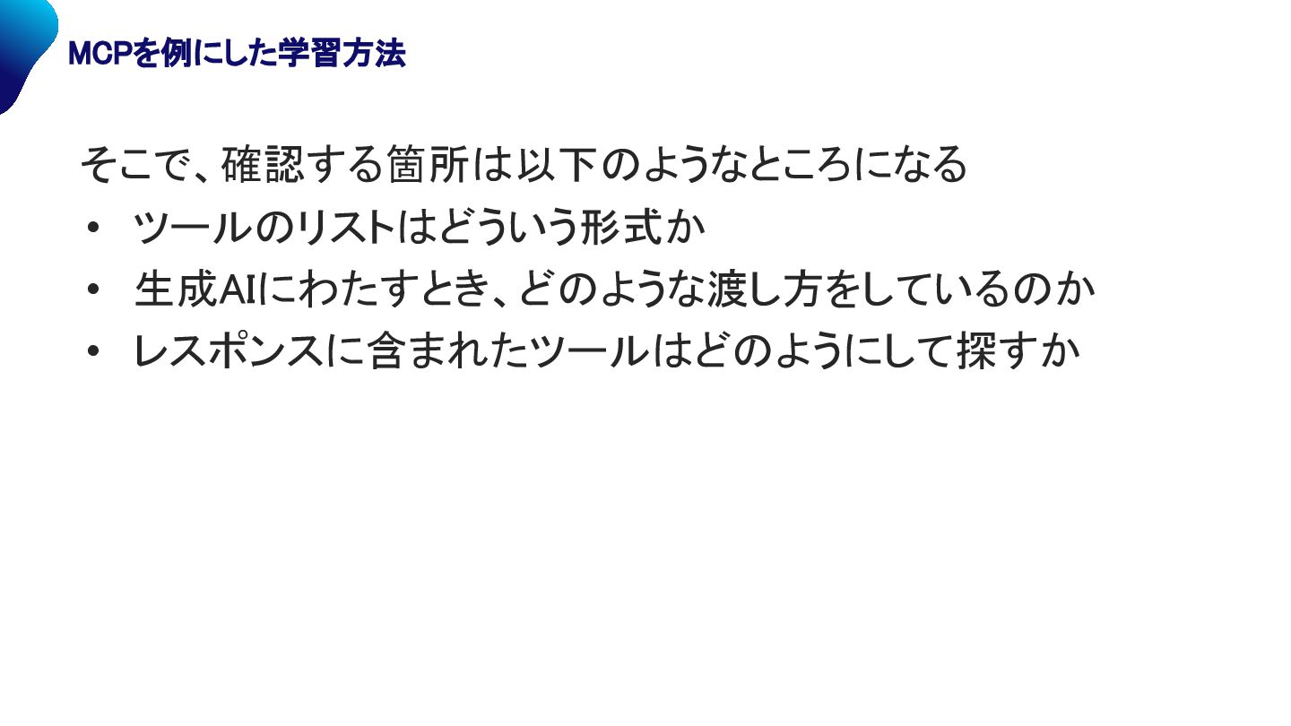 • ツールのリストはどういう形式か • 生成AIにわたすとき、どのような渡し方をしているのか • レスポンスに含まれたツールはどのようにして探すか