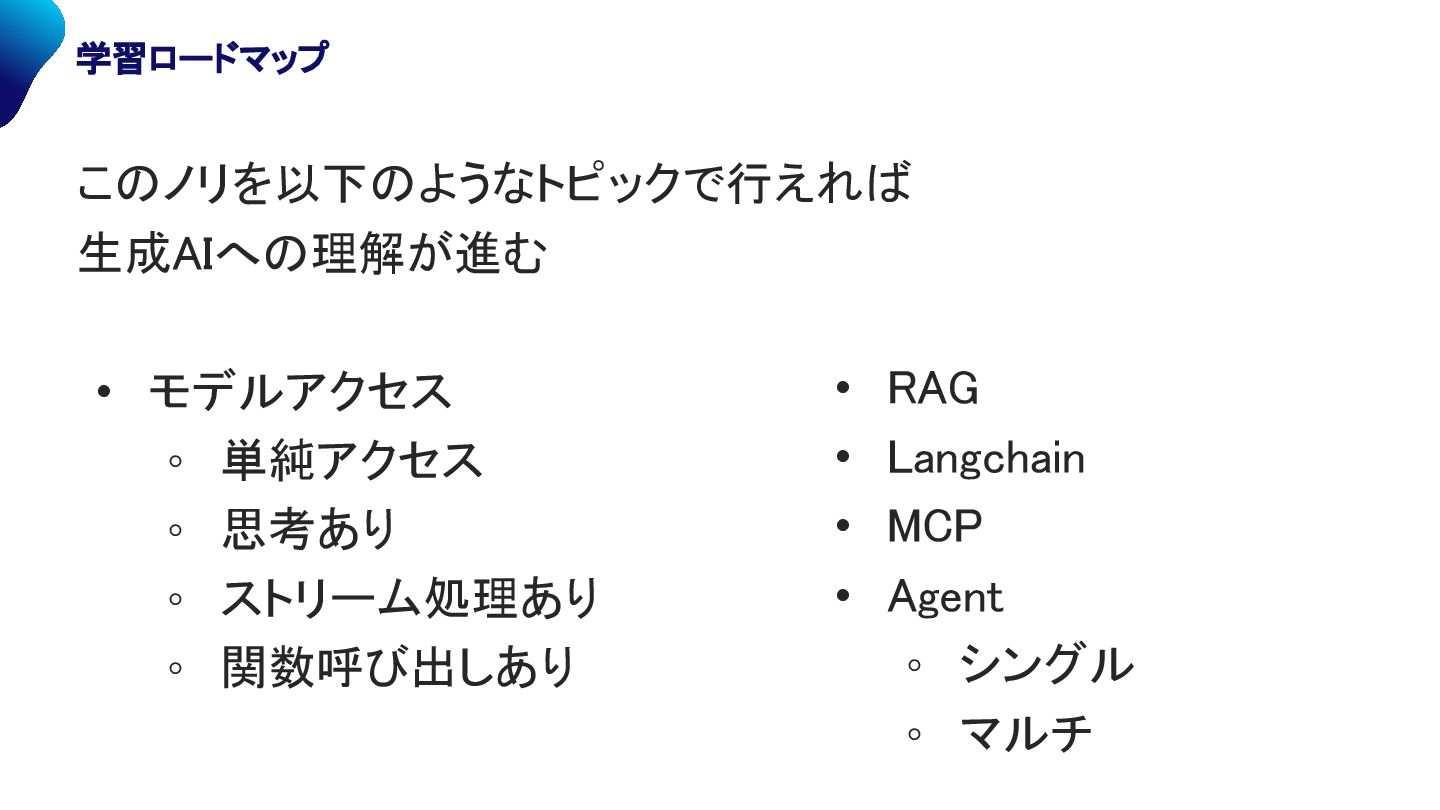 • モデルアクセス ◦ 単純アクセス ◦ 思考あり ◦ ストリーム処理あり ◦ 関数呼び出しあり • RAG • Langchain • MCP • Agent ◦ シングル ◦ マルチ