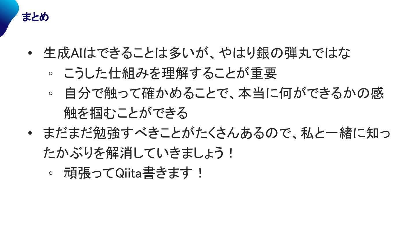こうした仕組みを理解することが重要 ◦ 自分で触って確かめることで、本当に何ができるかの感 触を掴むことができる • まだまだ勉強すべきことがたくさんあるので、私と一緒に知っ たかぶりを解消していきましょう! ◦ 頑張ってQiita書きます!