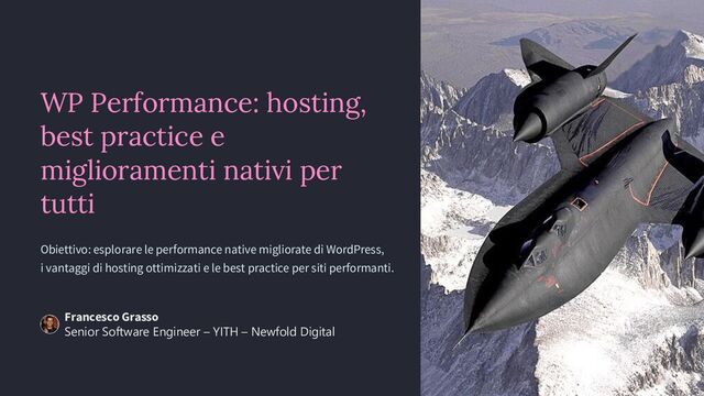 tutti Obiettivo: esplorare le performance native migliorate di WordPress, i vantaggi di hosting ottimizzati e le best practice per siti performanti. Francesco Grasso Senior Software Engineer – YITH – Newfold Digital