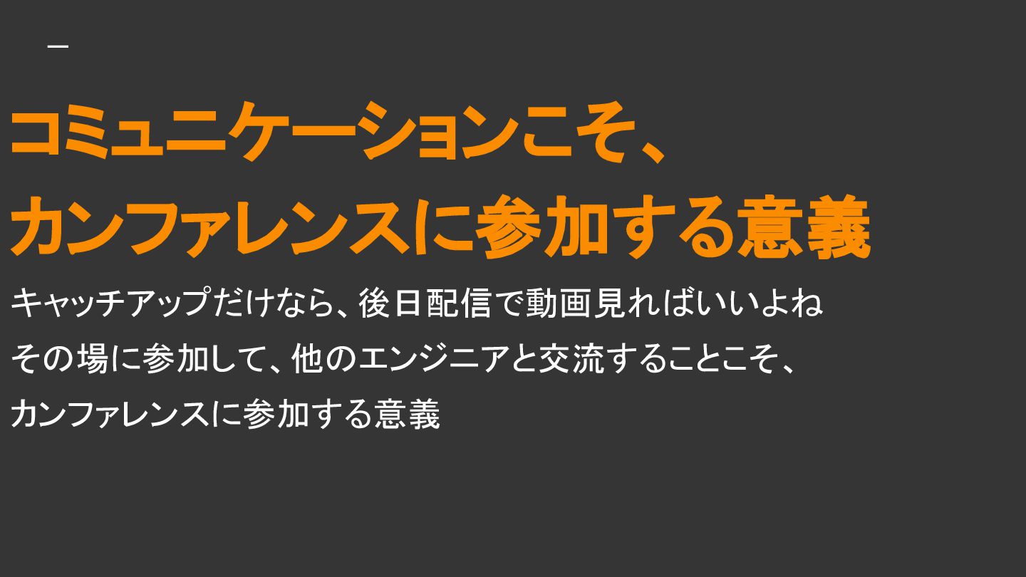 コミュニケーションこそ、 カンファレンスに参加する意義 キャッチアップだけなら、後日配信で動画見ればいいよね その場に参加して、他のエンジニアと交流することこそ、 カンファレンスに参加する意義