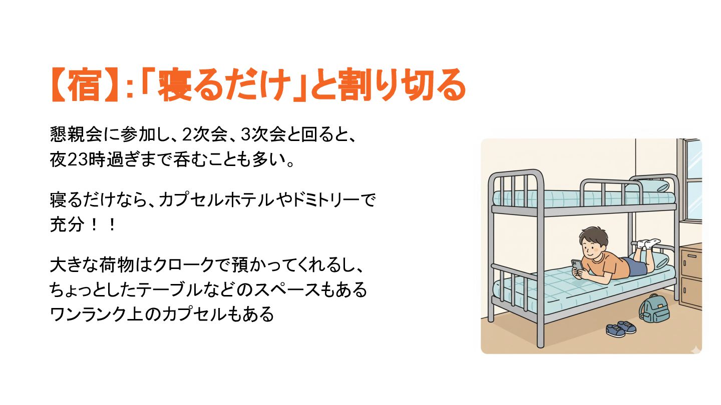 【宿】:「寝るだけ」と割り切る 懇親会に参加し、2次会、3次会と回ると、 夜23時過ぎまで呑むことも多い。 寝るだけなら、カプセルホテルやドミトリーで 充分!! 大きな荷物はクロークで預かってくれるし、 ちょっとしたテーブルなどのスペースもある ワンランク上のカプセルもある