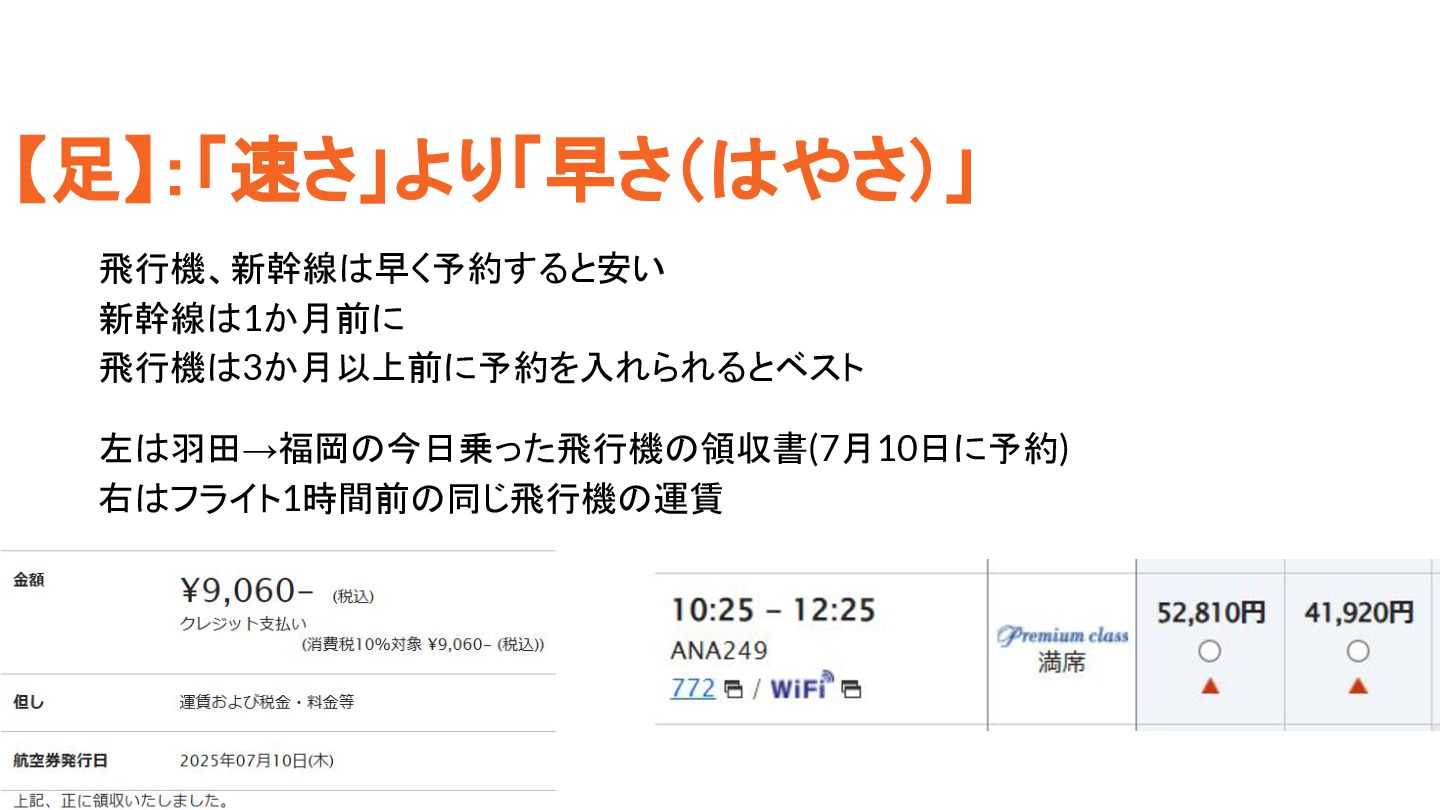 【足】:「速さ」より「早さ(はやさ)」 飛行機、新幹線は早く予約すると安い 新幹線は1か月前に 飛行機は3か月以上前に予約を入れられるとベスト 左は羽田→福岡の今日乗った飛行機の領収書(7月10日に予約) 右はフライト1時間前の同じ飛行機の運賃