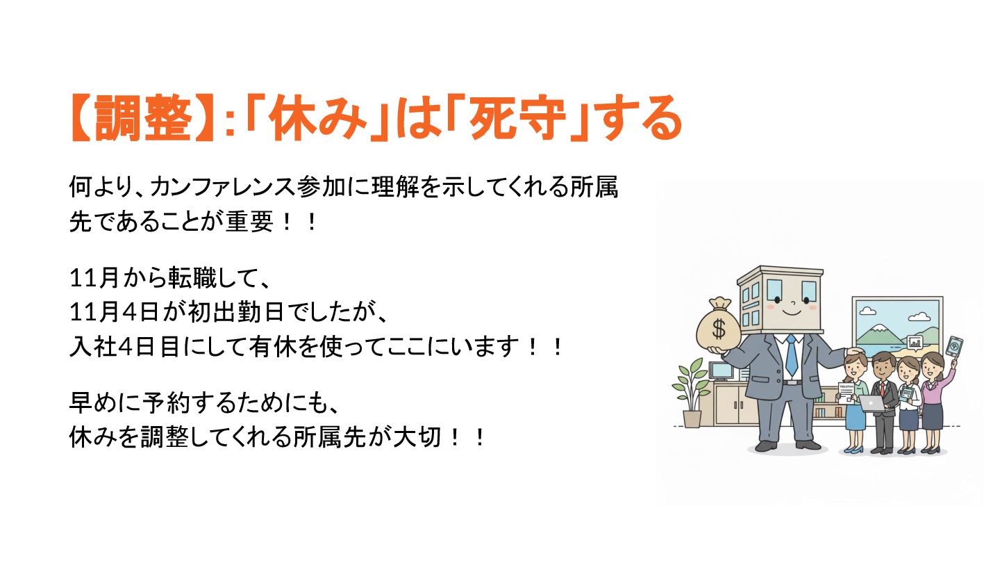 【調整】:「休み」は「死守」する 何より、カンファレンス参加に理解を示してくれる所属 先であることが重要!! 11月から転職して、 11月4日が初出勤日でしたが、 入社4日目にして有休を使ってここにいます!! 早めに予約するためにも、 休みを調整してくれる所属先が大切!!