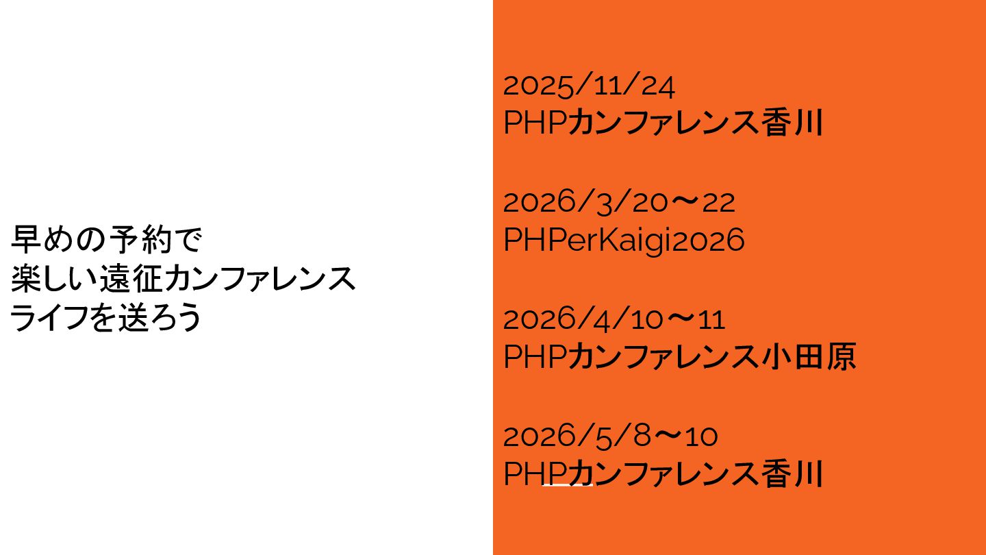 早めの予約で 楽しい遠征カンファレンス ライフを送ろう 2025/11/24 PHPカンファレンス香川 2026/3/20~22 PHPerKaigi2026 2026/4/10~11 PHPカンファレンス小田原 2026/5/8~10