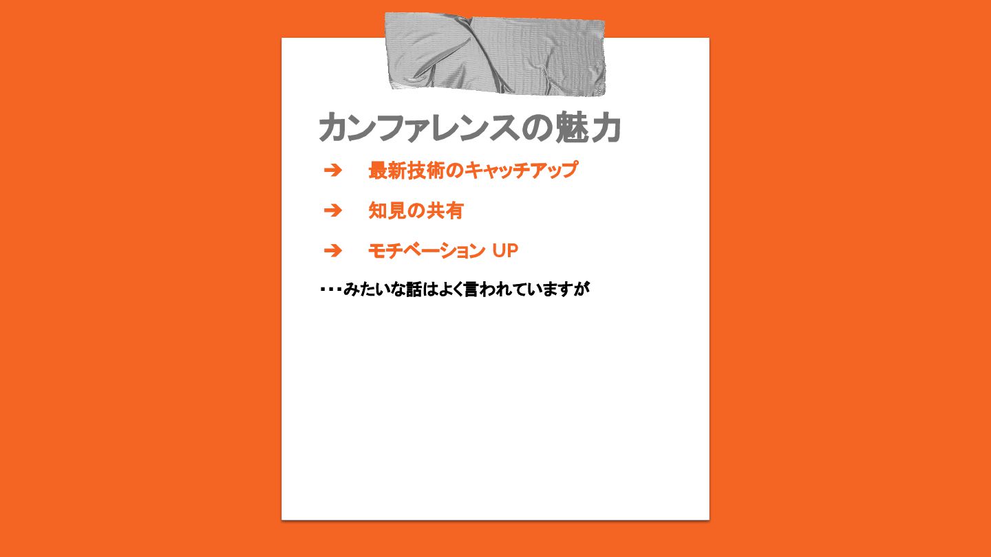 カンファレンスの魅力 ➔ 最新技術のキャッチアップ ➔ 知見の共有 ➔ モチベーション UP ・・・みたいな話はよく言われていますが
