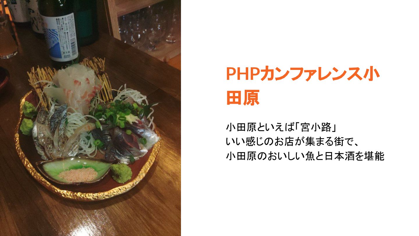 PHPカンファレンス小 田原 小田原といえば「宮小路」 いい感じのお店が集まる街で、 小田原のおいしい魚と日本酒を堪能