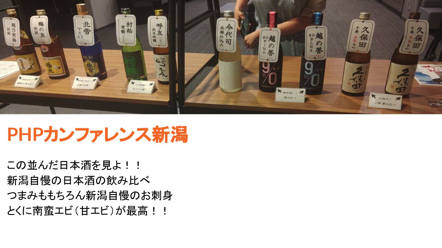 PHPカンファレンス新潟 この並んだ日本酒を見よ!! 新潟自慢の日本酒の飲み比べ つまみももちろん新潟自慢のお刺身 とくに南蛮エビ(甘エビ)が最高!!