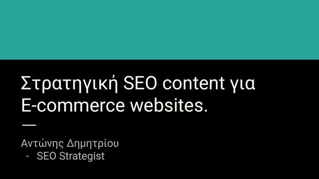 Η παρουσίαση "Στρατηγική SEO Content για E-commerce Websites" από τον Αντώνη Δημητρίου αναλύει τη σημασία της σωστής στρατηγικής περιεχομένου για την αύξηση του οργανικού traffic σε ιστοσελίδες ηλεκτρονικού εμπορίου. Υπογραμμίζει τη συμβολή των οργανικών αποτελεσμάτων, που παράγουν σχεδόν το 37,5% του traffic και επηρεάζουν σημαντικά τις παραγγελίες. Τονίζεται ότι οι στρατηγικές SEO και το blogging είναι από τις πιο αποτελεσματικές πηγές για τη δημιουργία leads.