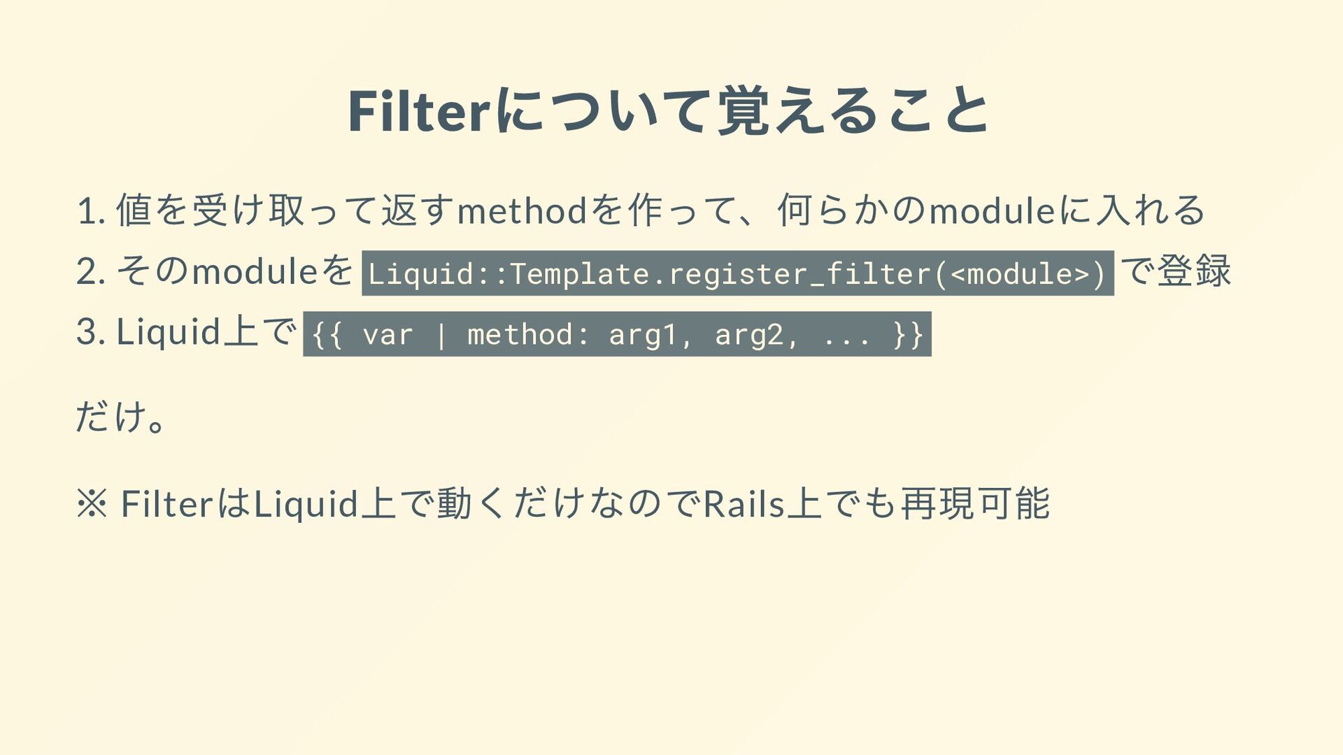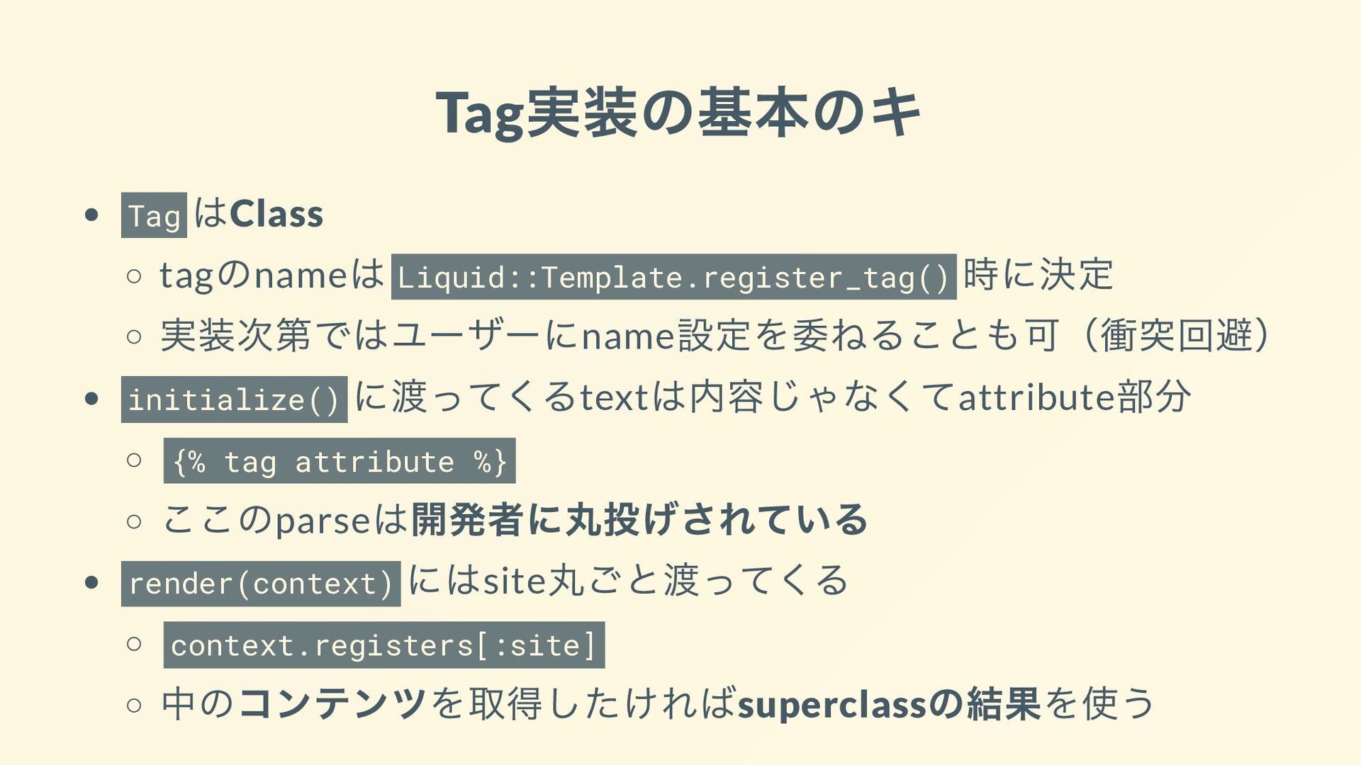 :data, :ext, ... # @param [Jekyll::Site] site # @param [String] base - base directory # @param [String] dir - dirname of source file in base dir # @param [String] name def initialize(site, base, dir, name) end end ページの中身を詰める処理 page = Page.new(site, basem dir, name) page.data[key] = value