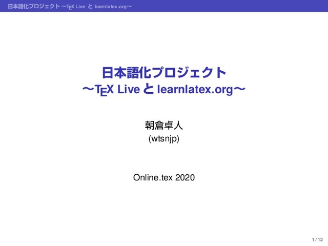 ֤ࠃޠ൛Ͱɼίʔυྫݪଇ༁ͤͣӳޠͷ·· ˠຊޠ൛Ͱྫ༁͠ͳ͍ͱخ͕͠͞ݮ ▶ ຊՈ learnlatex.org pdfTEX ʴ article Ϋϥε͕લఏ ˠຊޠ൛ͷ߹ɼ·ͣ༻͢Δ TEX Τϯδϯ͔ΒҟͳΔ جຊతͳํʢӳޠ൛ˠຊޠ൛ʣ ▶ جຊϫʔΫϑϩʔɿpdfTEX ˠ pTEX ʴ dvipdfmx ▶ جຊจॻΫϥεɿarticle ˠ jsarticle ▶ Unicode ΤϯδϯɿX E TEX, LuaTEX ˠ upTEX, LuaTEX-ja Ճ ▶ ֦ுจॻΫϥεɿKOMA-script, memoir ˠ jlreq Ճ 11 / 12
