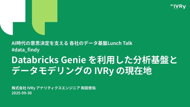 Databricks Genie を利⽤した分析基盤と データモデリングの IVRy の現在地 AI時代の意思決定を⽀える 各社のデータ基盤Lunch Talk #data_findy
