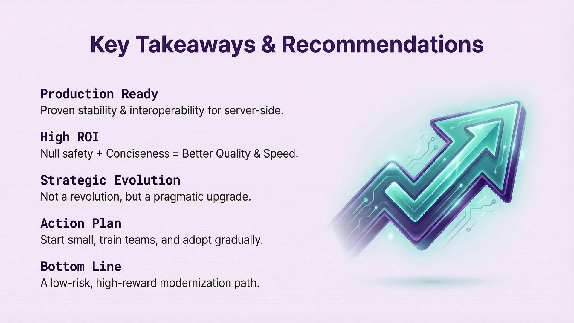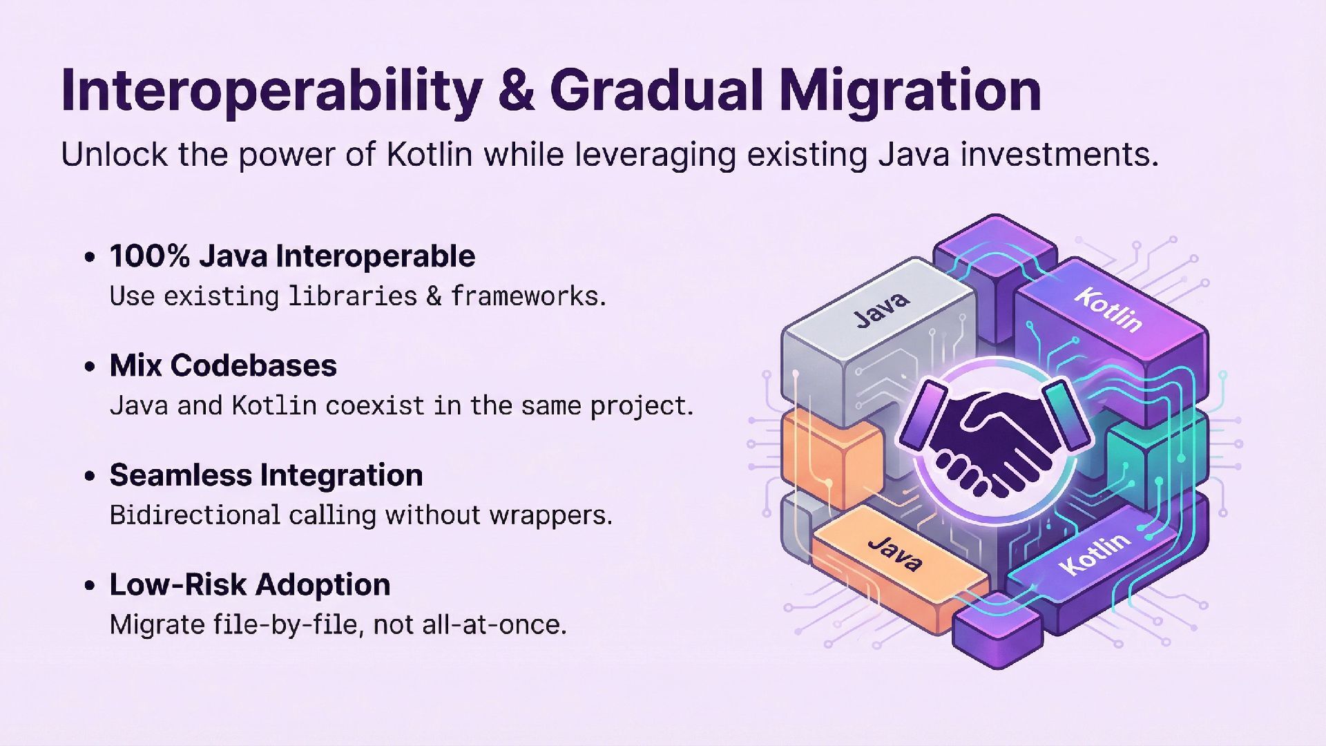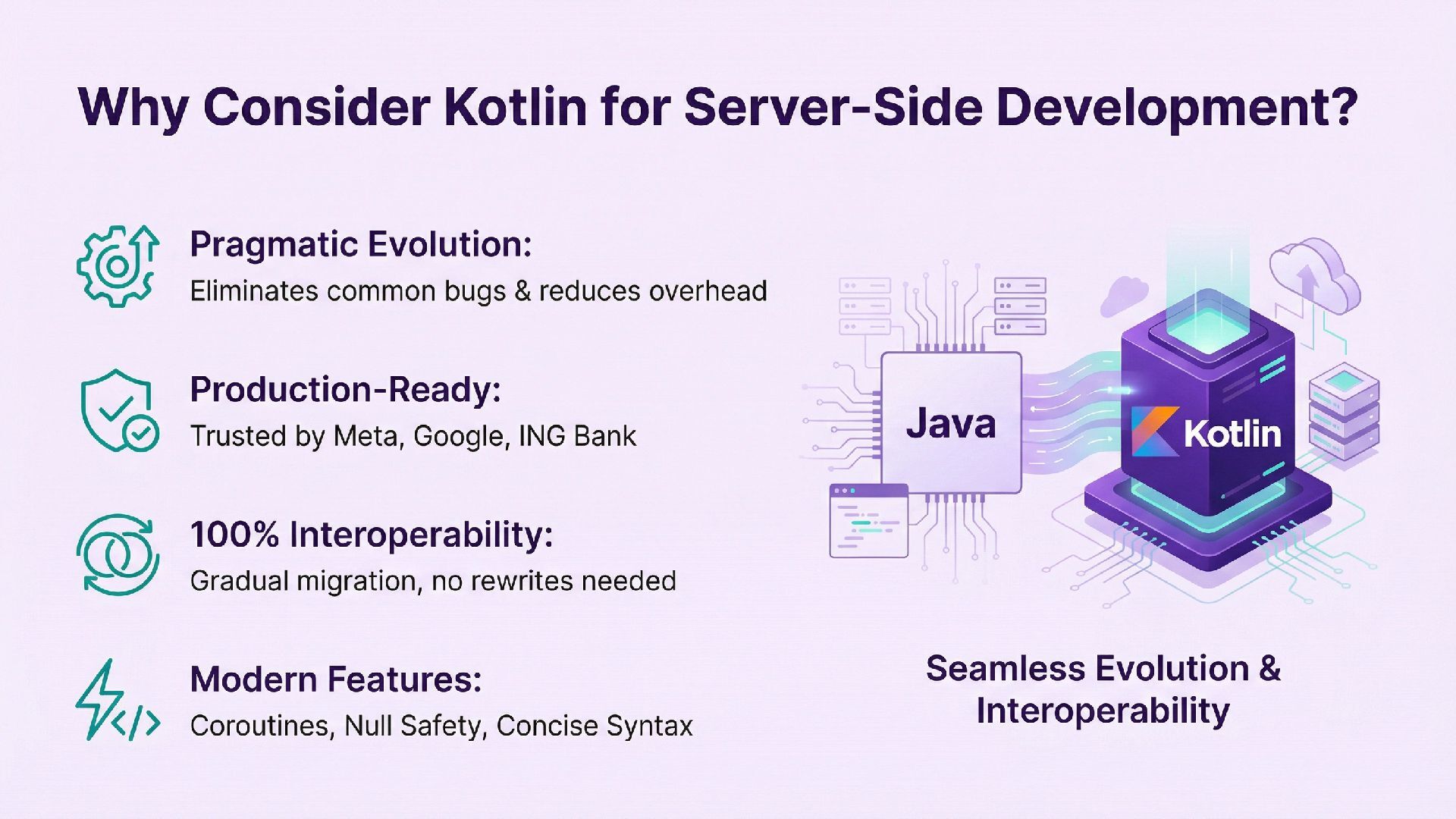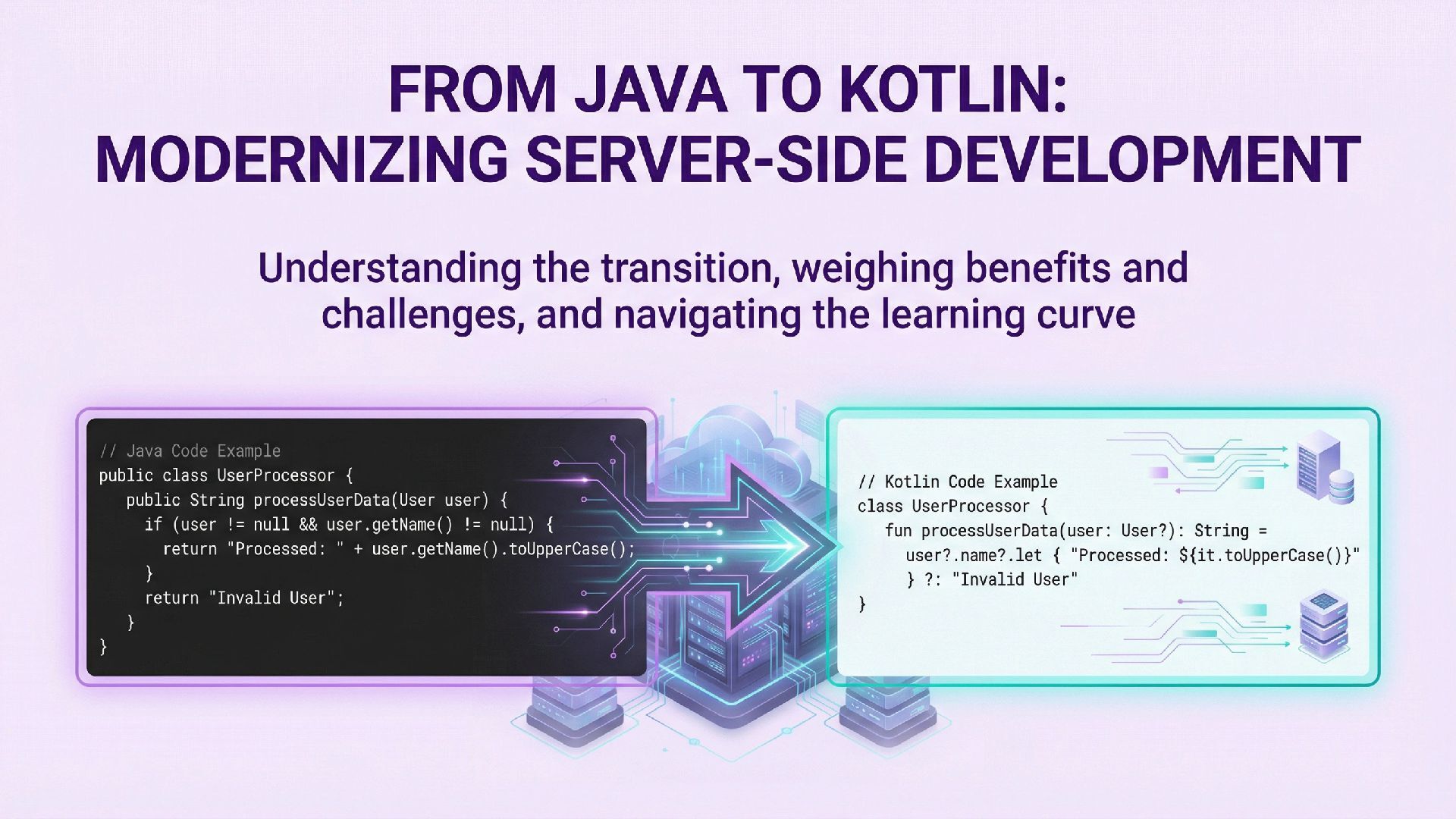 This presentation provides a comprehensive guide for migrating server-side applications from Java to Kotlin. It highlights Kotlin's key advantages, such as null safety, concise syntax, and efficient concurrency with coroutines, while emphasizing its 100% interoperability with Java. The slides offer a balanced comparison of benefits and drawbacks, along with a practical adoption roadmap tailored for both junior and senior developers to ensure a smooth and strategic transition.