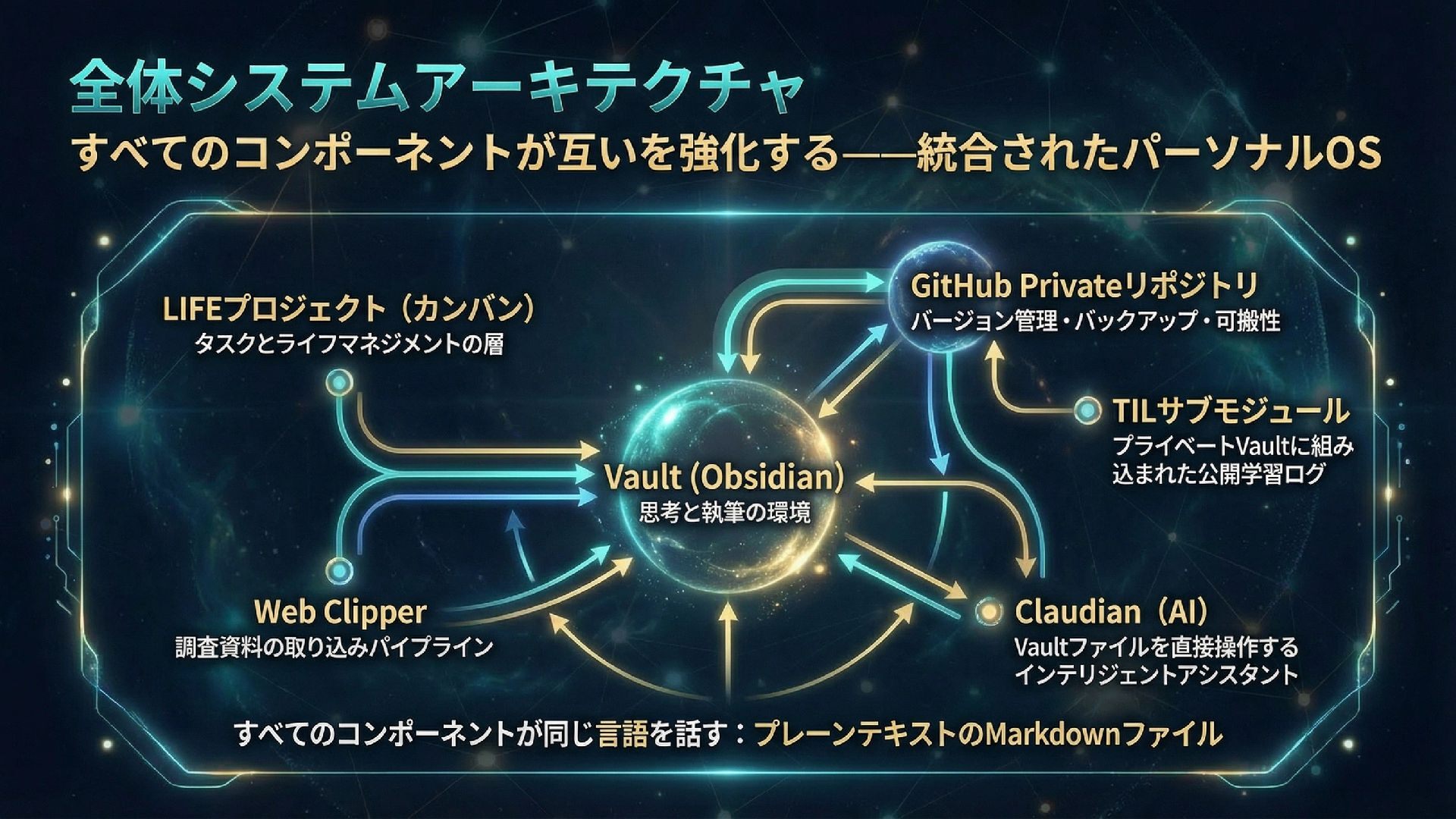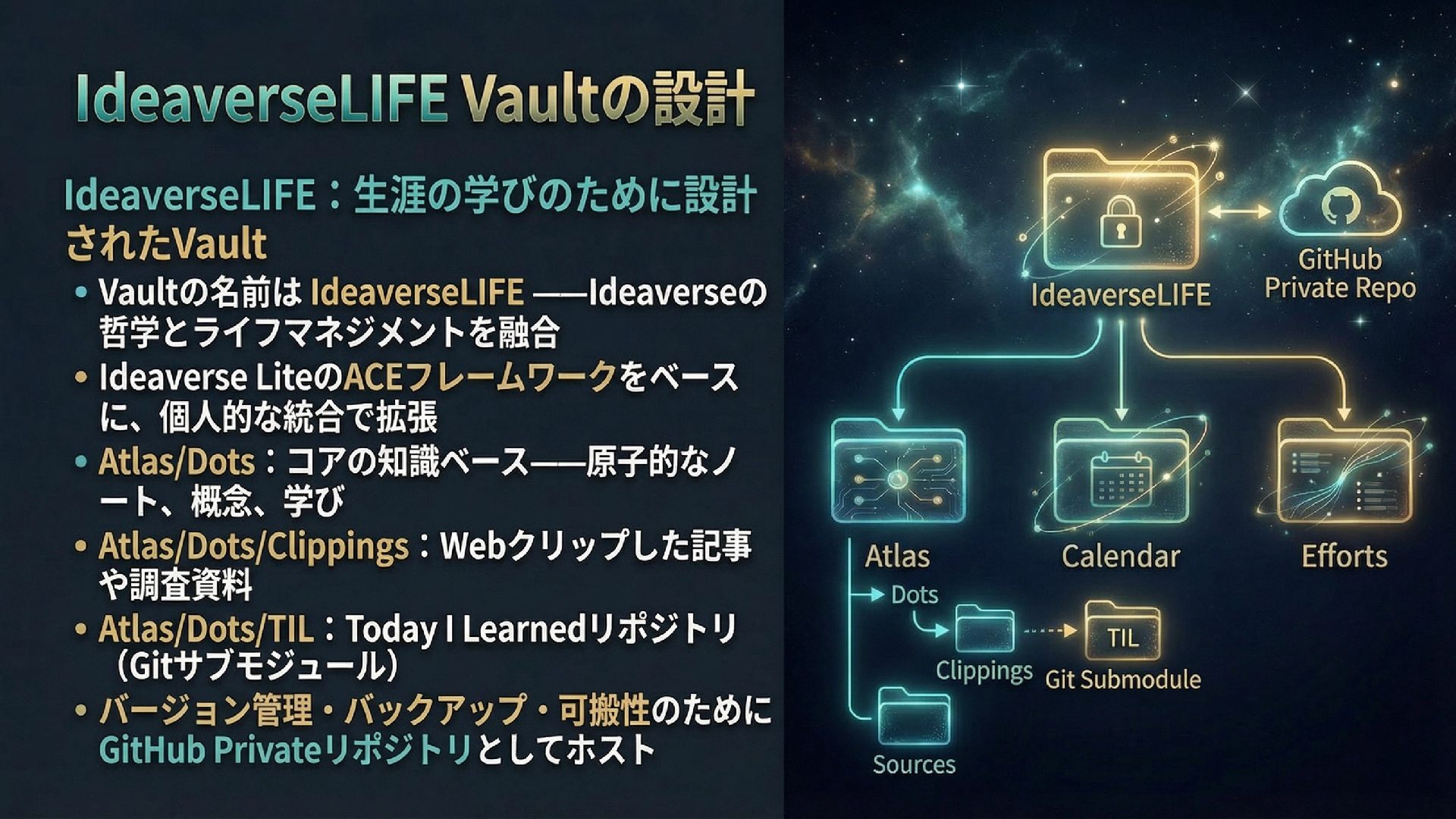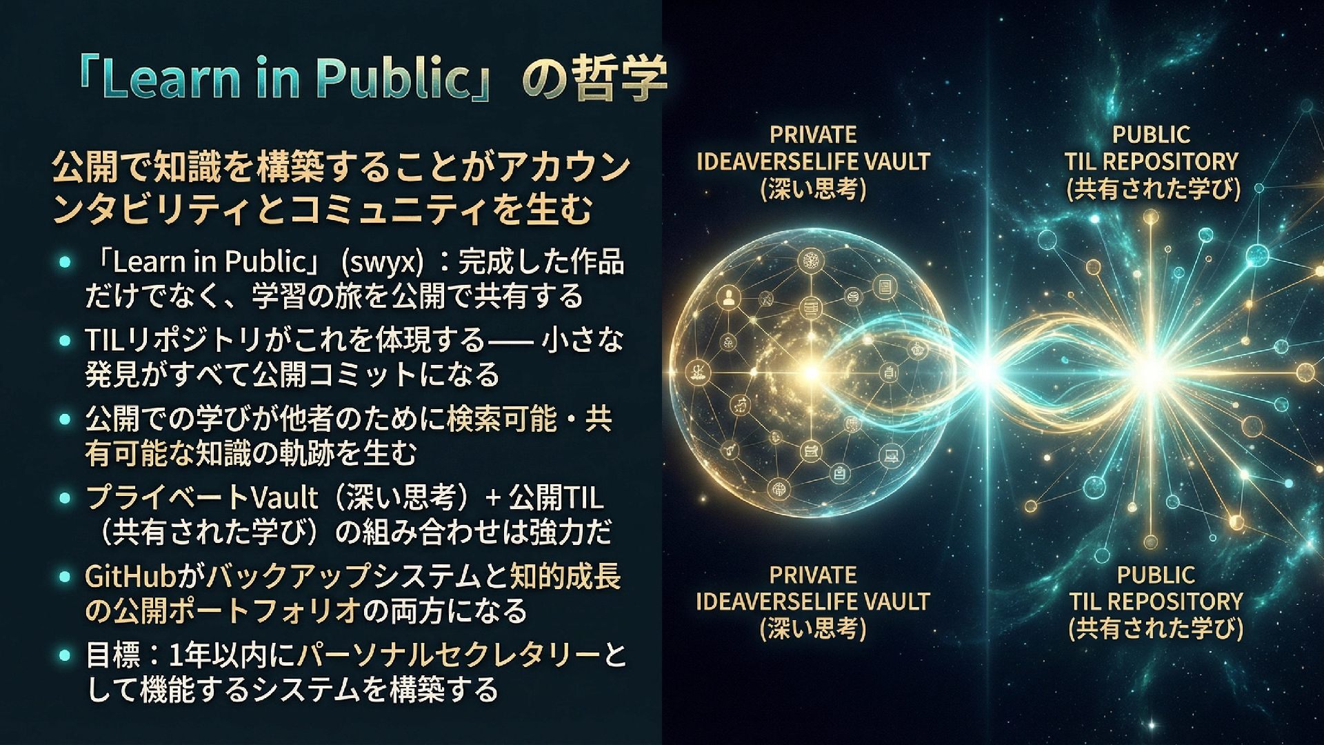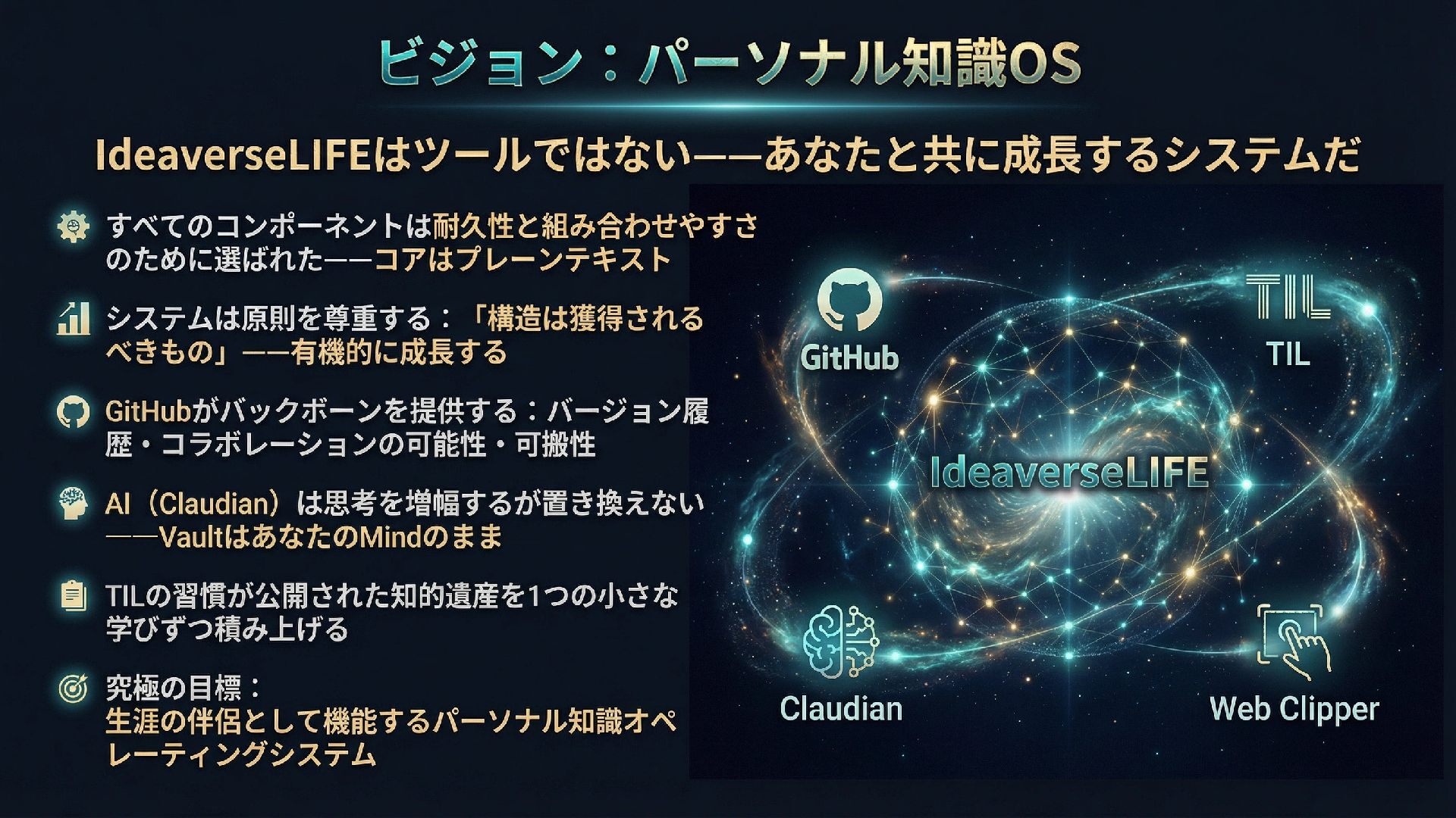 本スライドは、ObsidianとGitHub、AIを組み合わせたパーソナル知識管理システム「IdeaverseLIFE」を紹介します。「テキストに賭けよ」という哲学とACEフレームワークを基盤に、Ideaverse Lite・Webクリッピング・TILサブモジュール・GitHubカンバン・Claudianプラグインを統合し、生涯使い続けられる知識OSの構築を目指します。