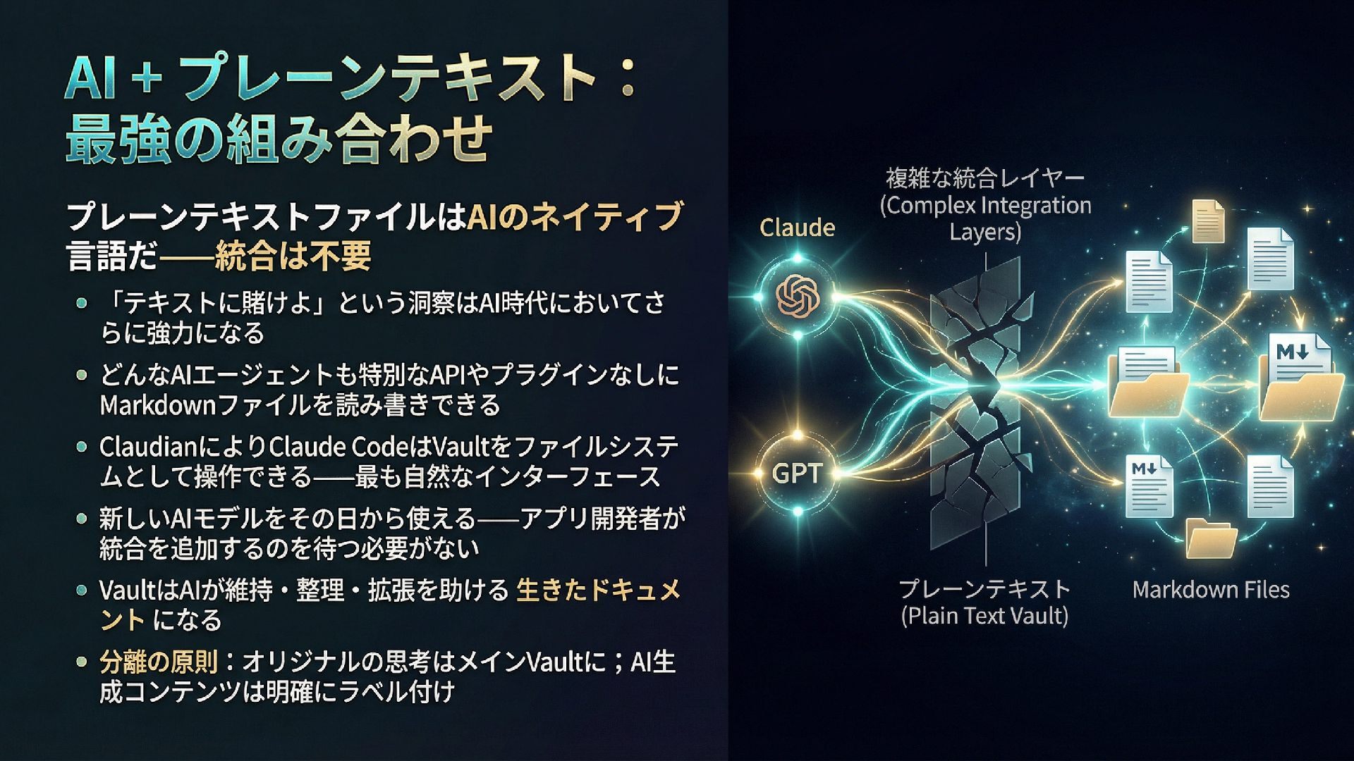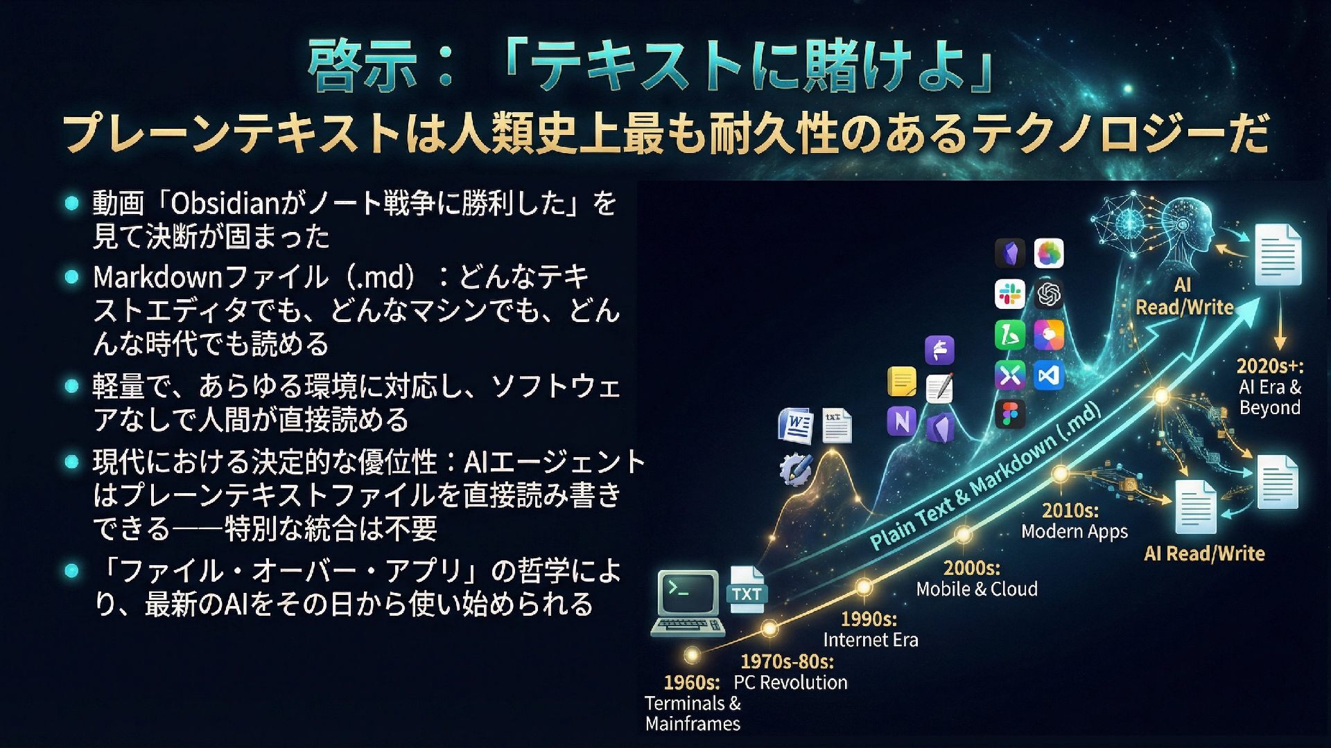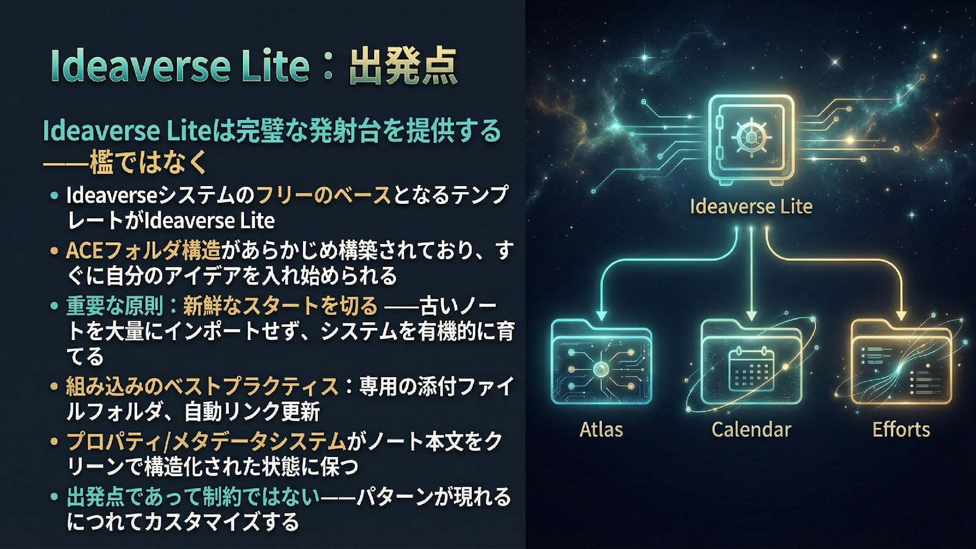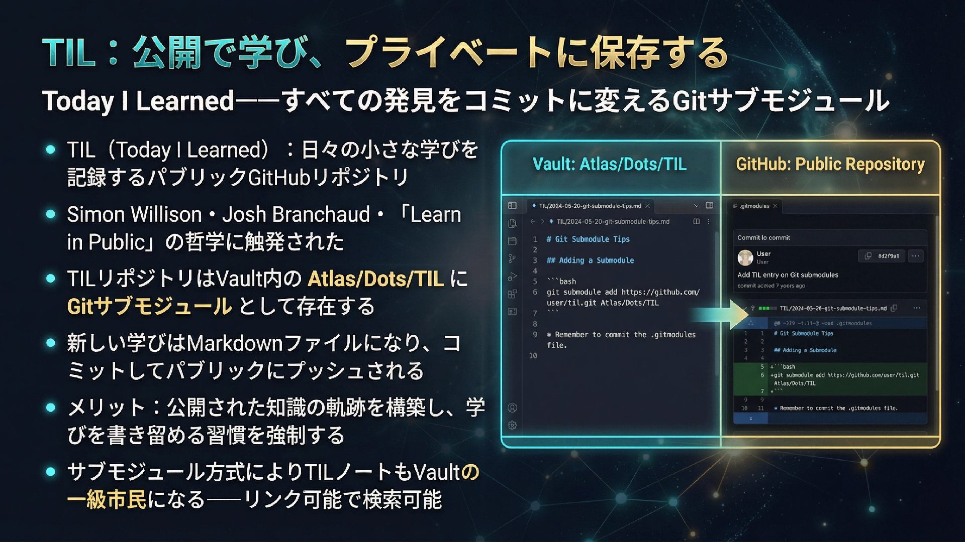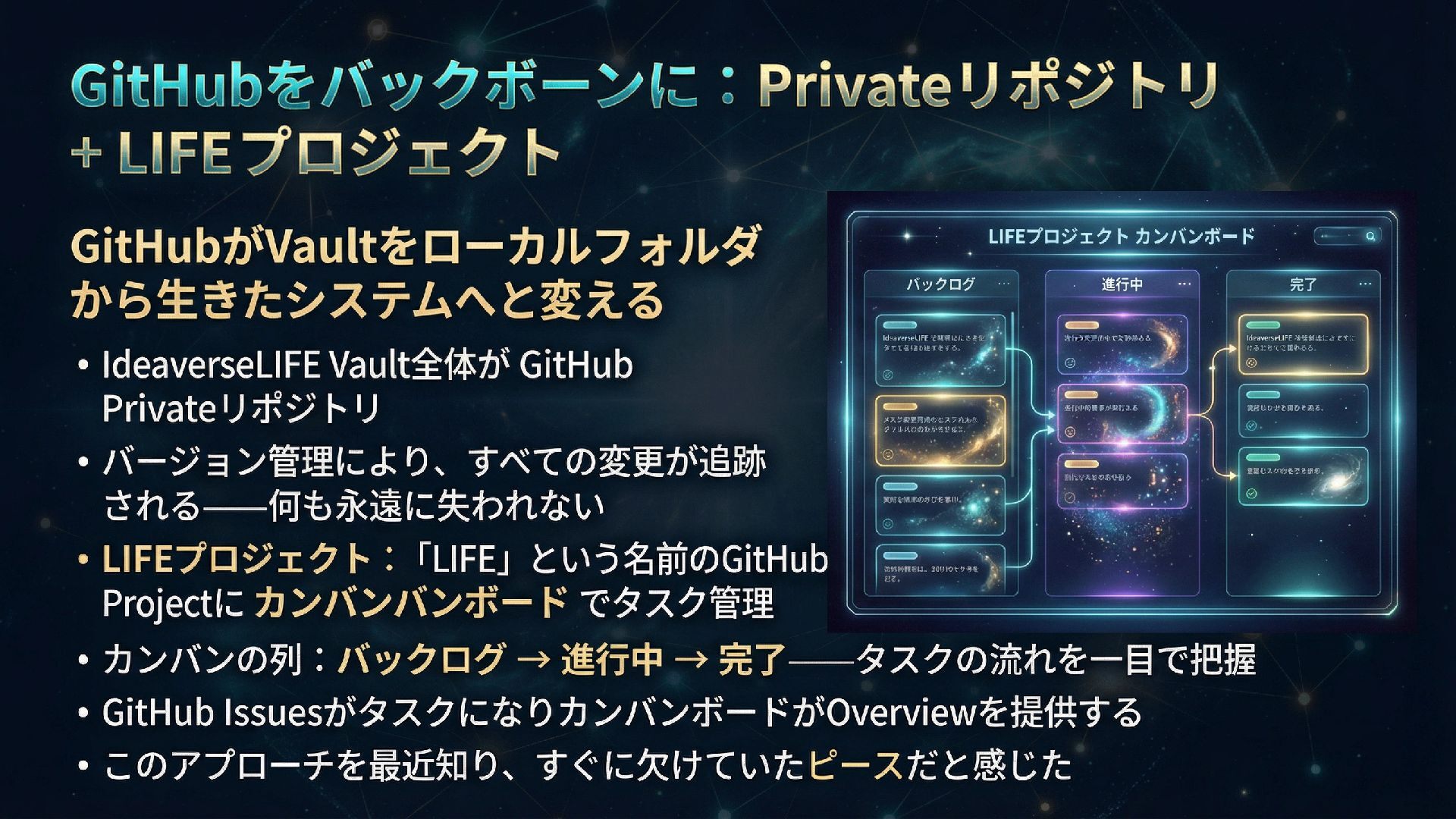 本スライドは、ObsidianとGitHub、AIを組み合わせたパーソナル知識管理システム「IdeaverseLIFE」を紹介します。「テキストに賭けよ」という哲学とACEフレームワークを基盤に、Ideaverse Lite・Webクリッピング・TILサブモジュール・GitHubカンバン・Claudianプラグインを統合し、生涯使い続けられる知識OSの構築を目指します。