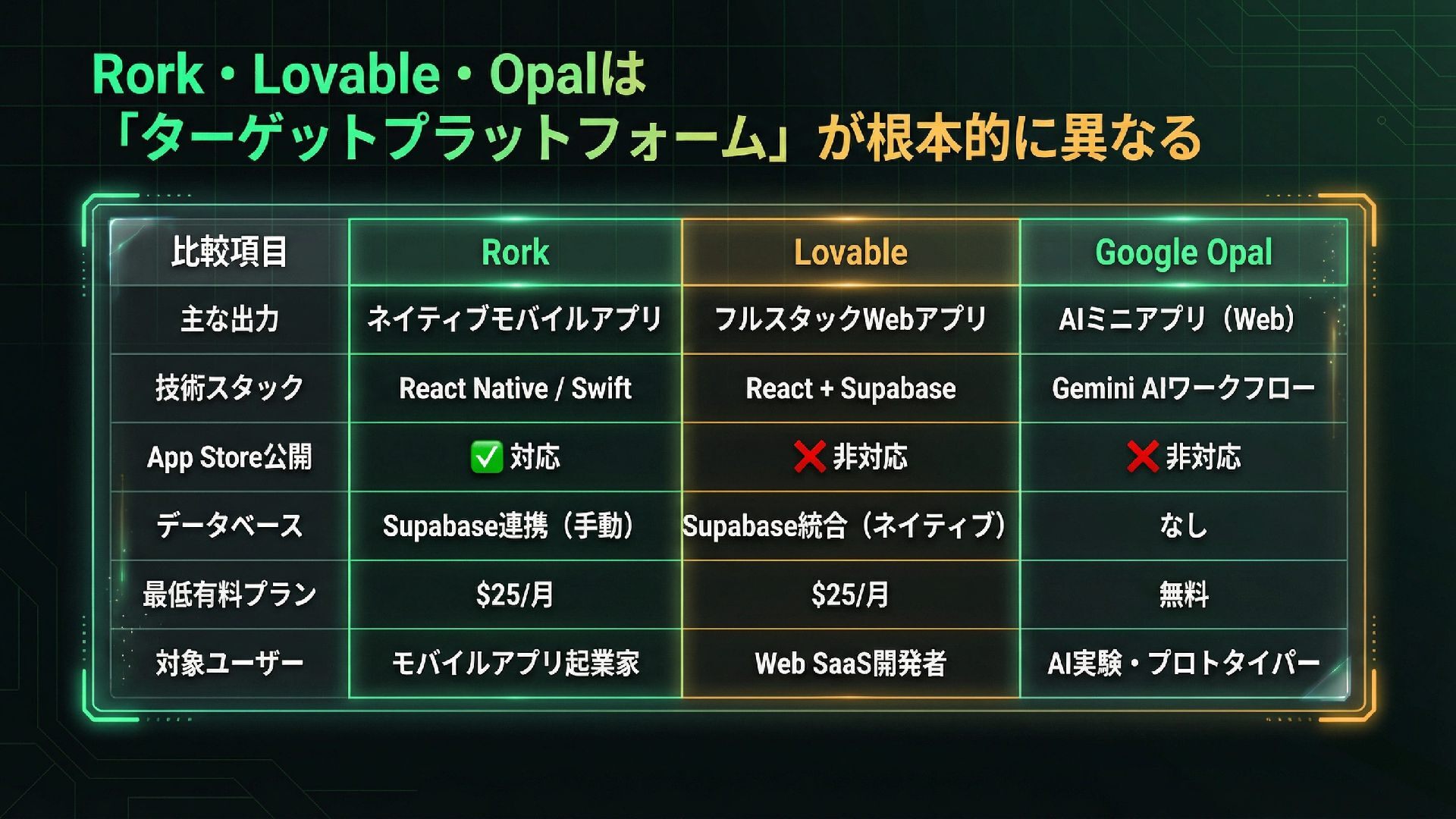 Rorkは、自然言語のプロンプトからReact NativeとExpoを用いてネイティブモバイルアプリを数分で自動生成する画期的なAIビルダーです。従来のアプリ開発における高コストや長期間の壁を打ち破り、非エンジニアでもApp Storeレベルのアプリを構築可能にします。Webアプリに特化したLovableや、AIワークフロー構築向けのGoogle Opalとは異なり、Rorkはモバイルプラットフォームに特化しており、次期バージョンのRork MaxではSwiftを用いたApple全デバイスへの対応も予定されています。