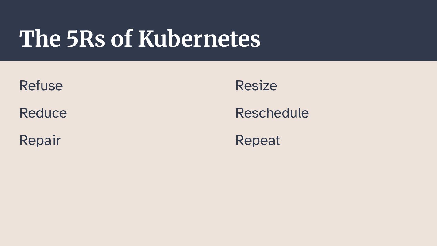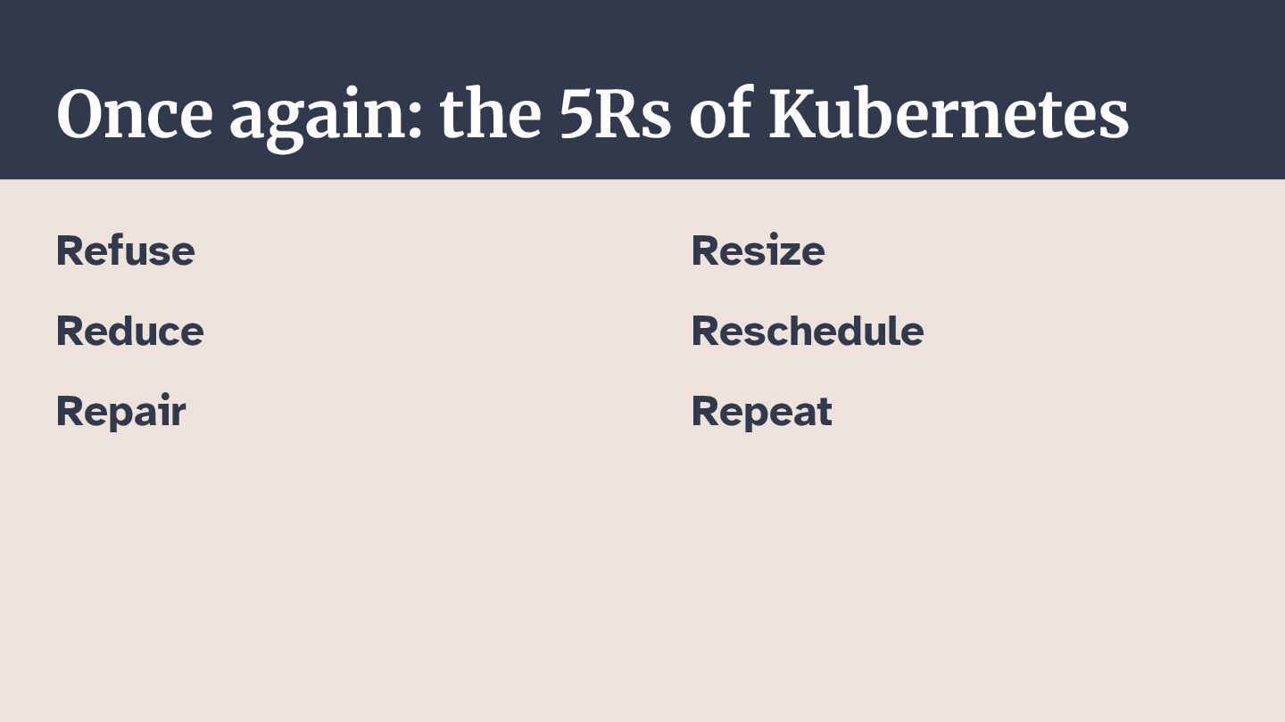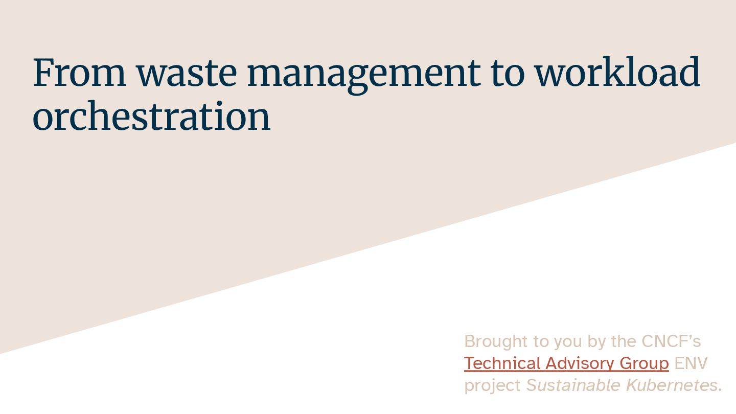 In this talk, I want to highlight areas of running workloads on Kubernetes that organizations can improve on. We'll take a starting point in the "reuse, reduce, recycle" principle of environmental protection, and see how we can apply it to our applications running on Kubernetes.