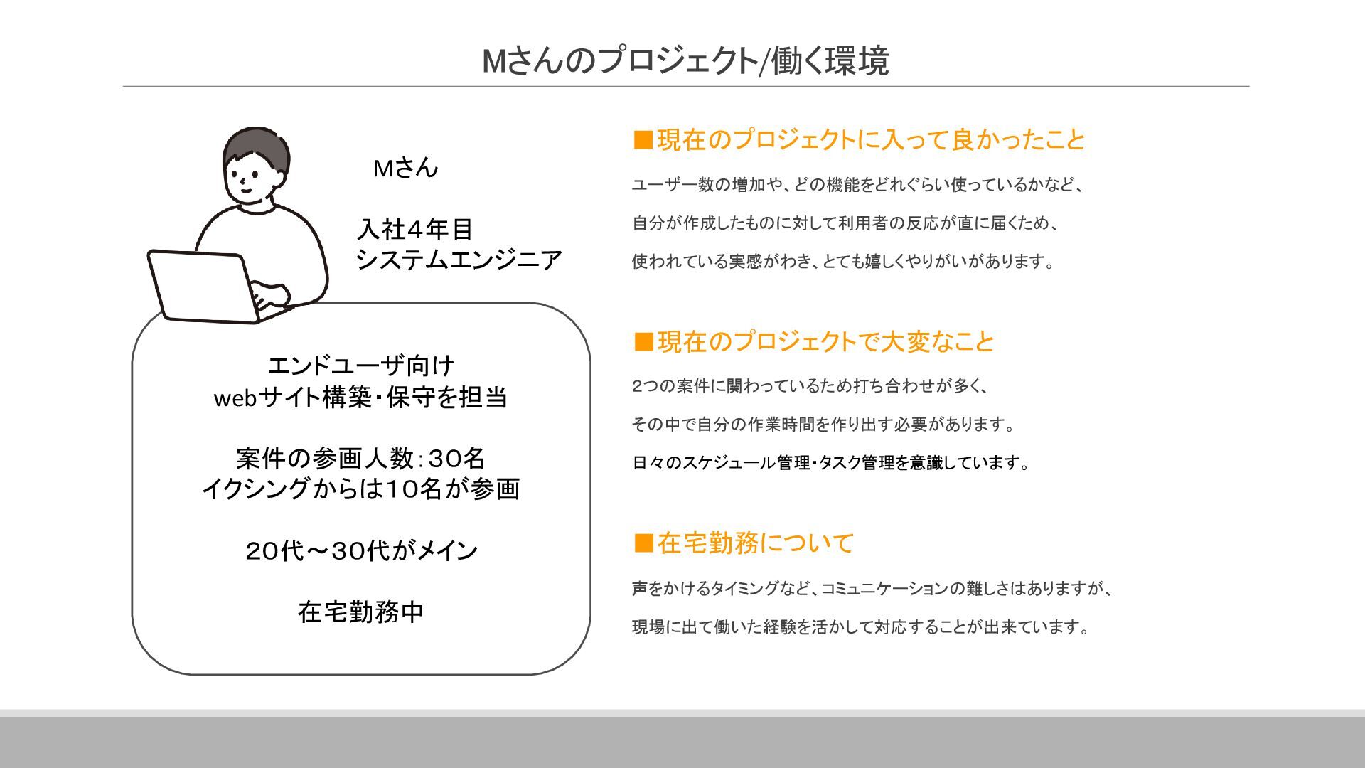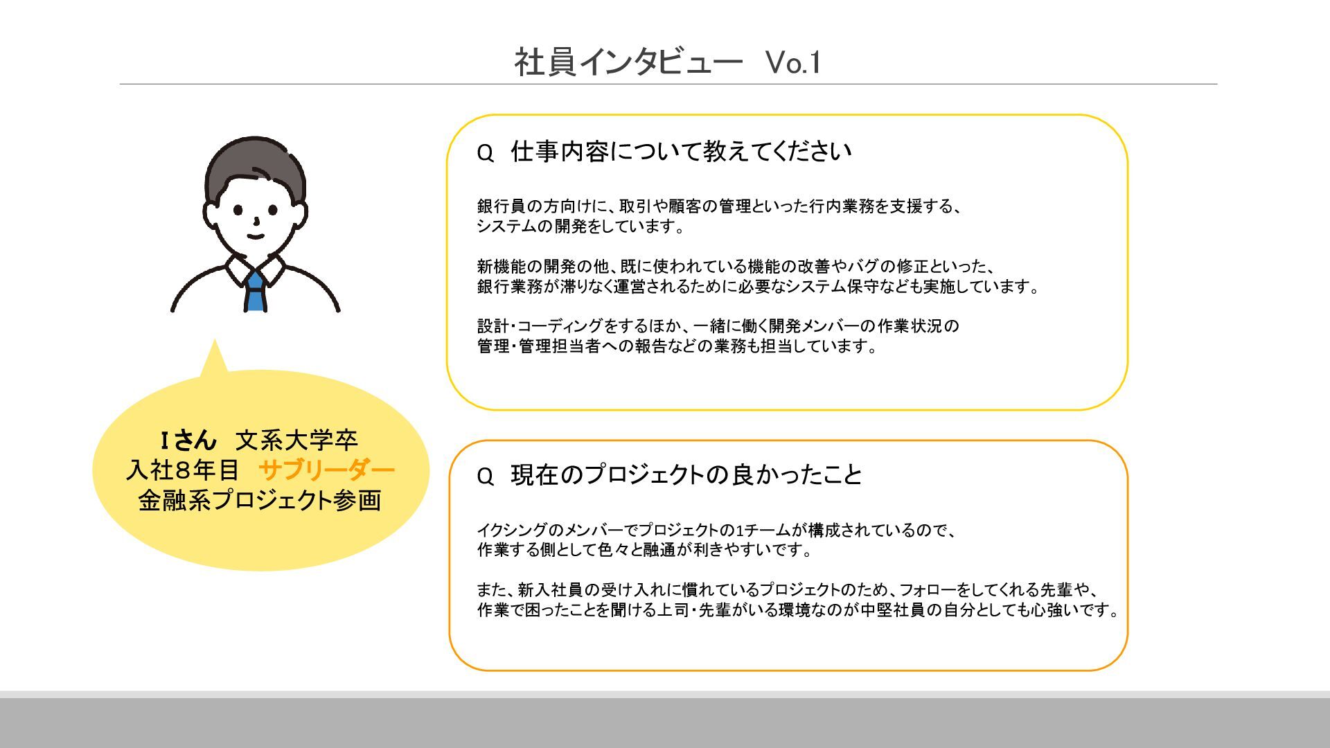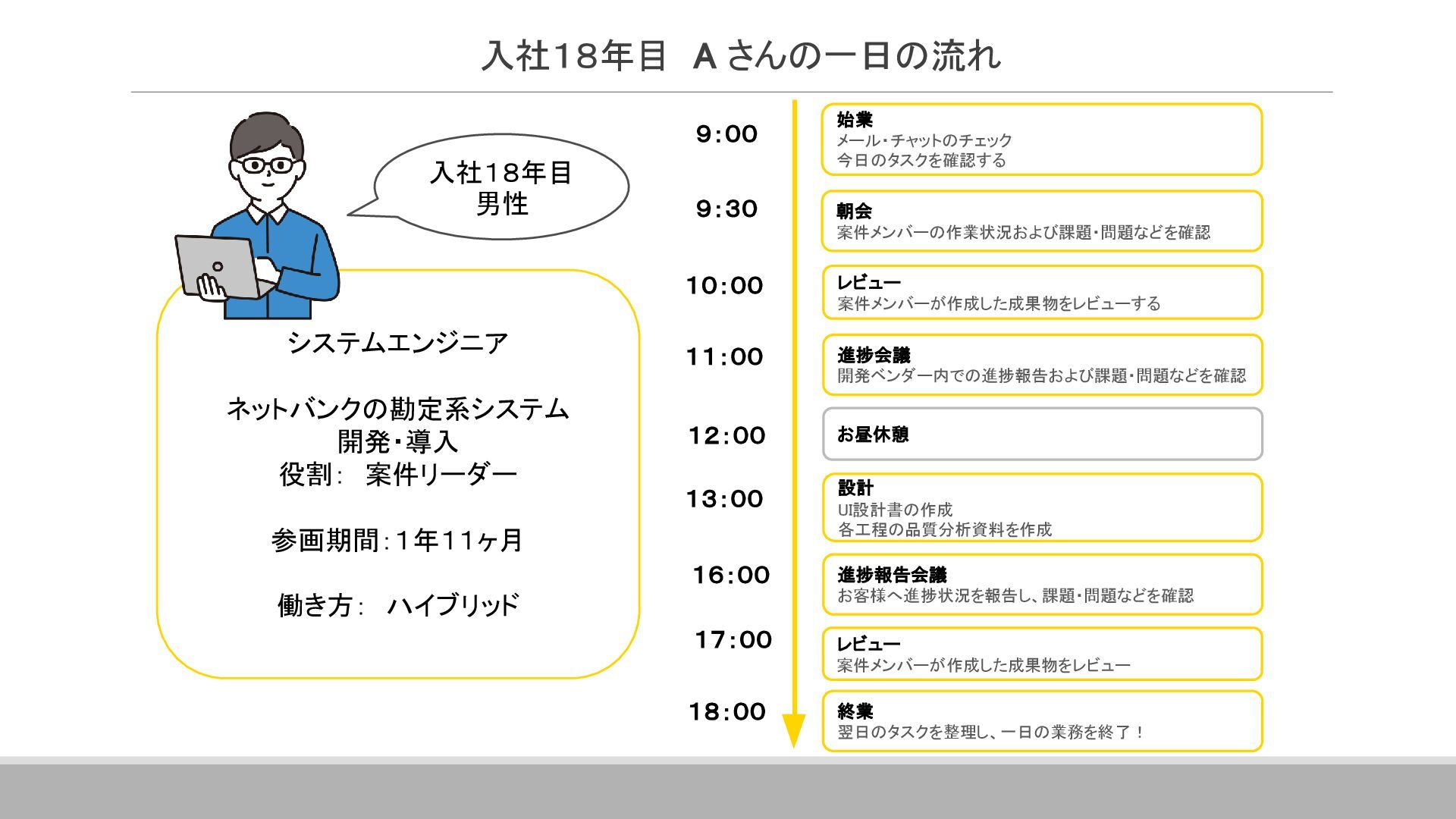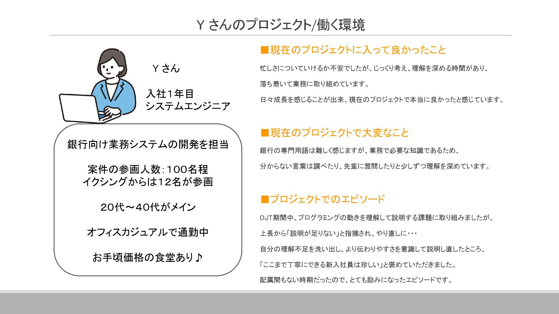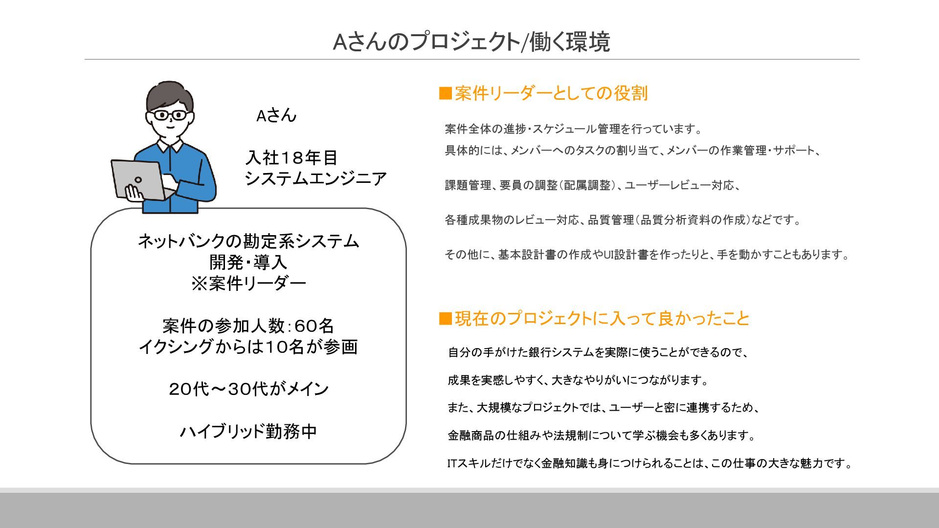 案件全体の進捗・スケジュール管理を行っています。 具体的には、メンバーへのタスクの割り当て、メンバーの作業管理・サポート、 課題管理、要員の調整(配属調整)、ユーザーレビュー対応、 各種成果物のレビュー対応、品質管理(品質分析資料の作成)などです。 その他に、基本設計書の作成やUI設計書を作ったりと、手を動かすこともあります。 ▪現在のプロジェクトに入って良かったこと 自分の手がけた銀行システムを実際に使うことができるので、 成果を実感しやすく、大きなやりがいにつながります。 また、大規模なプロジェクトでは、ユーザーと密に連携するため、 金融商品の仕組みや法規制について学ぶ機会も多くあります。 ITスキルだけでなく金融知識も身につけられることは、この仕事の大きな魅力です。 ネットバンクの勘定系システム 開発・導入 ※案件リーダー 案件の参加人数:60名 イクシングからは10名が参画 20代~30代がメイン ハイブリッド勤務中 Aさん 入社18年目 システムエンジニア Aさんのプロジェクト/働く環境