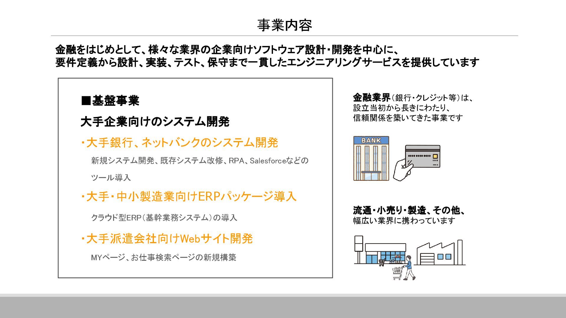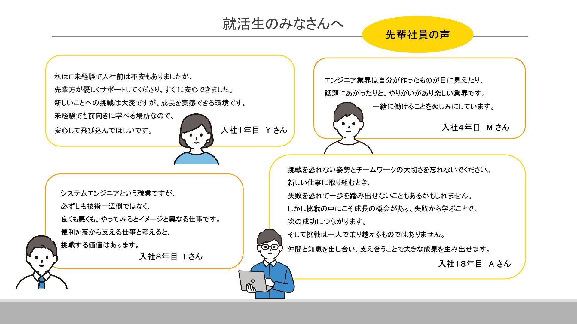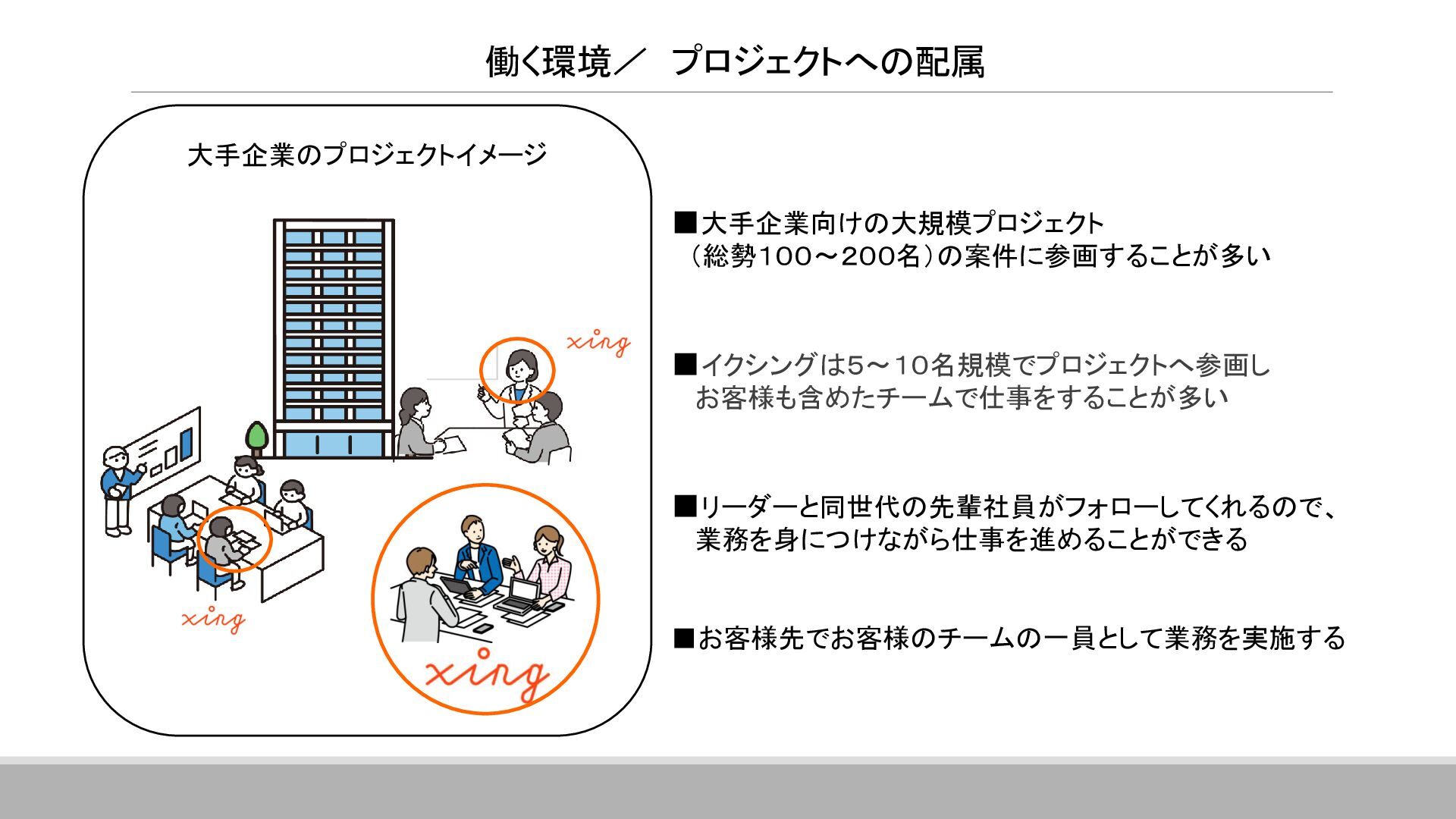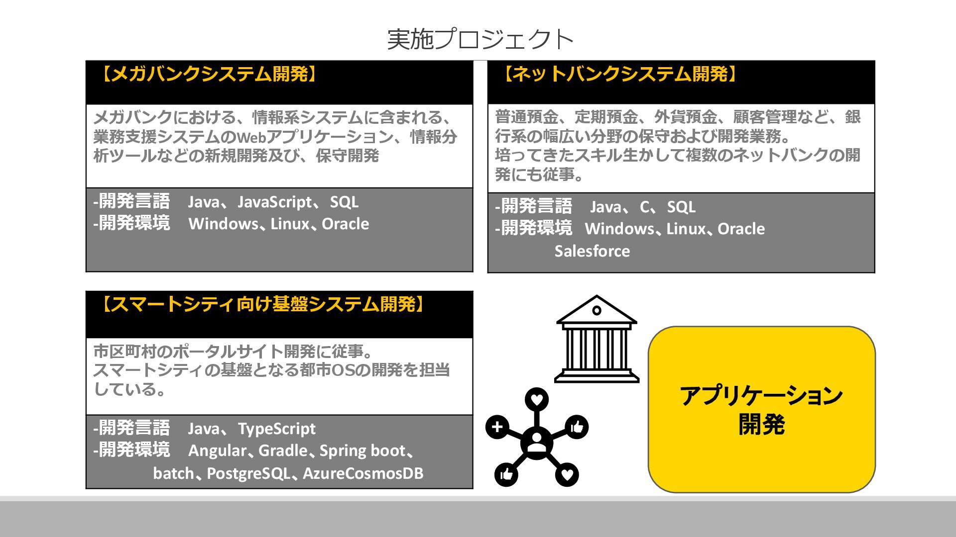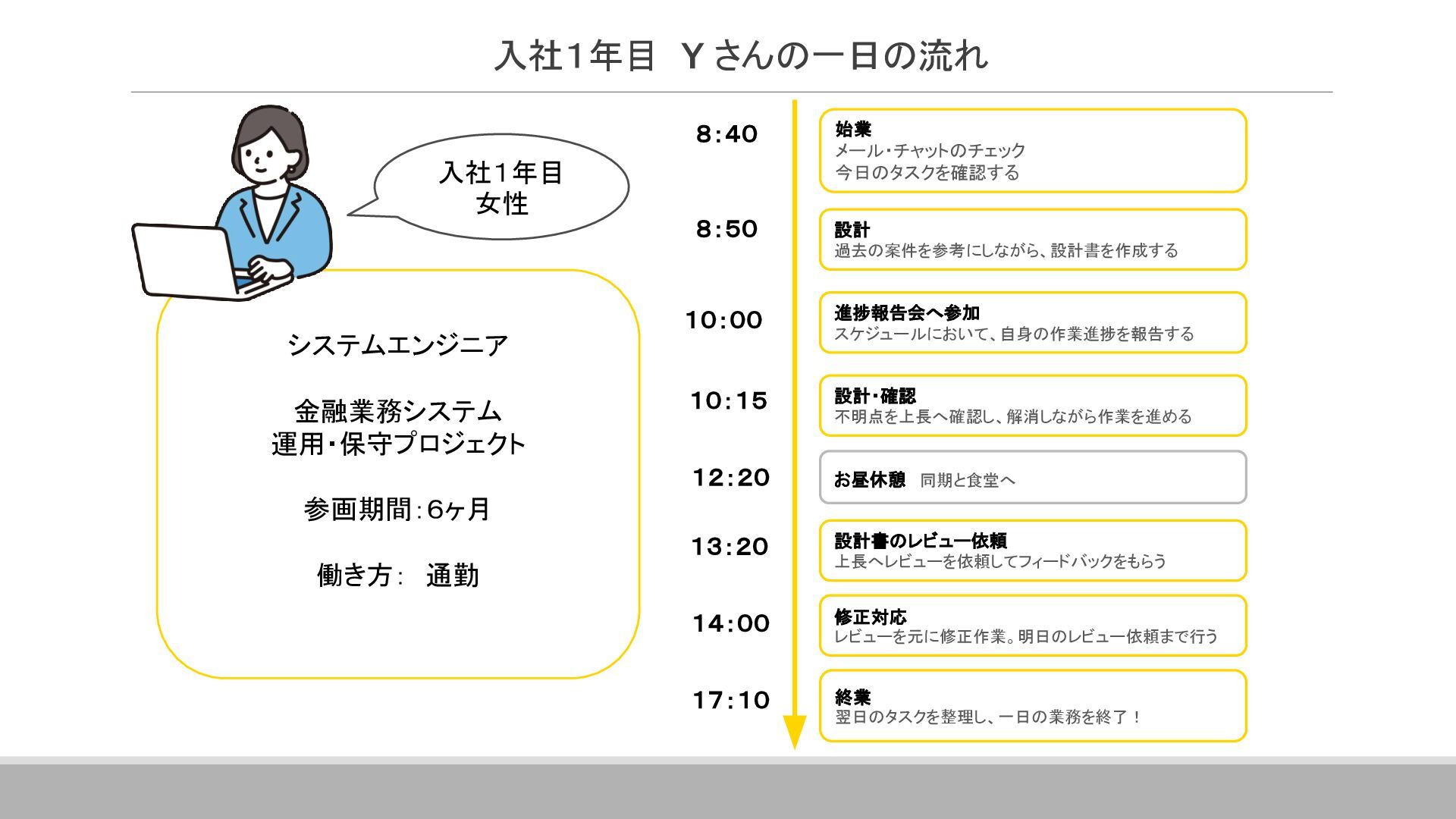 案件全体の進捗・スケジュール管理を行っています。 具体的には、メンバーへのタスクの割り当て、メンバーの作業管理・サポート、 課題管理、要員の調整(配属調整)、ユーザーレビュー対応、 各種成果物のレビュー対応、品質管理(品質分析資料の作成)などです。 その他に、基本設計書の作成やUI設計書を作ったりと、手を動かすこともあります。 ▪現在のプロジェクトに入って良かったこと 自分の手がけた銀行システムを実際に使うことができるので、 成果を実感しやすく、大きなやりがいにつながります。 また、大規模なプロジェクトでは、ユーザーと密に連携するため、 金融商品の仕組みや法規制について学ぶ機会も多くあります。 ITスキルだけでなく金融知識も身につけられることは、この仕事の大きな魅力です。 ネットバンクの勘定系システム 開発・導入 ※案件リーダー 案件の参加人数:60名 イクシングからは10名が参画 20代~30代がメイン ハイブリッド勤務中 Aさん 入社18年目 システムエンジニア Aさんのプロジェクト/働く環境