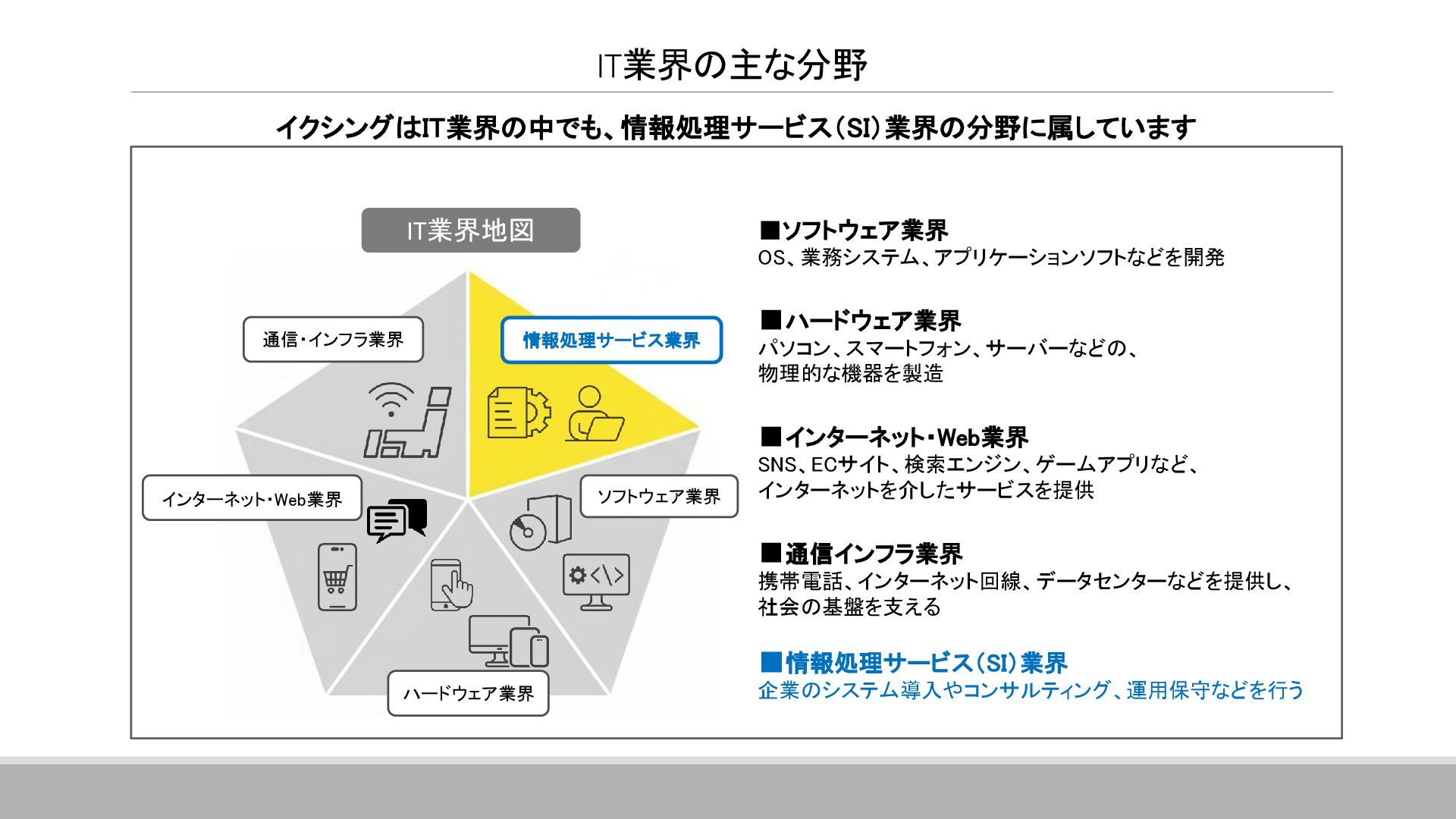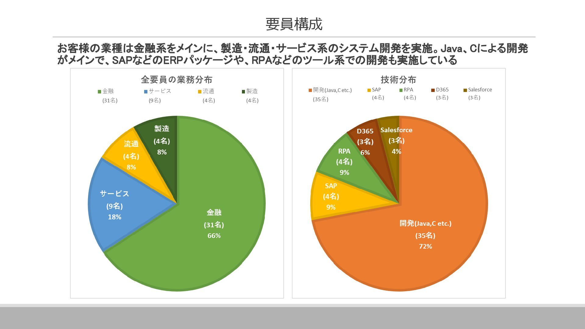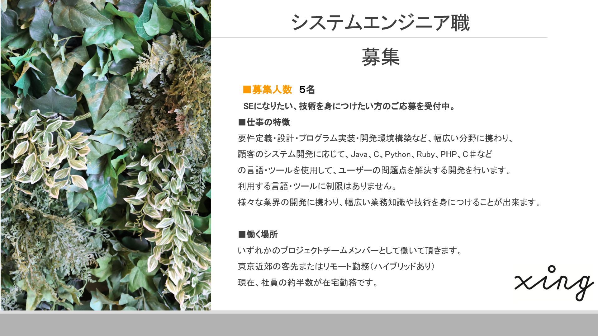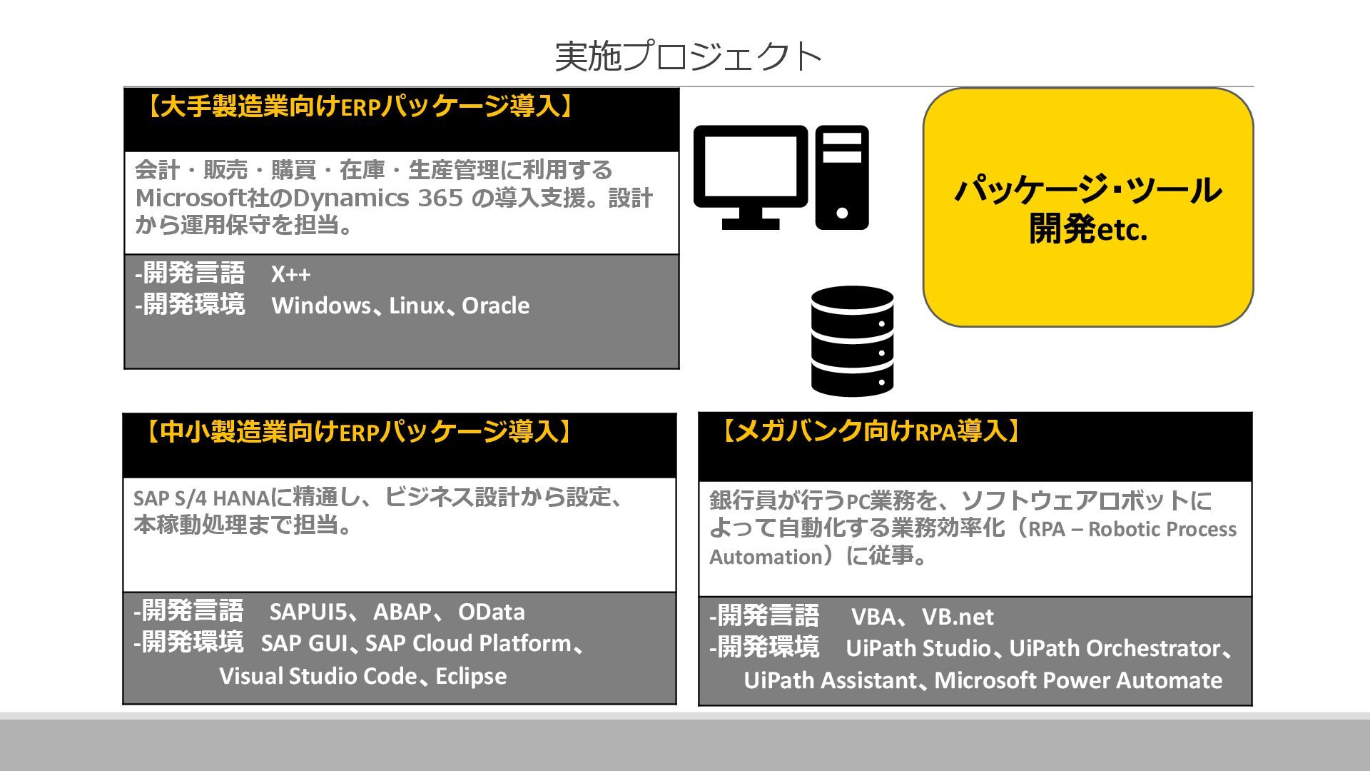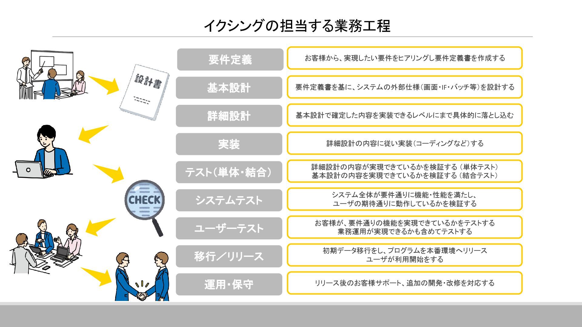 案件全体の進捗・スケジュール管理を行っています。 具体的には、メンバーへのタスクの割り当て、メンバーの作業管理・サポート、 課題管理、要員の調整(配属調整)、ユーザーレビュー対応、 各種成果物のレビュー対応、品質管理(品質分析資料の作成)などです。 その他に、基本設計書の作成やUI設計書を作ったりと、手を動かすこともあります。 ▪現在のプロジェクトに入って良かったこと 自分の手がけた銀行システムを実際に使うことができるので、 成果を実感しやすく、大きなやりがいにつながります。 また、大規模なプロジェクトでは、ユーザーと密に連携するため、 金融商品の仕組みや法規制について学ぶ機会も多くあります。 ITスキルだけでなく金融知識も身につけられることは、この仕事の大きな魅力です。 ネットバンクの勘定系システム 開発・導入 ※案件リーダー 案件の参加人数:60名 イクシングからは10名が参画 20代~30代がメイン ハイブリッド勤務中 Aさん 入社18年目 システムエンジニア Aさんのプロジェクト/働く環境